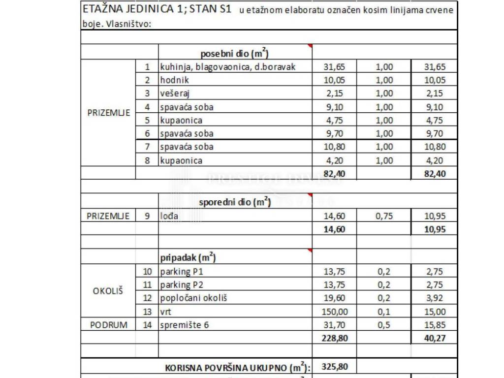 Apartment amenities: Two parking spaces (P1 and P2), each with an area of 13.75 m² (net value 2.75 m² per place) Paved area - 19.60 m² (net value 3.92 m²) Garden - 150.00 m² (net value 15.00 m²) Basement storage - 13.30 m² (net value 5.85 m²) Total usable area of the apartment with accessories: 325.80 m² Total usable area value: 133.62 m²
