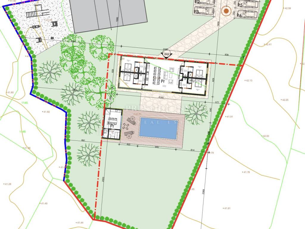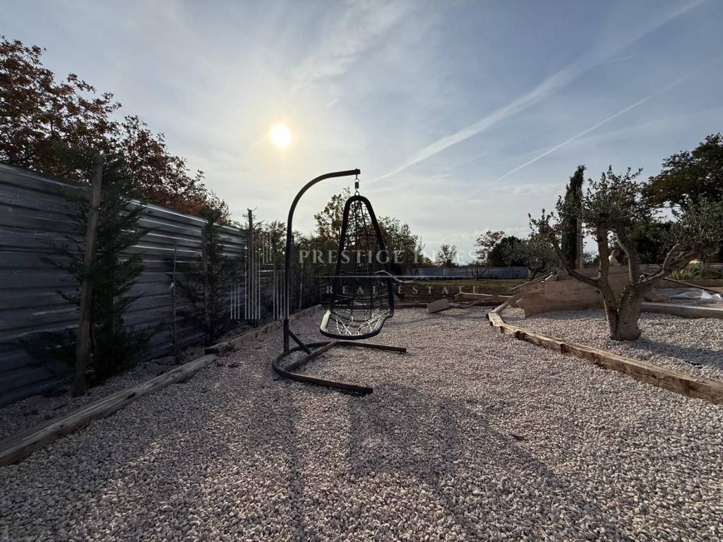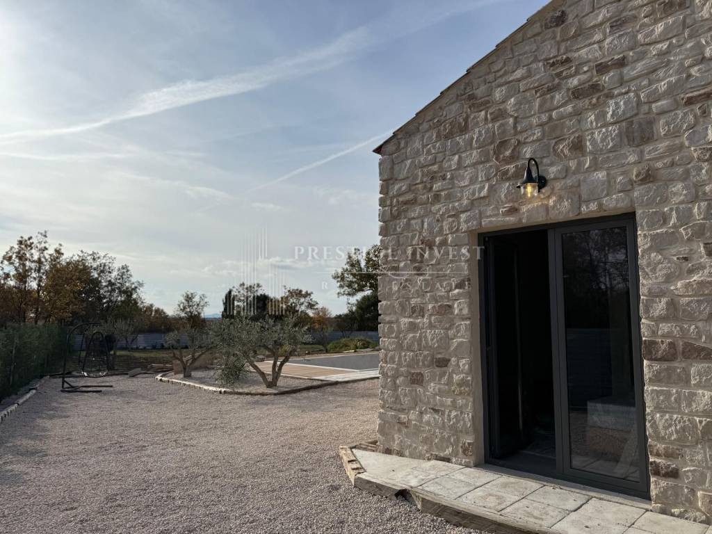 The environment is fully landscaped: Rustikkamen concrete slabs Travertino 40×60 in beige — the look of old Istrian stone.