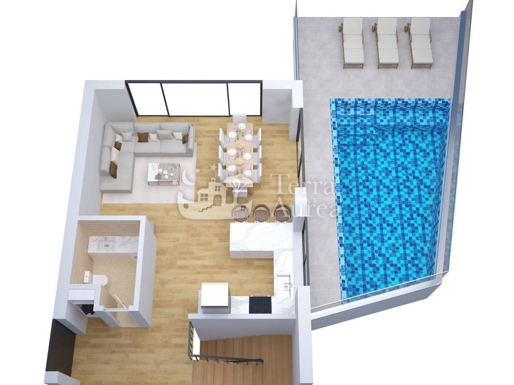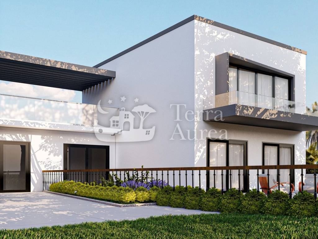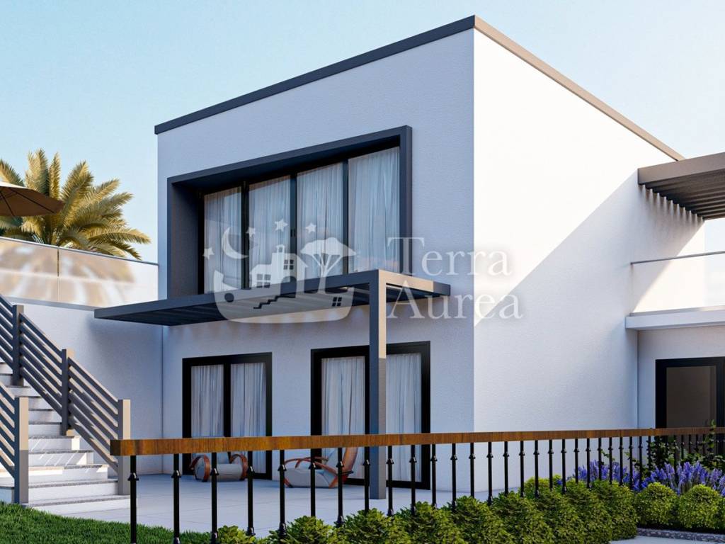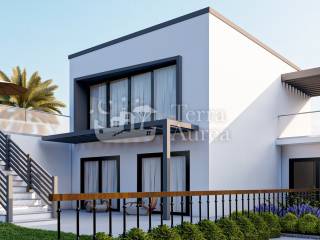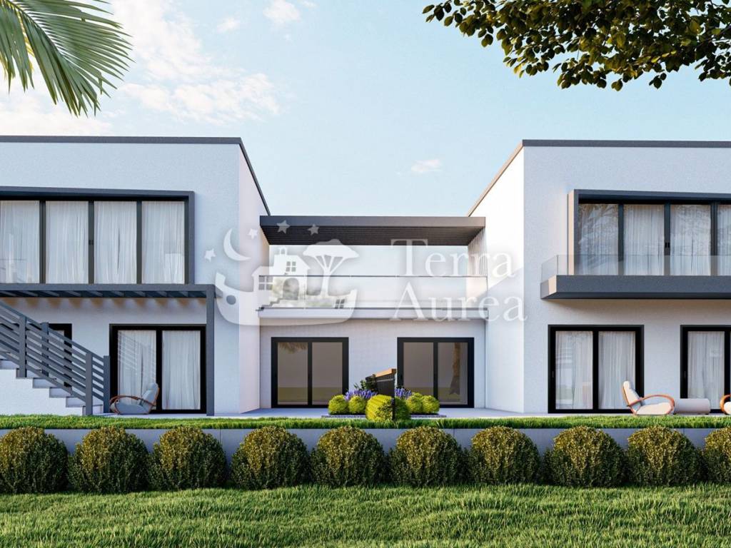 Semi-detached house is for sale in the quiet village of Brzac on the island of Krk. According to the project, a total of four villas are being built, which will have a beautiful view of the sea and the island of Cres. This villa has a total area of 146 m2 and consists of ground floor, first floor and roof terrace. The ground floor has three bedrooms, two bathrooms, storage room and hallway and internal stairs leading upstairs. Upstairs there is a living room with kitchen, toilet and hallway. Internal stairs continue to the roof where there is a roof terrace of 33 m2 with a jacuzzi and a unique view of the sea. This villa has an outdoor pool of 24.5 m2 and two parking spaces, as well as a beautiful garden. Only the highest quality materials are used in the construction, first-class ceramics and sanitary ware will be installed, as well as carpentry.