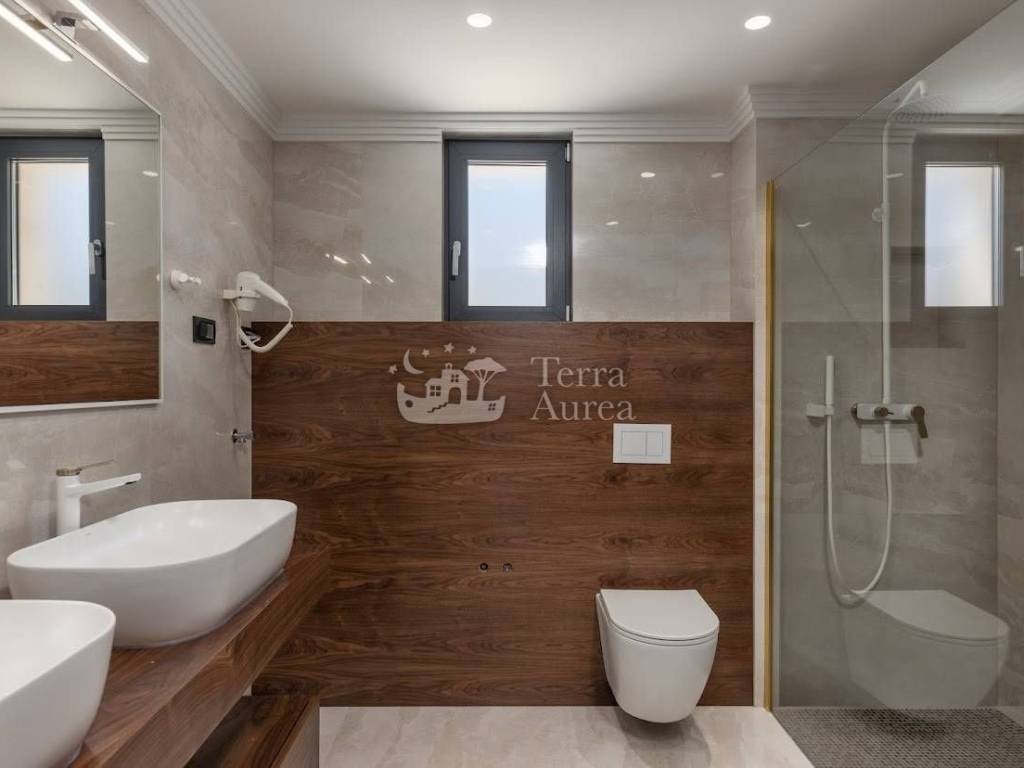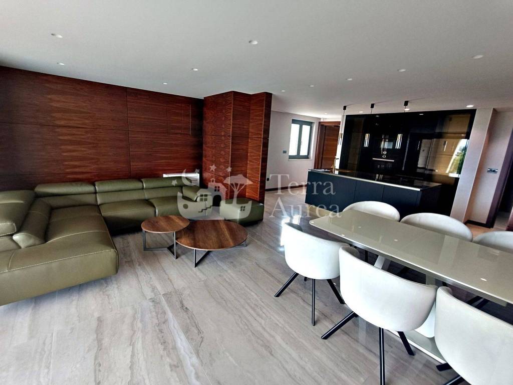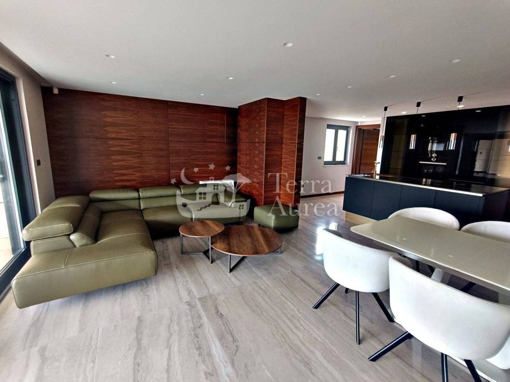 The whole apartment is adorned with large sliding rocks, the floors are covered with high quality porcelain ceramics, while the suspended ceilings with built-in lighting create a relaxing atmosphere. The front door of the apartment is anti-burglary, by the Italian manufacturer Diere, as well as the room door made of quality walnut wood from the same manufacturer. The bathrooms are equipped with state-of-the-art equipment and sanitary ware in a combination of wood and ceramics.