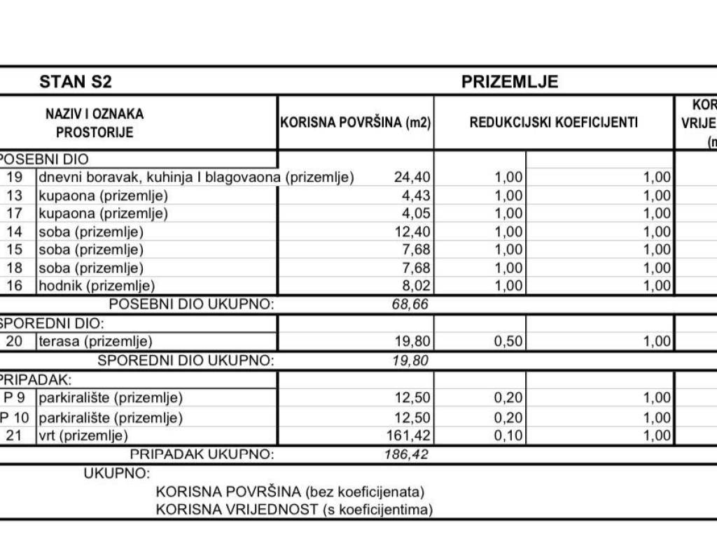 Apartment S2 is for sale on the ground floor of a newly built residential building located in the settlement of Srima near Vodice. The apartment has a total area of 99.70 m² and consists of a kitchen connected to the dining and living room, a hallway, three bedrooms, two bathrooms, and a covered terrace of 19.80 m². The apartment includes a spacious garden of 161.42 m², as well as two parking spaces marked P9 and P10. The building is being constructed according to the latest construction standards, with a strong emphasis on the quality of workmanship and materials – top-quality windows, ceramics, and sanitary ware will be installed. The location is highly suitable for living or vacation, with the beach only 350 meters away. The building is scheduled for completion in 2026, and the buyer is exempt from paying real estate transfer tax.