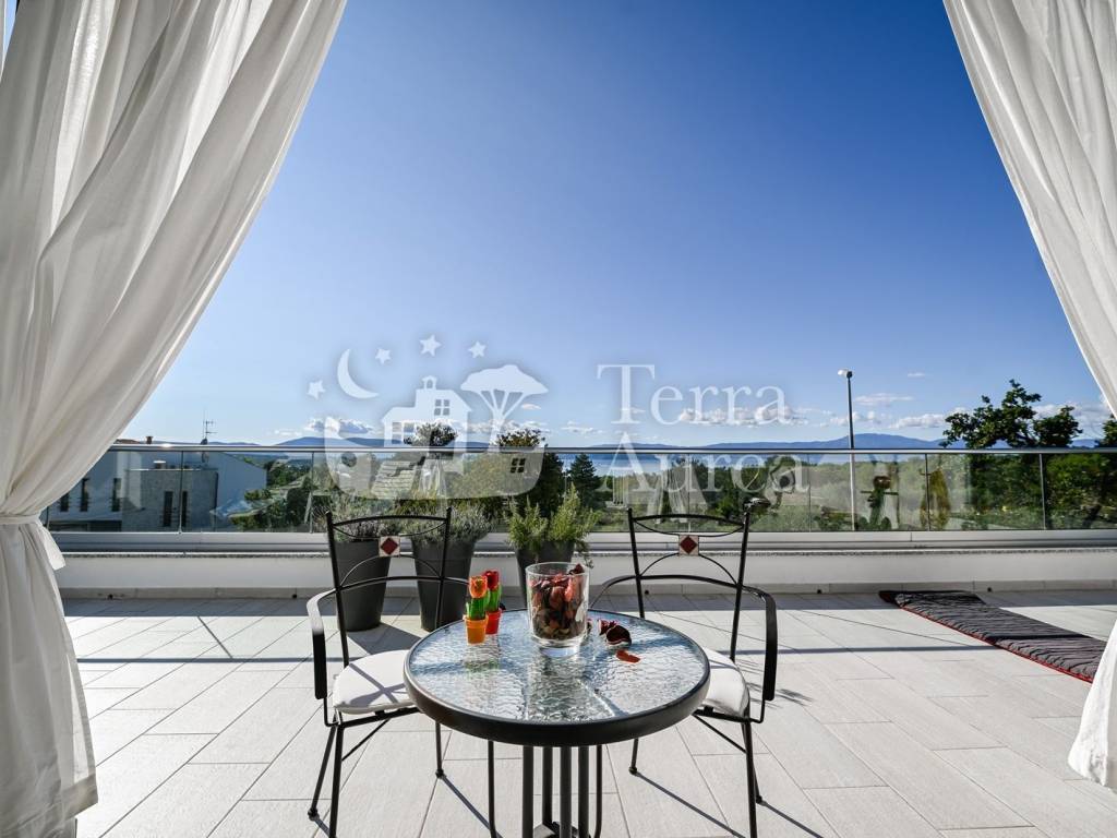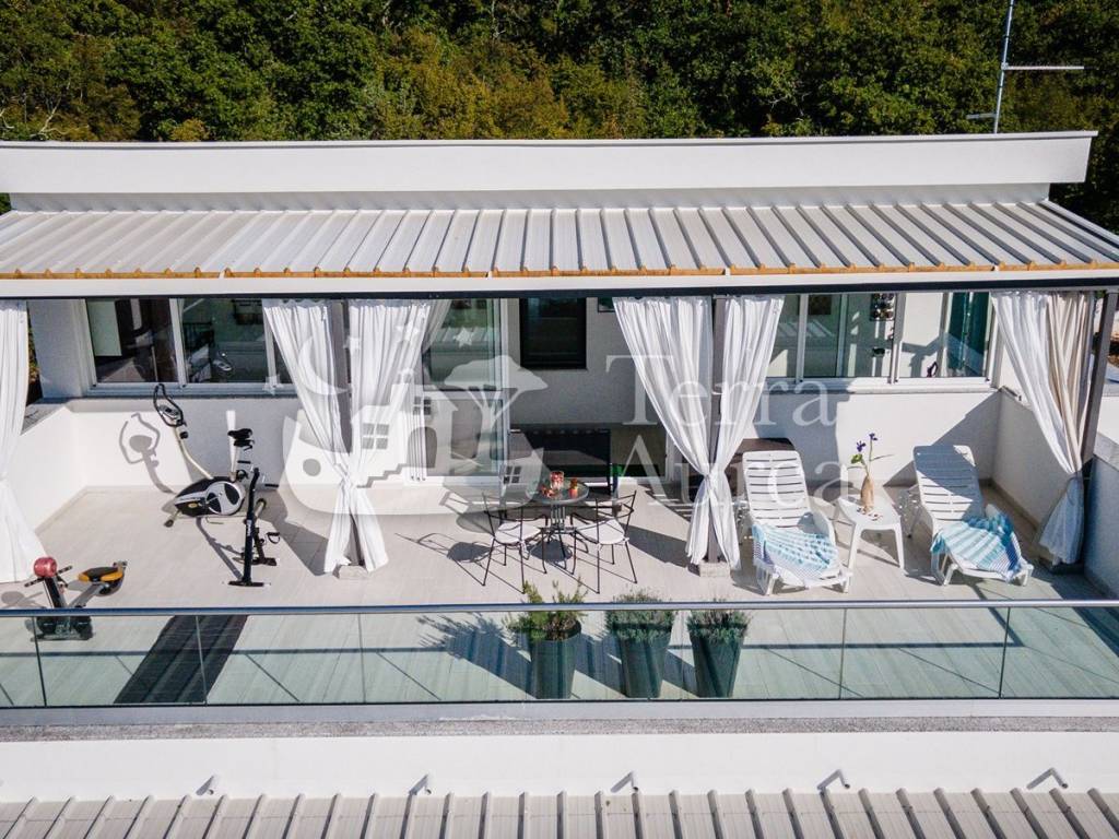 On the first floor, there are two bedrooms, each with its own bathroom. The first floor is largely decorated with a loggia with a kitchenette and access to a spacious terrace with a unique view of the sea and the surrounding area.