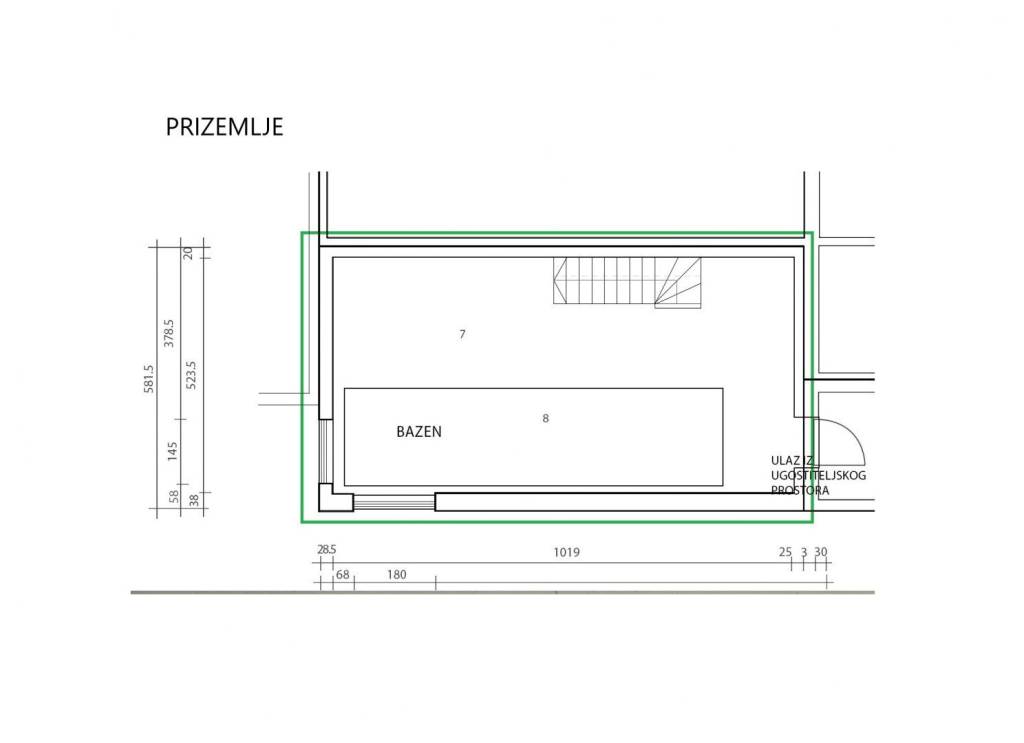 Na gornjoj etaži se nalazi grijani bazen koji se može u potpunosti prekriti i prostor koristiti za evente, edukacije i sl.