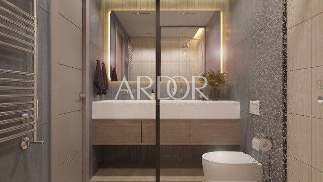 Apartments are equipped with Daikin heat pump systems for heating and cooling, fan coil systems, full underfloor heating, and triple-glazed aluminum joinery with glass walls up to 7.5 meters wide. Premium parquet flooring is used throughout, and bathrooms are finished with top-quality Italian ceramics.