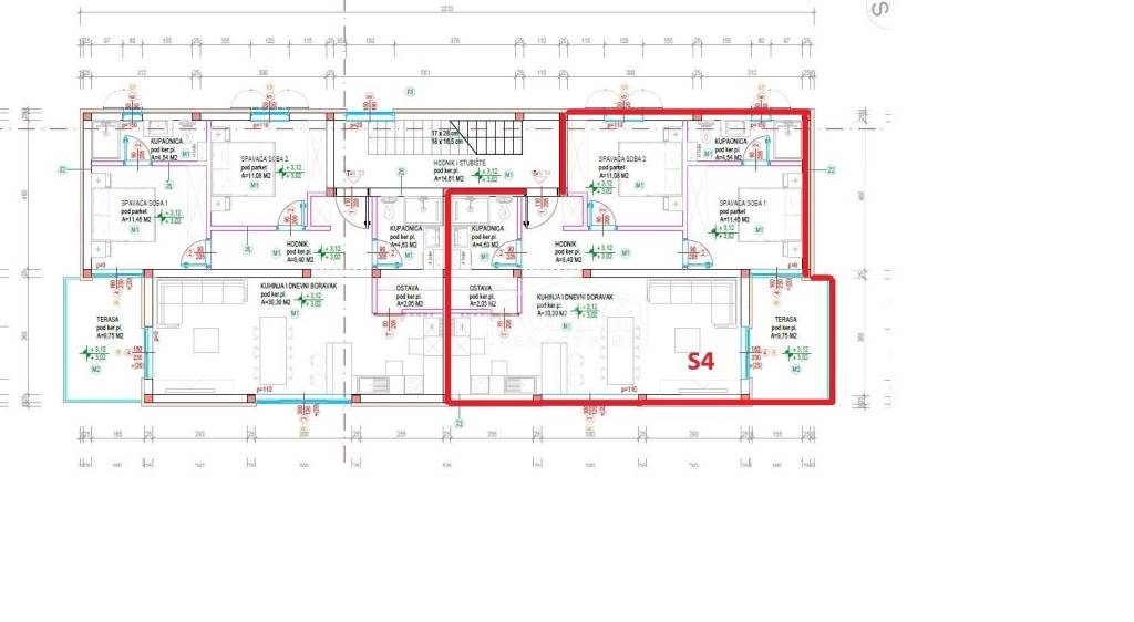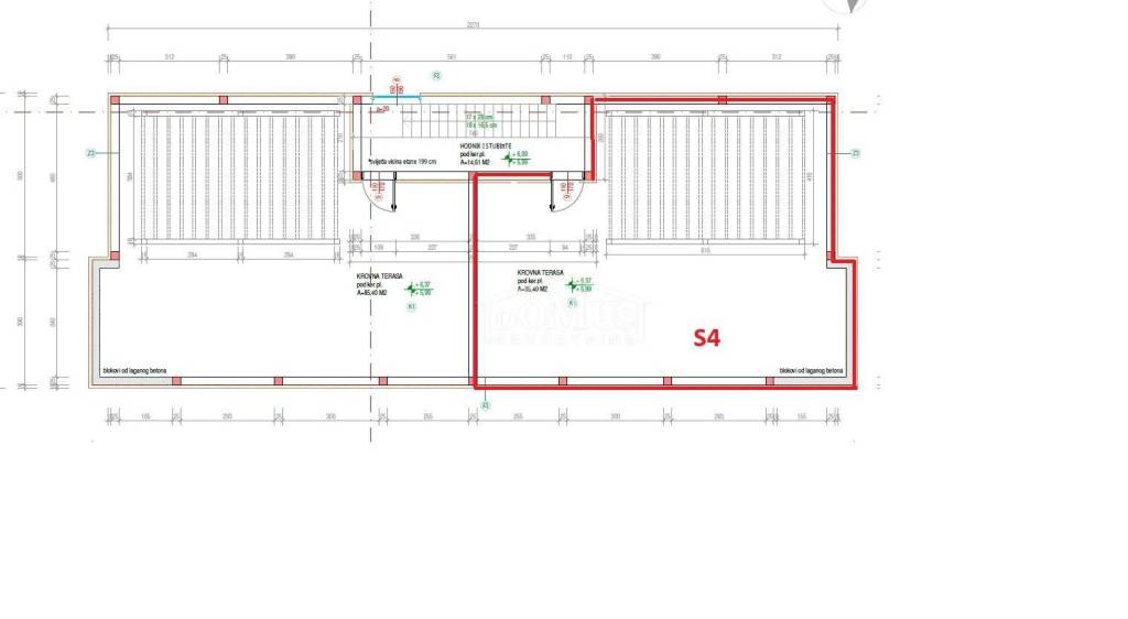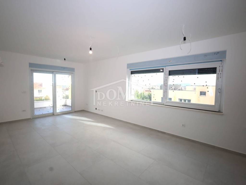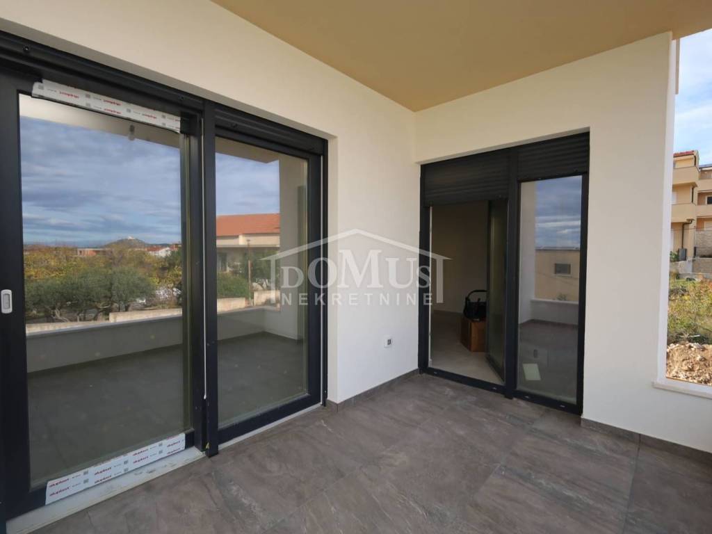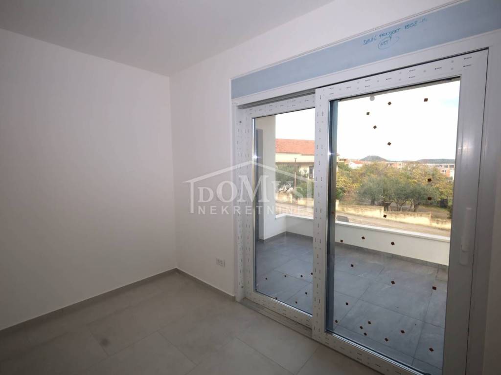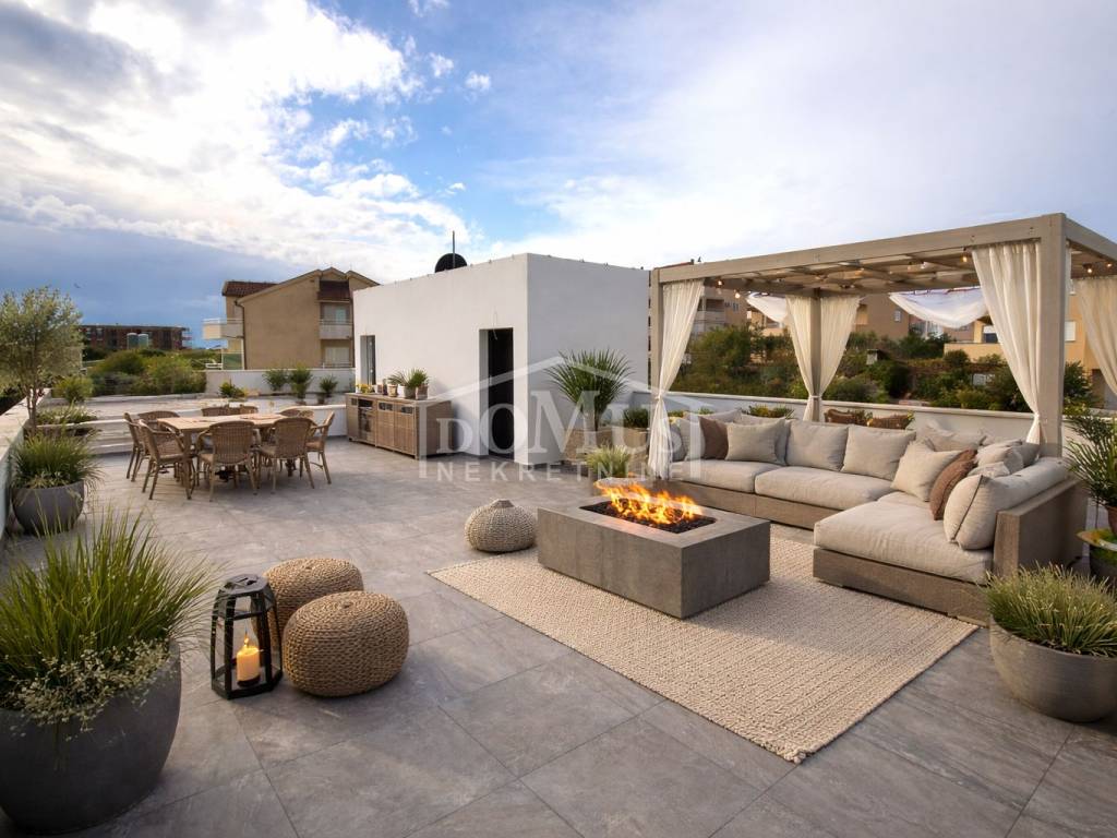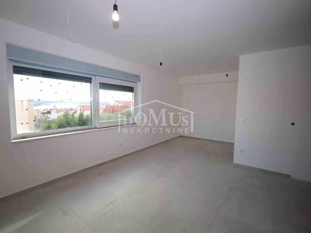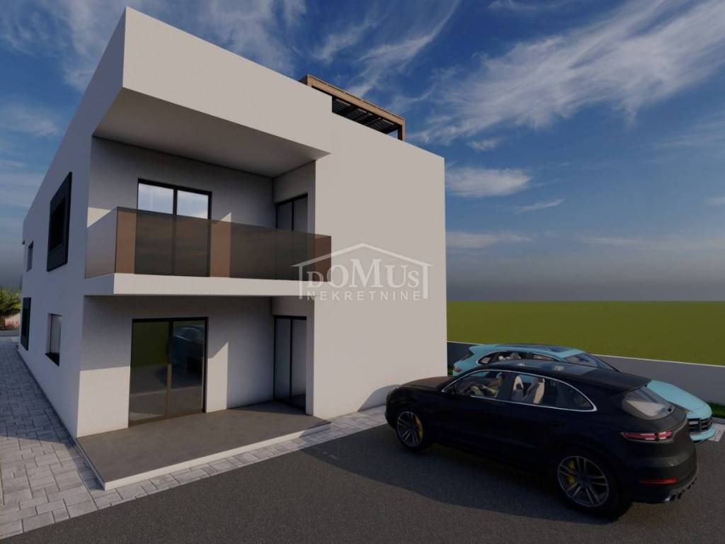 Vodice, new construction, attractive location, comfortable two-bedroom apartment on the 1st floor. Apartment S4 is located in a small residential building with a total of 4 apartments, featuring a modern design and functional layout with a total of 99.42 m² of usable space and a sea view. The apartment consists of a spacious kitchen with dining and living area, hallway, two bedrooms, one of which has an en-suite bathroom, plus an additional separate bathroom, storage room, covered terrace of 9.75 m², and a roof terrace of 85.40 m² with electrical installation and water connections for a summer kitchen and jacuzzi. It is equipped with high-quality materials: modern ceramics and sanitary fixtures, underfloor heating throughout the apartment, triple-glazed windows, electric roller shutters, and air conditioning in the living room and all bedrooms. The apartment includes two parking spaces. It is located 1,200 m from Plava Beach and 700 m from the center of Vodice.