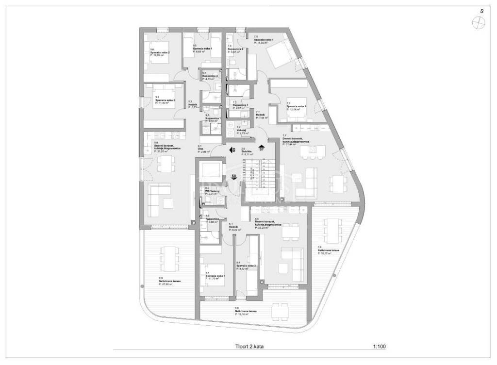 Residential unit "S8" is located on the 2nd floor of the building, facing south and offers a sea view. It has a usable area of 78.82 m². The apartment consists of an entrance hall, one bathroom, two bedrooms, laundry room/WC, kitchen with dining room and living room with access to a covered terrace. The apartment has one outdoor parking space. The building is located only 150 m from the beach and 700 m from the city center and all important facilities.