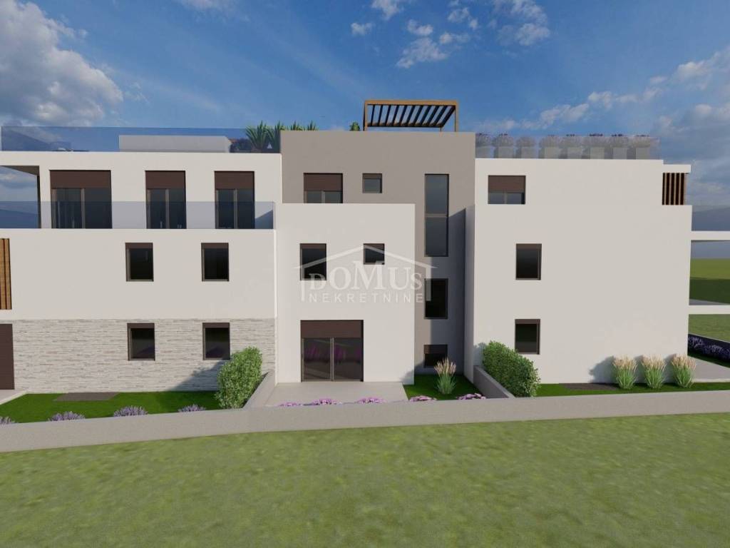 Vodice, near the “Hangar” beach, there is located a newly built luxury residential building in the unfinished phase with 12 residential units. The building has a total of three floors: ground floor, 1st floor and 2nd floor. The building is modernly decorated with underfloor heating in the bathrooms and living room, high-quality floors and interior decoration, air conditioning in each room, and electric shutters. The expected move-in date is 01.07.2026. The price of the apartments includes VAT. The buyer does not pay real estate tax when purchasing. The residential unit "S6" is located on the 1st floor of the building and has a usable area of 114.13 m2. The apartment consists of an entrance hall, bathroom, two bedrooms, a spacious master bedroom with a wardrobe and private bathroom, a kitchen with a dining room and a living room with access to a partially covered terrace. The apartment has one garage space. The building is located only 150 m from the beach and 450 m from the city center and all important amenities. Another residential unit is also available in this building: FLAT A1 FLAT S2 FLAT S3 FLAT S4 FLAT S5 FLAT S7 FLAT S8