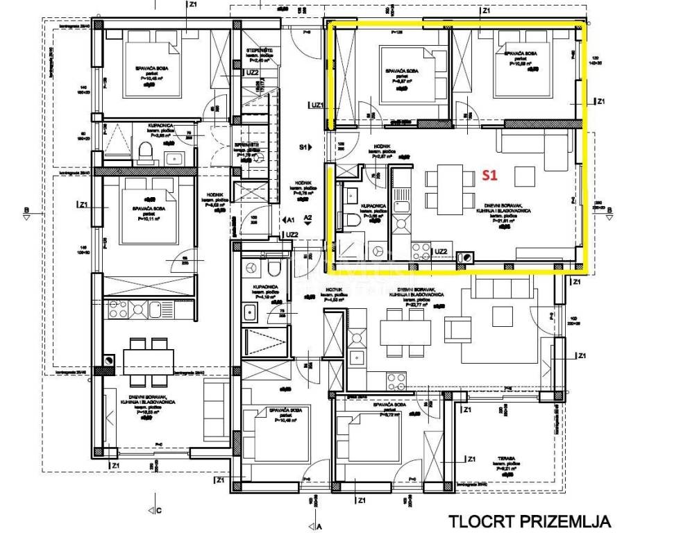 Residential unit "S1" is located on the ground floor of the building and has a usable area of 67.89 m2. The apartment consists of an entrance hall, bathroom, two bedrooms and a kitchen with a dining area and living room with access to a terrace of 13.34 m2. The apartment has a garden of 13 m2 and one parking space. The building is located 800 m from the beach and 900 m from the city center and all-important amenities.