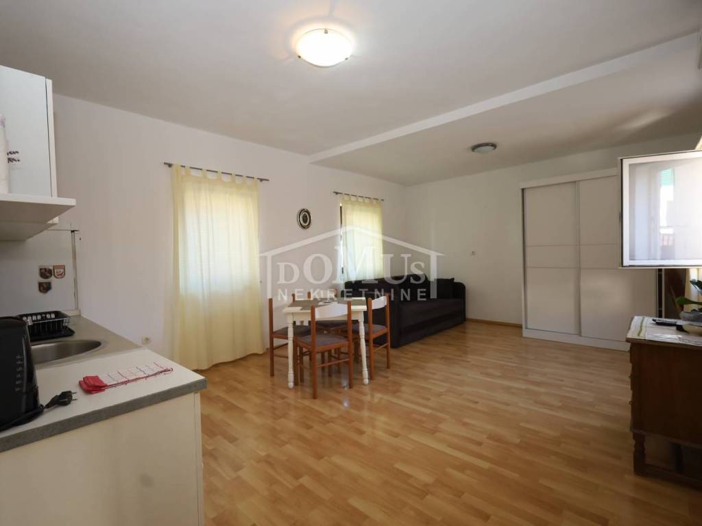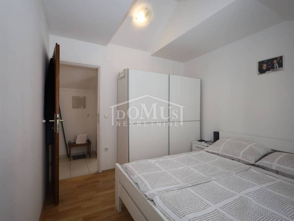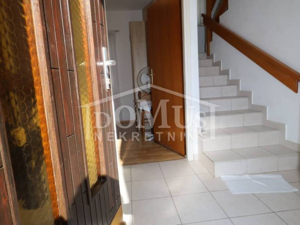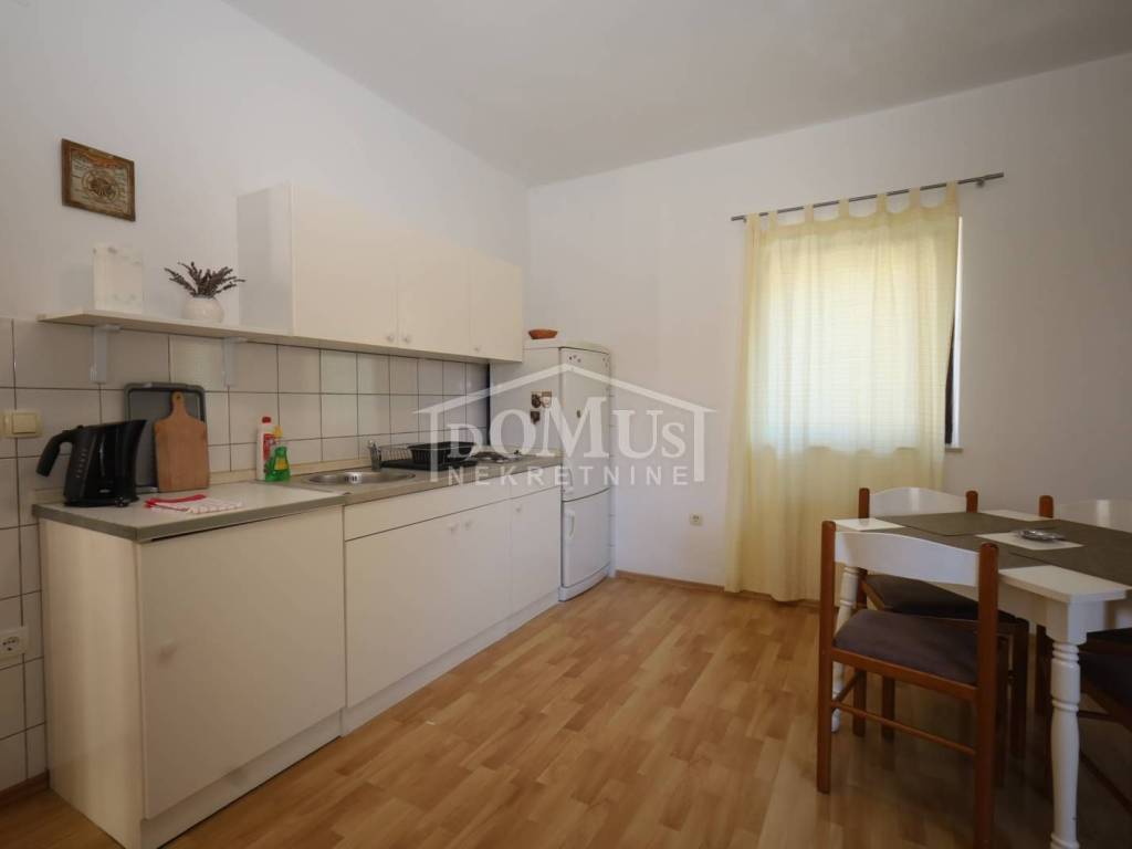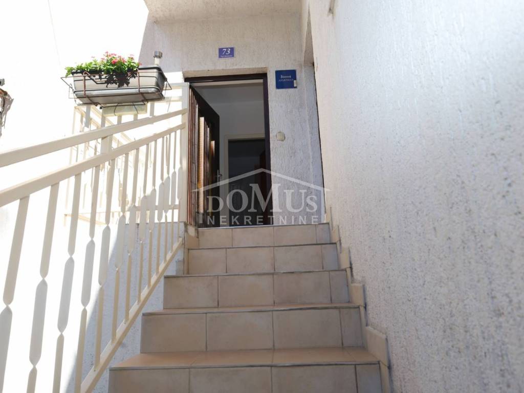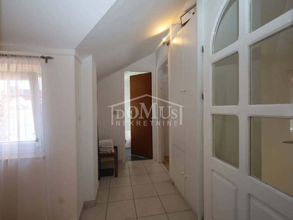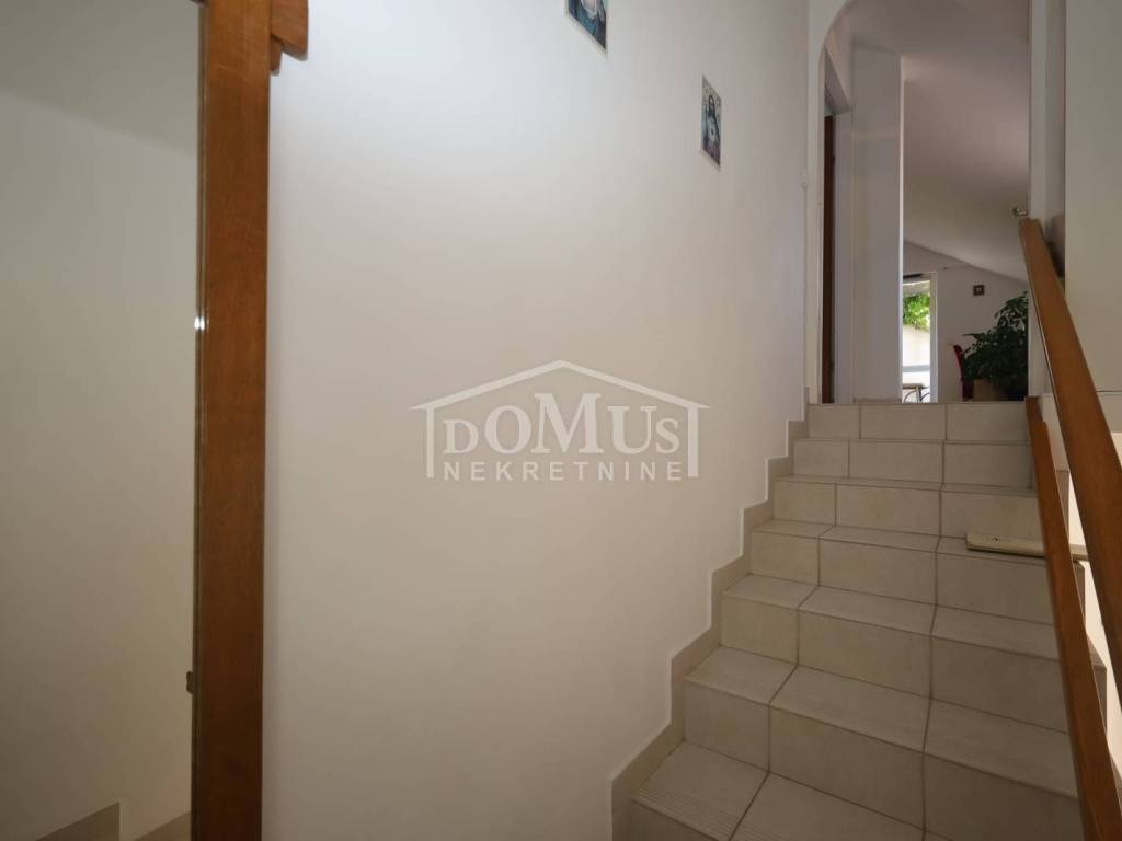 External stairs lead to the first floor, where there is a separate entrance to a one-bedroom apartment. On the first floor, there is also an entrance to the second duplex apartment (first floor and attic), which on the first floor consists of a hallway, bathroom, and one bedroom. Internal stairs lead to the attic, where there is one bedroom, bathroom, hallway, kitchen with dining area, and living room with access to an 11 m² terrace offering a sea view. The house is suitable for living, tourism, or renting. It is fully furnished and ready to move in immediately.