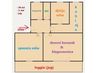 The apartment itself is 58.50 m2 in size, and consists of 2 bedrooms, kitchen, living room, pantry, bathroom, toilet, hallway and two loggias.