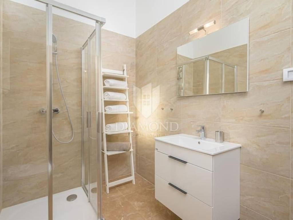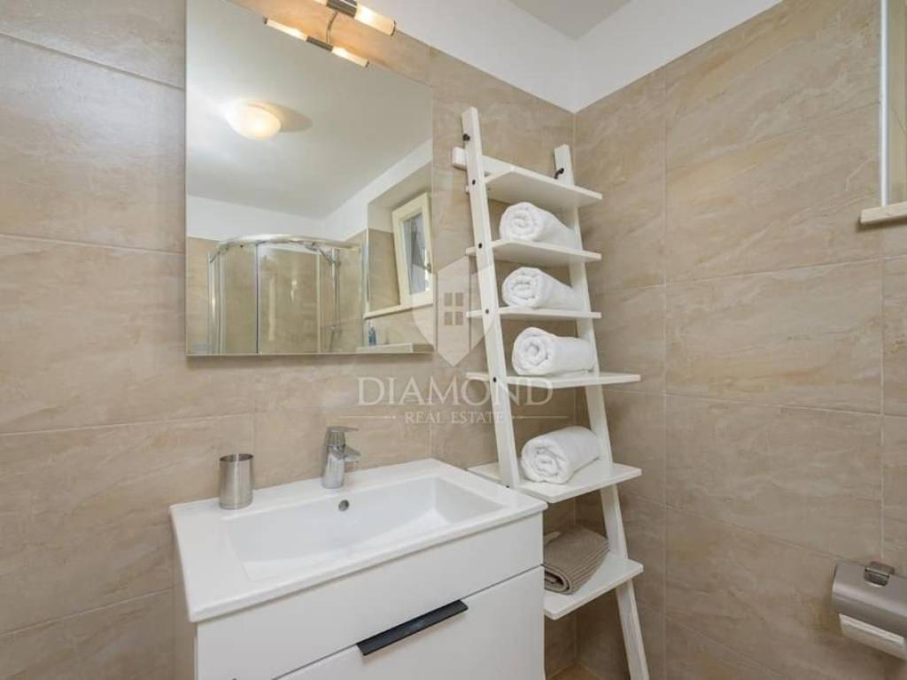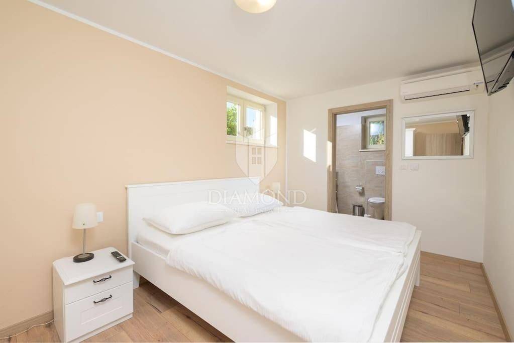 On the ground floor there is a spacious living room with a fireplace, a modern kitchen, a dining room, one bedroom with its own bathroom and an additional separate bathroom. On the first floor there are two bedrooms, each with its own bathroom, and two large terraces with a beautiful view of the sea. In the basement there is an additional bedroom with a bathroom, ideal for guests or family members.
