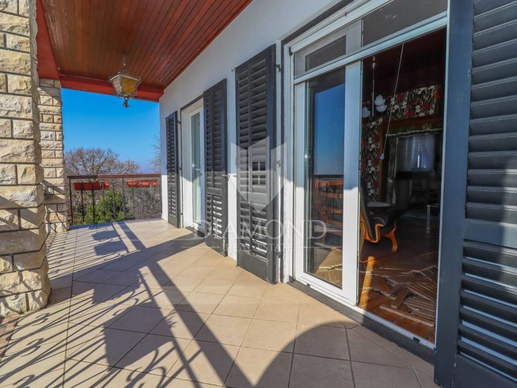 The house is spread over two floors, a high ground floor and a first floor. On the ground floor, there is a long hallway that leads to all the necessary rooms and is directly connected to the garage, so the house can be entered from the garage as well as from the outside. There is also a living room with a beautiful stone-clad fireplace and a covered terrace, a kitchen with a dining room, two bedrooms, and a bathroom. A spacious internal staircase leads to the first floor, which is laid out like the ground floor. Living room, kitchen and dining room, three bedrooms, bathroom, and additional living room or social room. Gas central heating is installed throughout the house. The great thing about all these rooms is that on the sunny side, the living rooms and bedrooms have their own terraces.