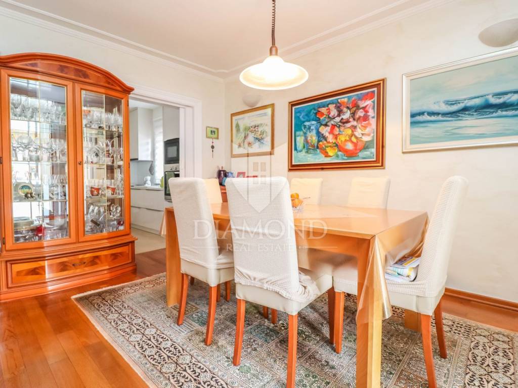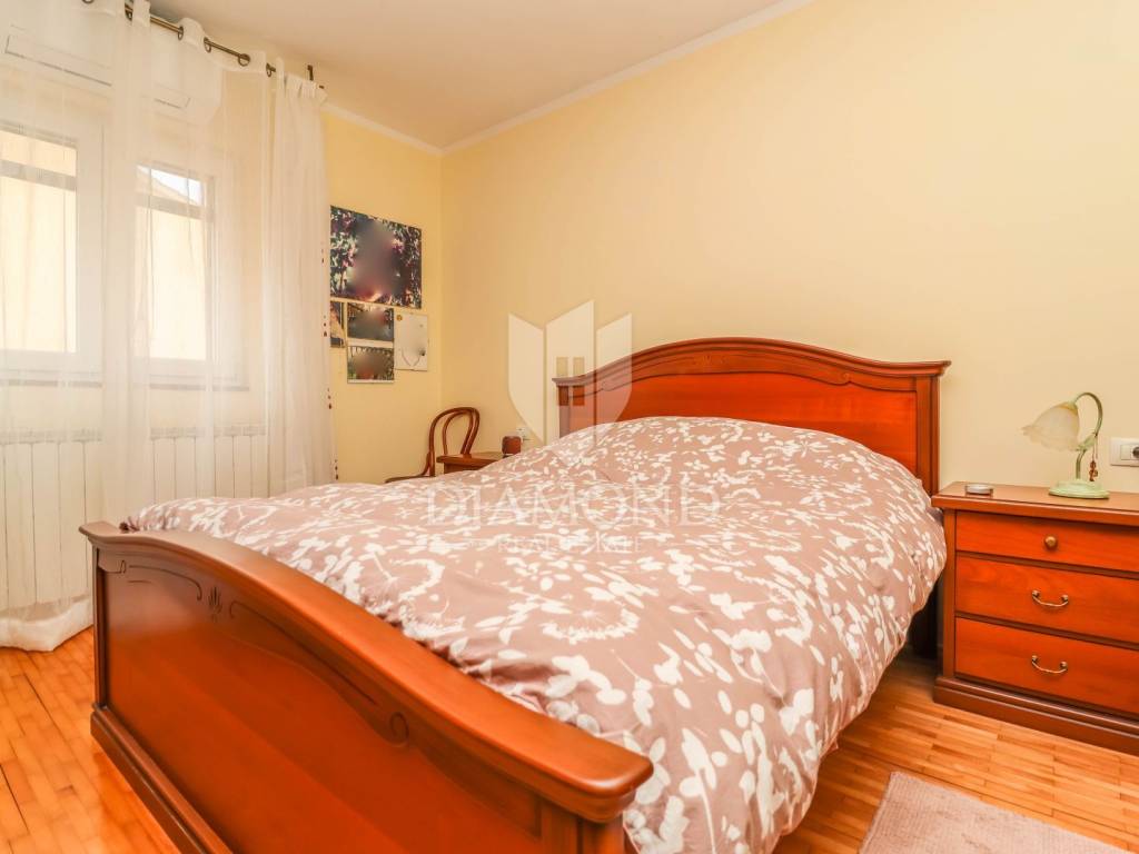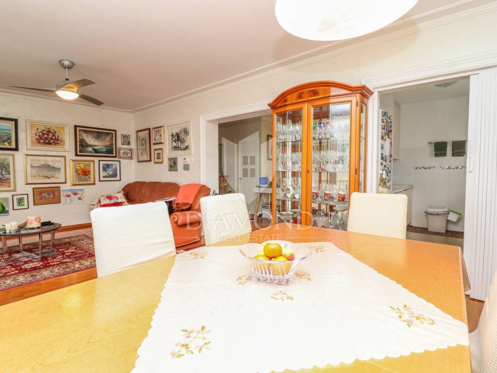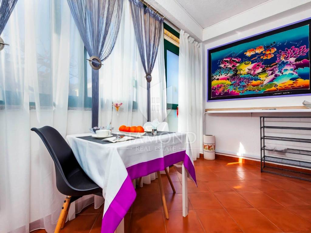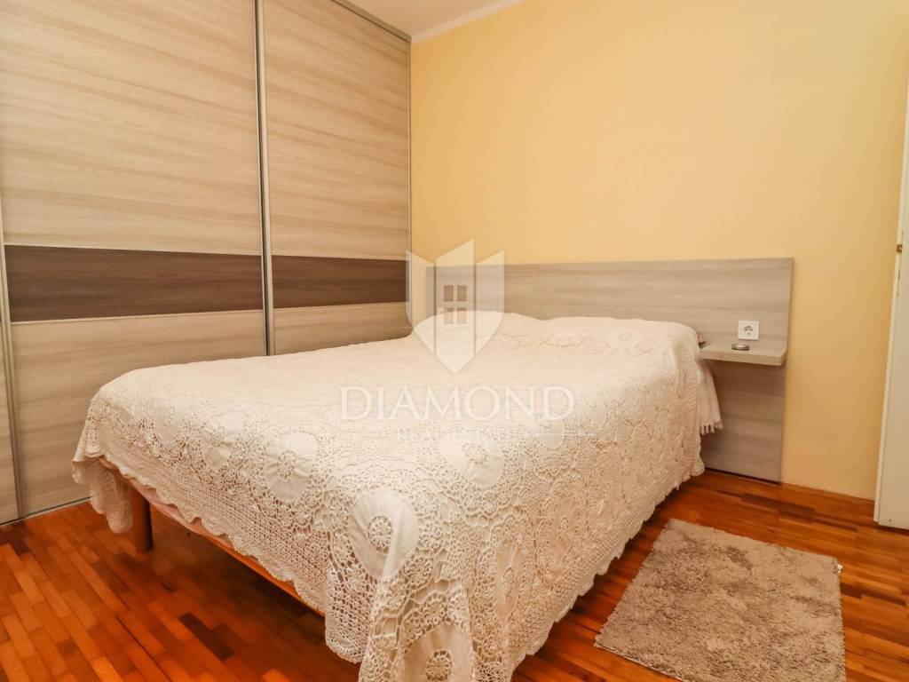 The family apartment is located on the first floor and consists of an entrance hall, a spacious living room, a newly renovated kitchen with a dining room, two bedrooms, a bathroom and a storage room. One bedroom has a closed loggia with a glass wall to let the sunlight shine into the room. For cooling in the summer months, there are as many as three air conditioners, and the apartment is also equipped with oil central heating. The bathroom is additionally equipped with electric underfloor heating.