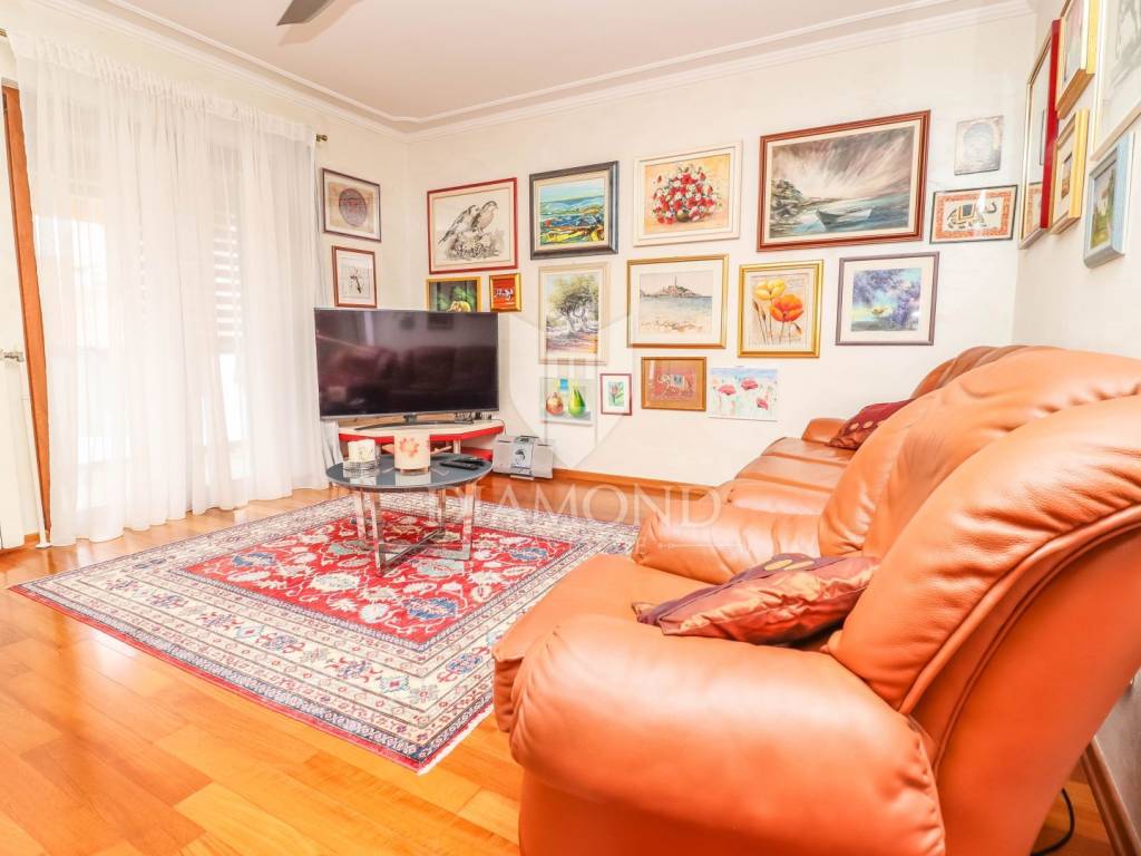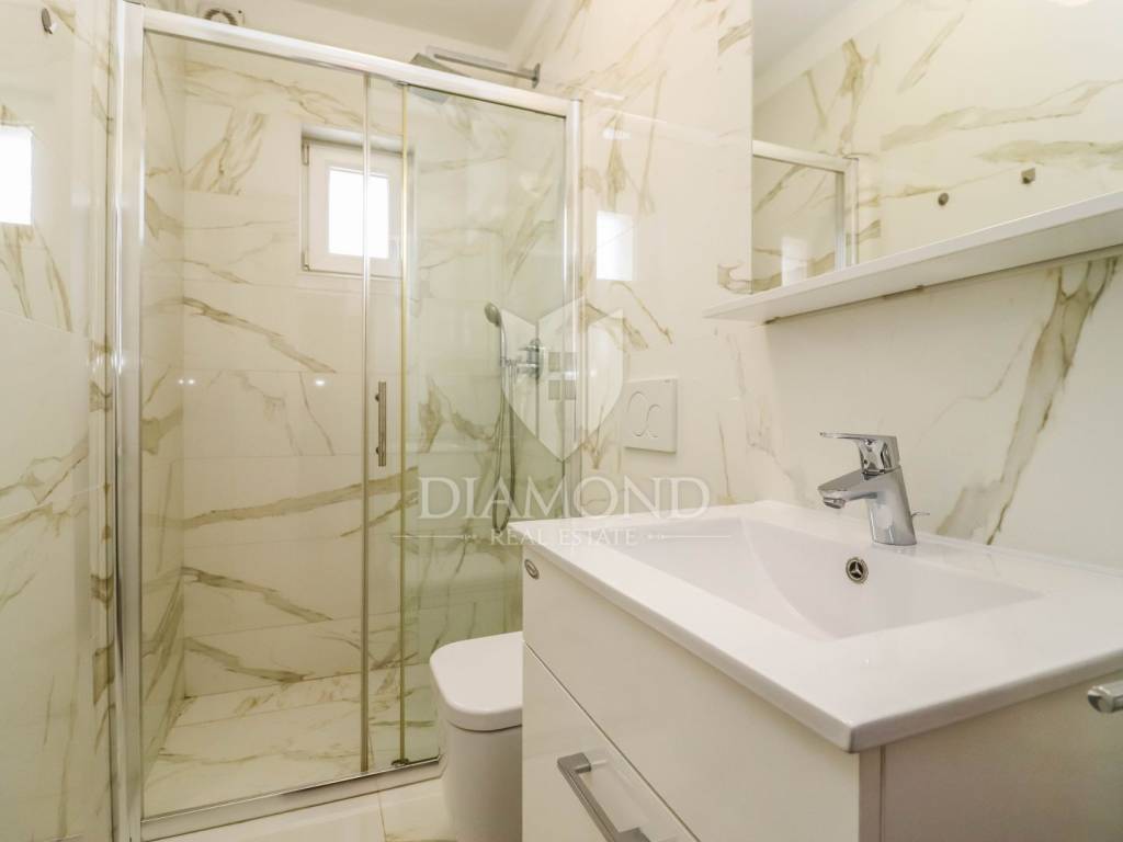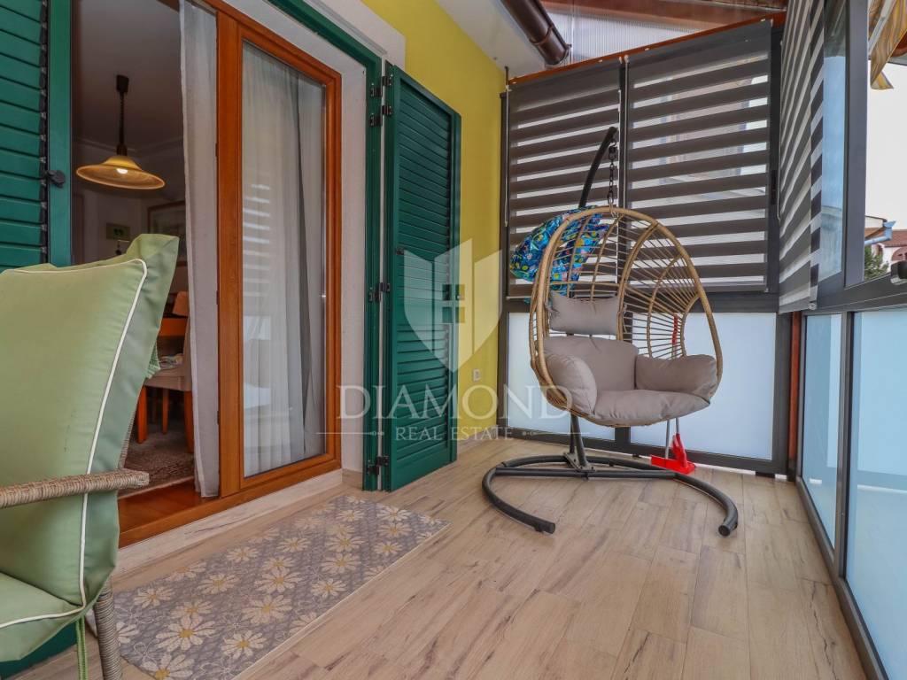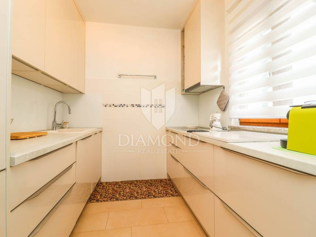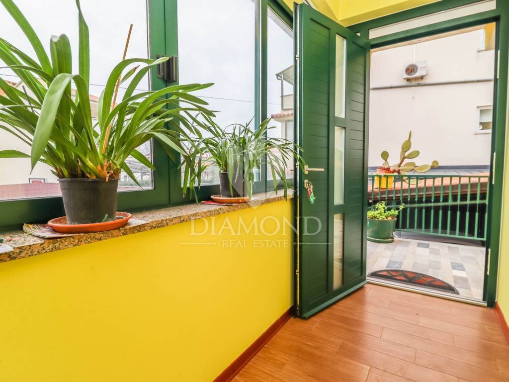 The family apartment is located on the first floor and consists of an entrance hall, a spacious living room, a newly renovated kitchen with a dining room, two bedrooms, a bathroom and a storage room. One bedroom has a closed loggia with a glass wall to let the sunlight shine into the room. For cooling in the summer months, there are as many as three air conditioners, and the apartment is also equipped with oil central heating. The bathroom is additionally equipped with electric underfloor heating.