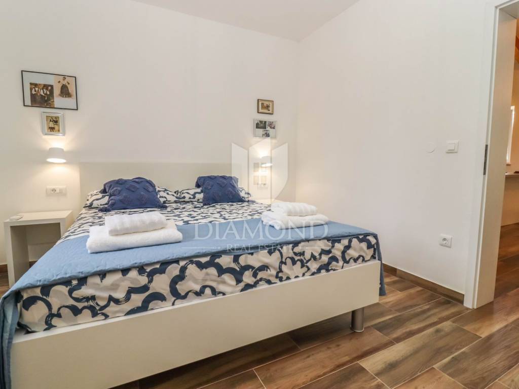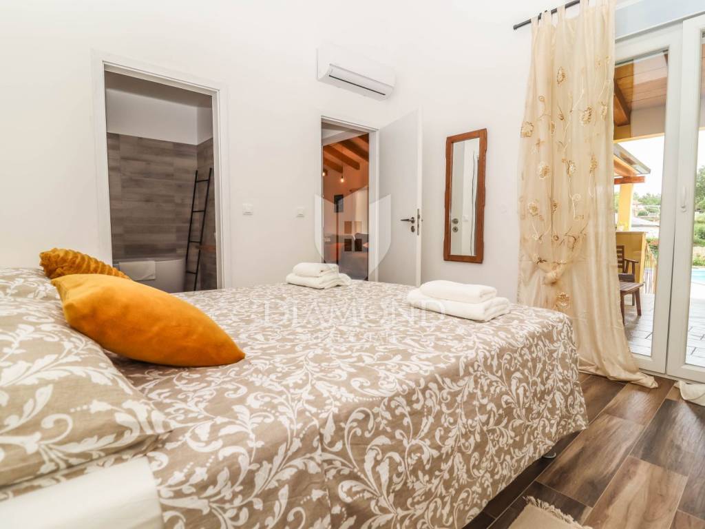 The living room of the house leads to a large terrace, where there is a summer kitchen with a fireplace and a wooden dining table. This terrace is the perfect place to relax and socialize during warm summer evenings. Also, the master bedroom has its own terrace with lounge furniture, which is an additional space for relaxing and enjoying the fresh air, with a beautiful view of the pool and the surrounding area.