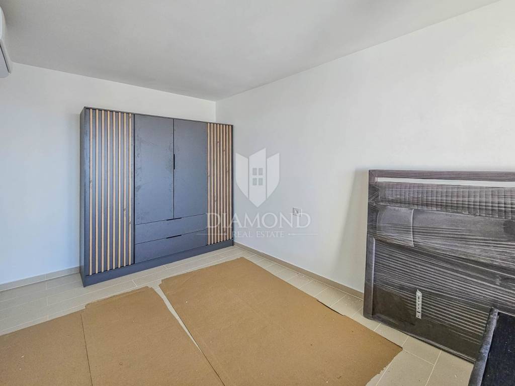 The apartment is located on the 2nd floor of a smaller, newer building with a total of 8 apartments. The total area of the apartment is 85 m2. It consists of a living room with kitchen and dining room, 2 bedrooms each with their own terraces, bathroom and hallway. From the living room there is access to a covered terrace with a beautiful view of the sea. The apartment has 1 parking space and a storage room in the basement of the building. It was built from high-quality building materials with underfloor heating and air conditioning. The floors are decorated with high-quality ceramic tiles and the carpentry is made of aluminum elements with sun protection in the form of blinds. The entrance door is anti-burglary and fire-resistant.