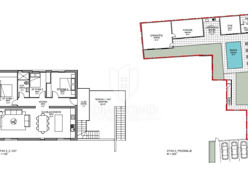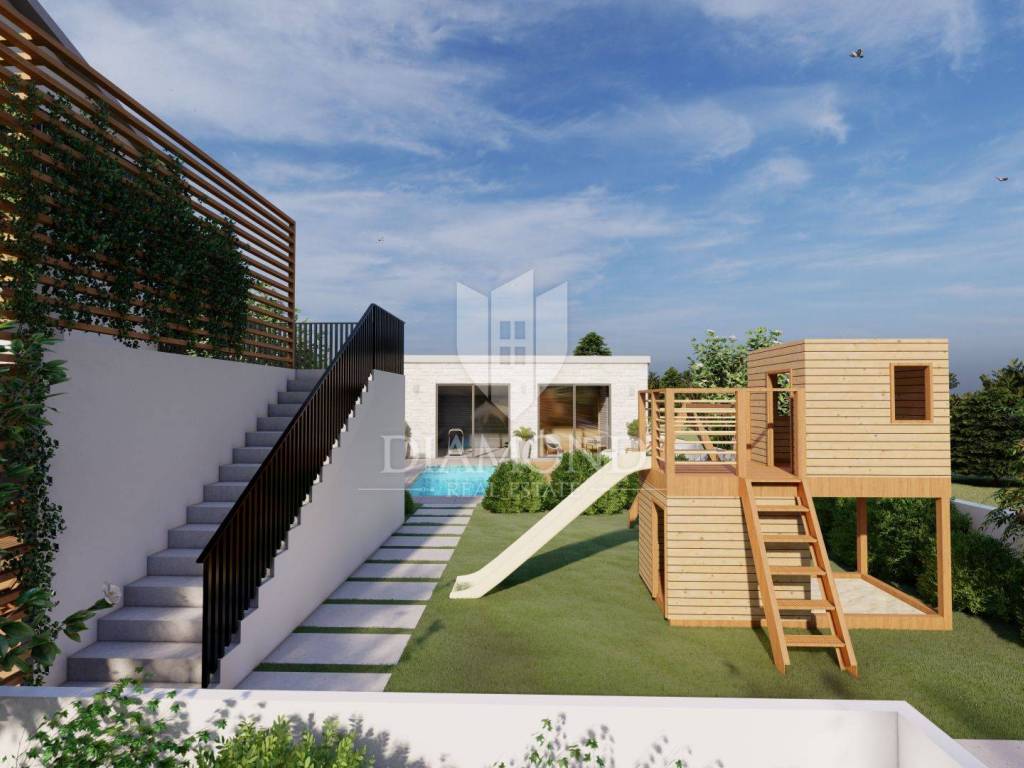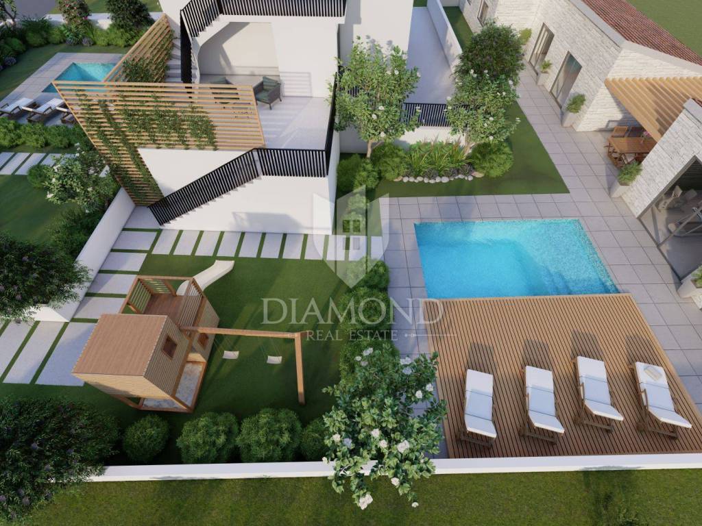This apartment is located on the second floor of a building built in the 1970s. By adapting the existing apartment for which the project was carried out, we get an apartment that will contain three bedrooms, a bathroom and a large living room that is connected to the kitchen and dining room. This apartment also has a terrace on the first floor of the house as well as a garden at the back of the plot where there will be a swimming pool with sun deck, gym, sauna, tavern and storage. The apartment also has two parking spaces.