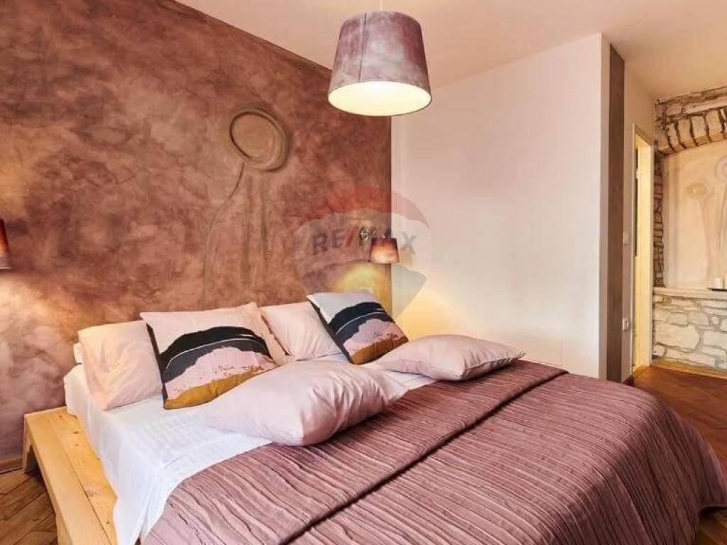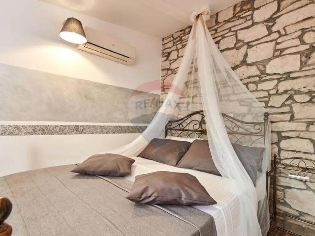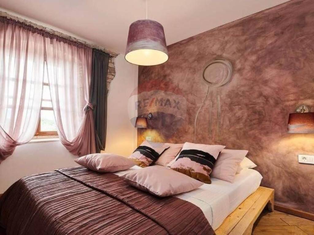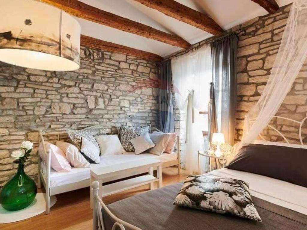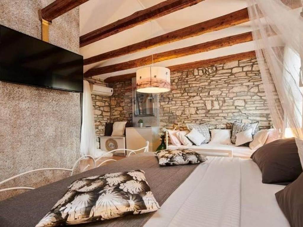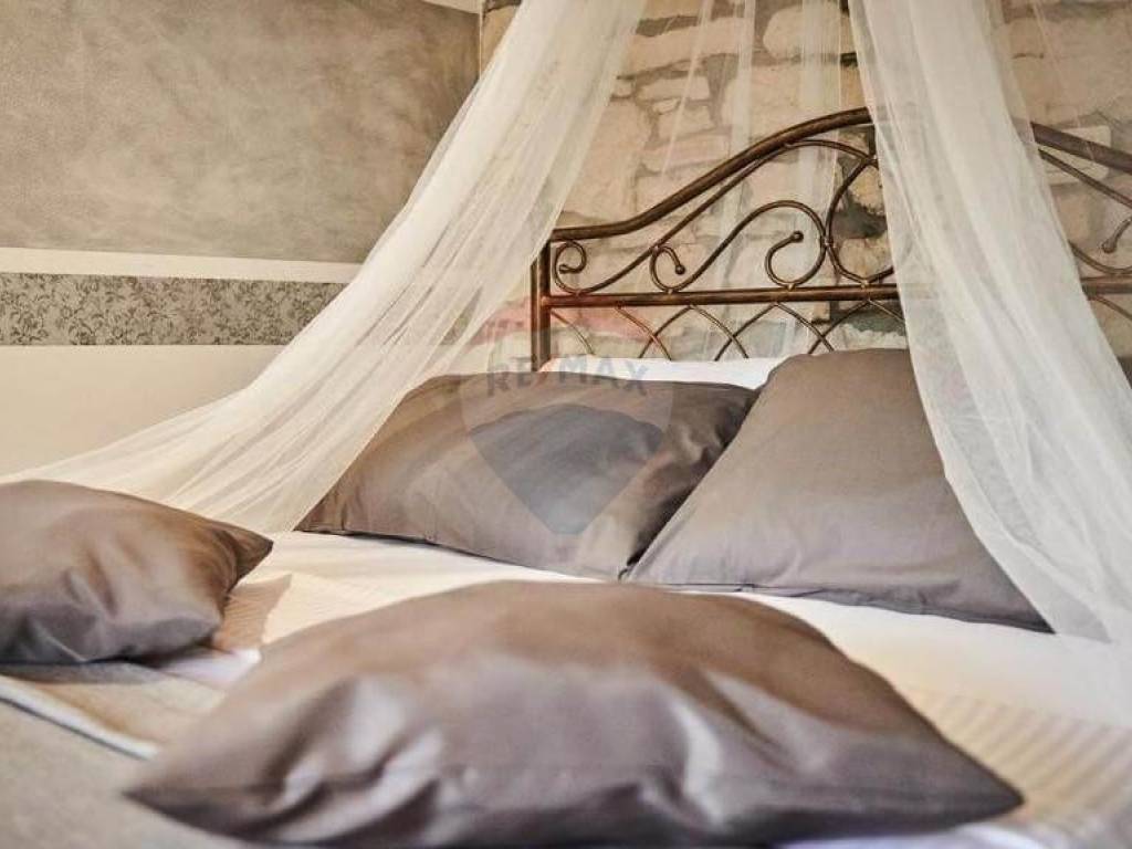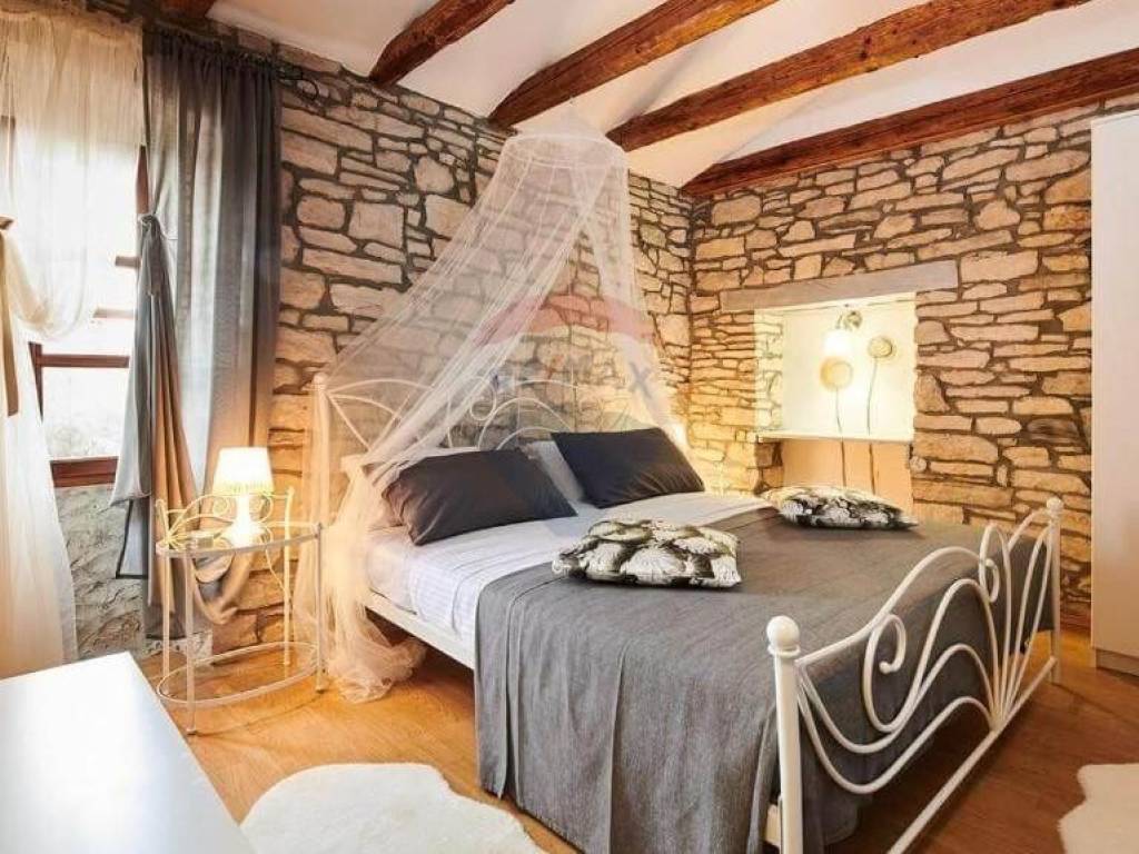 Na katu do kojeg se dolazi direktnim ulazom s područja vrta i bazena se nalazi pet soba u istarskom rustikalnom stilu, svaka sa svojom kupaonom.