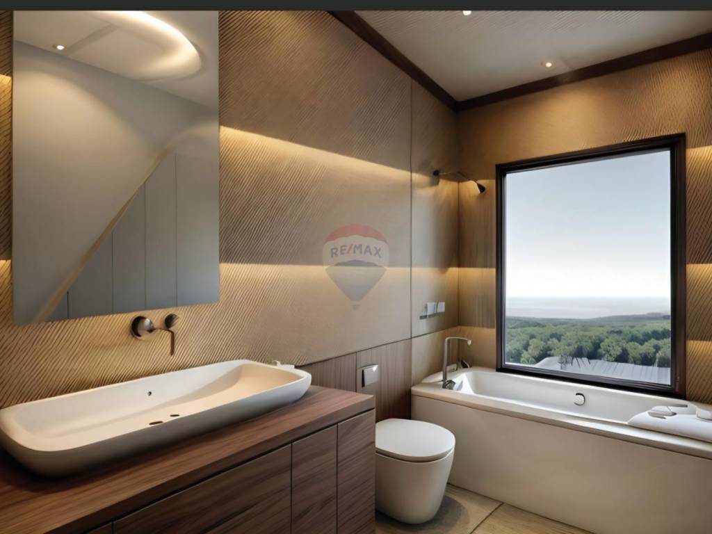 From the moment you enter, you're greeted by a modern and elegant foyer that leads to a guest toilet and laundry room, and then flows into a spacious open-plan living area. The kitchen and dining area, designed in a contemporary open-concept layout, naturally extend into the living room. A large glass wall opens up to a sun deck, summer kitchen, and an infinity pool with breathtaking panoramic views of the sea.