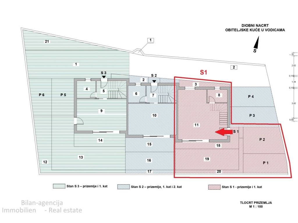On the ground floor of apartment S1 there is a bathroom, living room, dining room, kitchen, stairs to the upper floor.