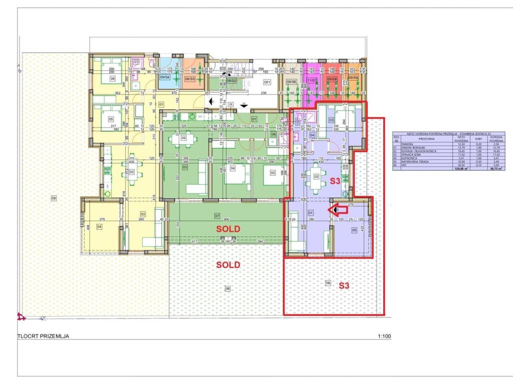 The apartment marked S3 is located in Vodice, on the ground floor of a building with a ground floor and two floors, a total of 9 apartments.