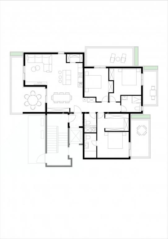 The outdoor area of 171.12 m² includes several covered and uncovered balconies, a loggia, a private green area of 26.53 m², and an impressive rooftop terrace of 93.84 m², ideal for relaxation, sunbathing, and outdoor gatherings.