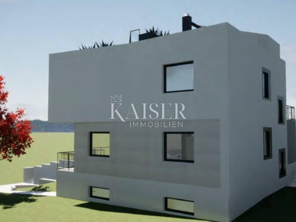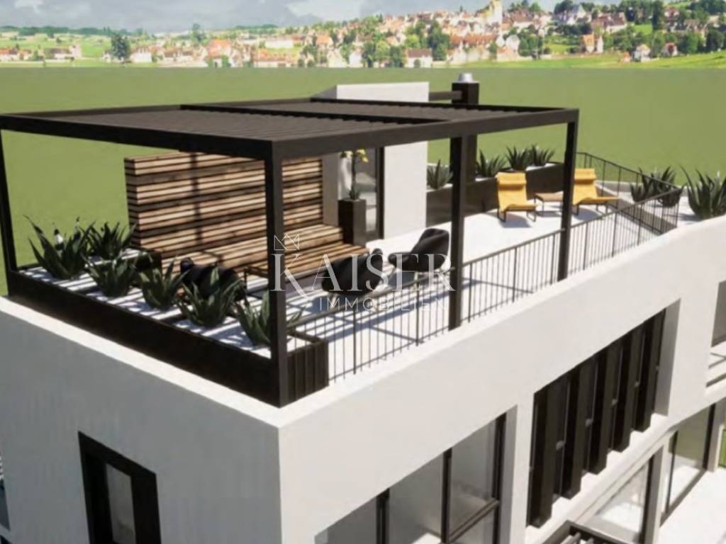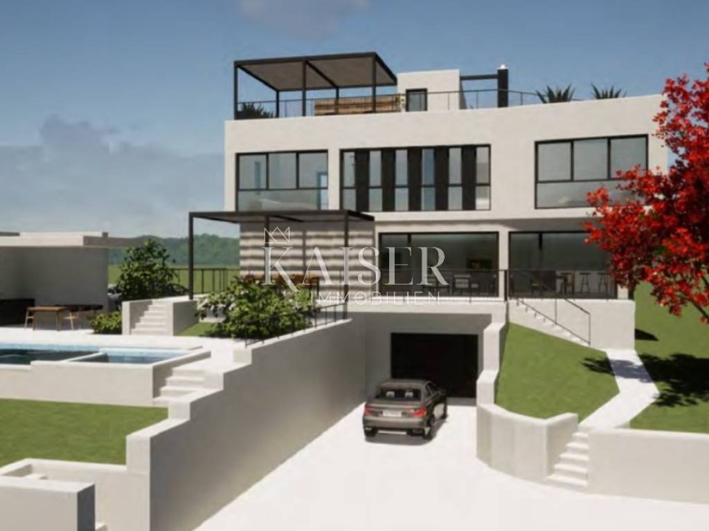 Kaiser Immobilien presents a luxury villa near Poreč with a total area of 330m2 with rich content, a beautiful panoramic view of the sea and nature. This modern villa consists of a basement, ground floor, first floor and a large roof terrace. The basement of 120 m2 consists of a large garage for two cars, wellness, fitness, storage and technical room. The ground floor is divided into an open living area where there is a kitchen, dining room and living room with lots of sunlight coming through the wall of glass that runs along the entire living area. From the living room there is access to a partially covered terrace and yard where there is a large swimming pool with a jacuzzi of a total area of 47 m2. On this floor there is another bedroom, a bathroom and a guest toilet. On the first floor, we have as many as 4 bedrooms, 2 of which have their own bathrooms, and the master bedroom has access to its own terrace. The other rooms can use a shared bathroom and a large roof terrace of 60 m2 covered with a modern pergola, which truly offers a phenomenal panoramic view of the landscape and the sea. This beautiful villa is located on a plot of 1000 m2 with a summer kitchen and two parking spaces. Electric underfloor heating will be installed throughout the house along with air conditioners for summer cooling. The completion of the construction of this villa is expected at the end of 2024. The luxury and comfort offered by this villa with truly rich contents and a breathtaking view are a rare opportunity on the market. This villa is suitable for year-round living and/or tourist rental, as it is located in an extremely beautiful location only 500 meters from restaurants, cafes and markets, 6 km from the sea and 12 km from the center of Poreč.