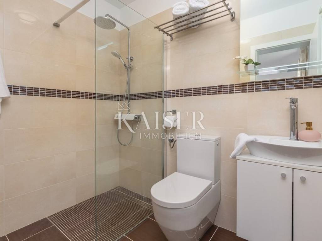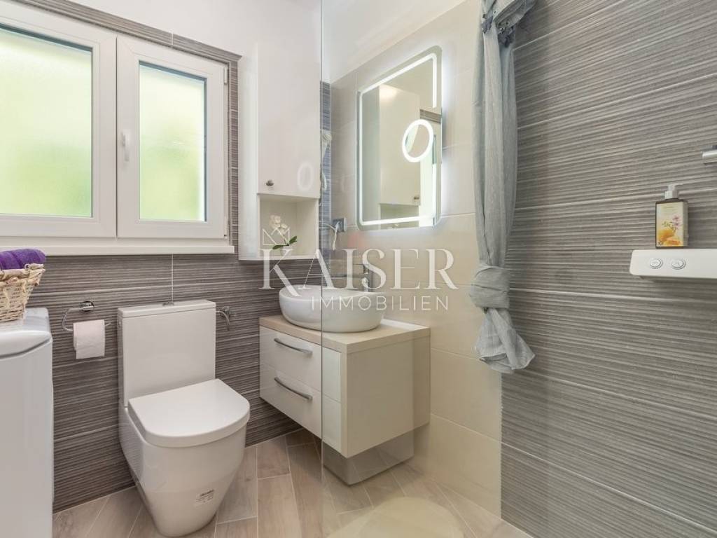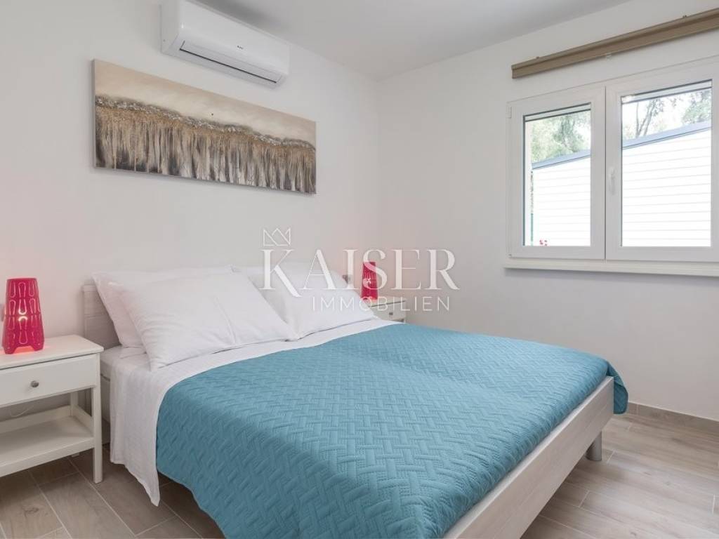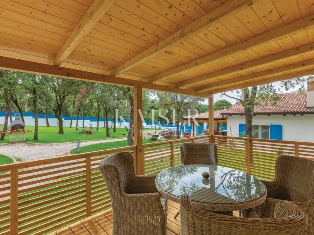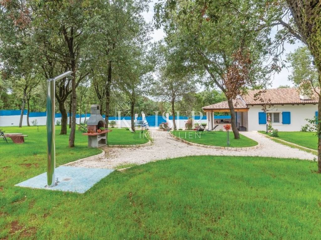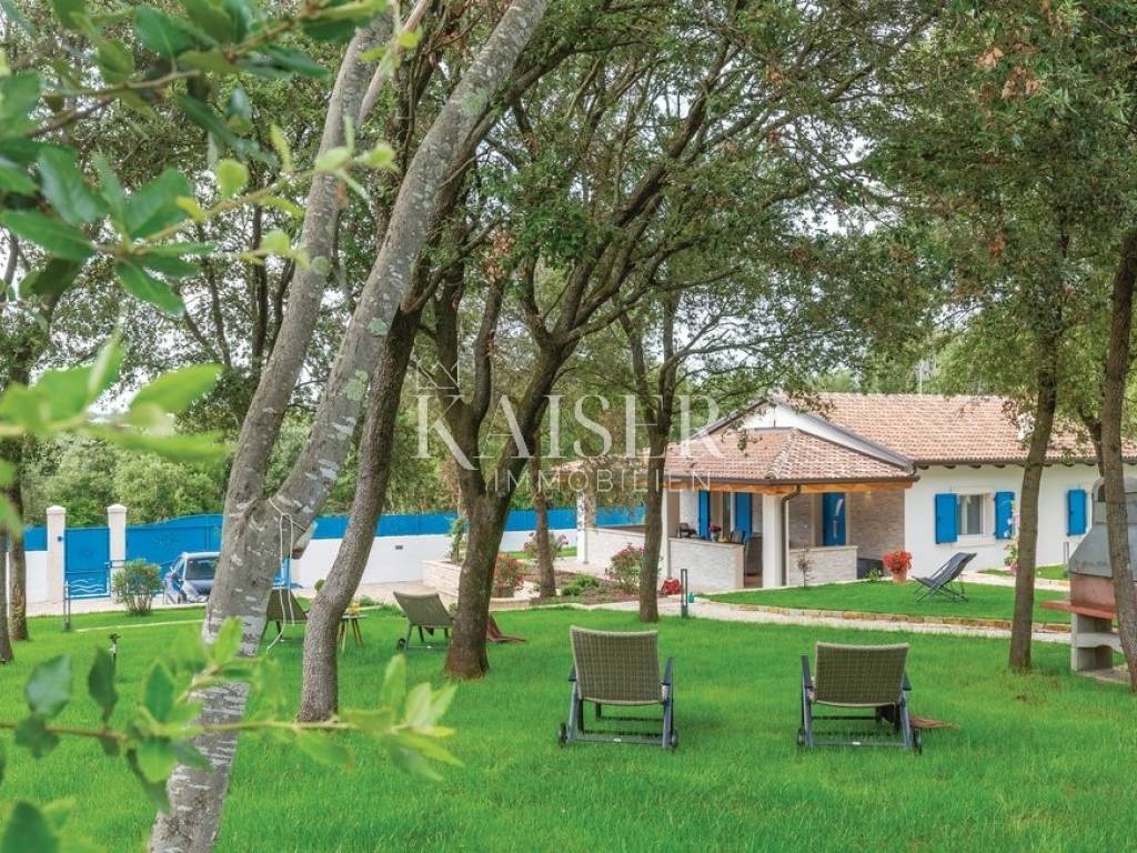 Kaiser Immobilien offers this beautiful house located in a quiet location in peaceful Rovinj, only 50 m from the sea and only a few km from the city and its amenities. The house consists of a spacious living room that is connected to the kitchen in a semi-open concept. From the living room you enter a small hallway with a bathroom, which has one bedroom on each side, one of which has its own bathroom. The terrace is located at the entrance to the house and is connected to the kitchen by a balcony door. This house has a large garden of about 3150 m2, which offers a handful of possibilities and facilities such as a tool shed, an outdoor shower and a children's playground. The parking lot is large enough to park 3 cars, and the entrance to the parking lot is automated. The house is secluded and provides complete privacy. Next to the main house is a mobile home with two rooms, a bathroom and a living room.