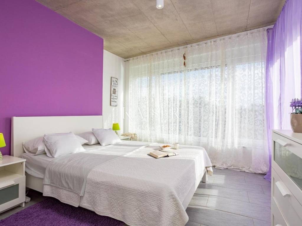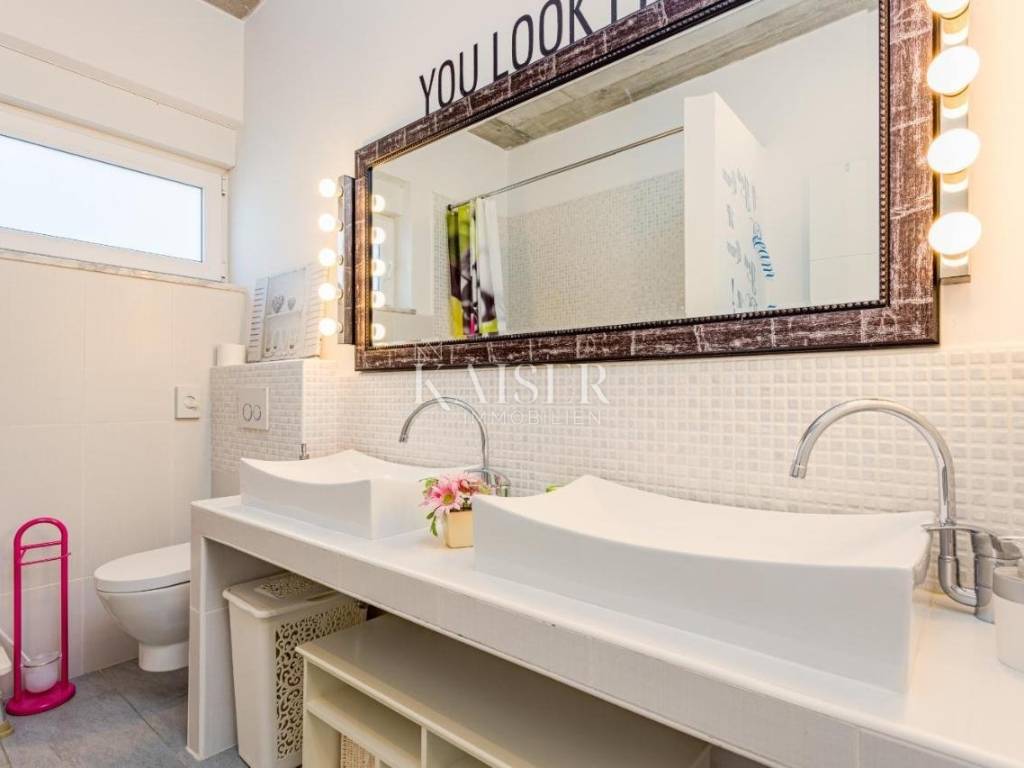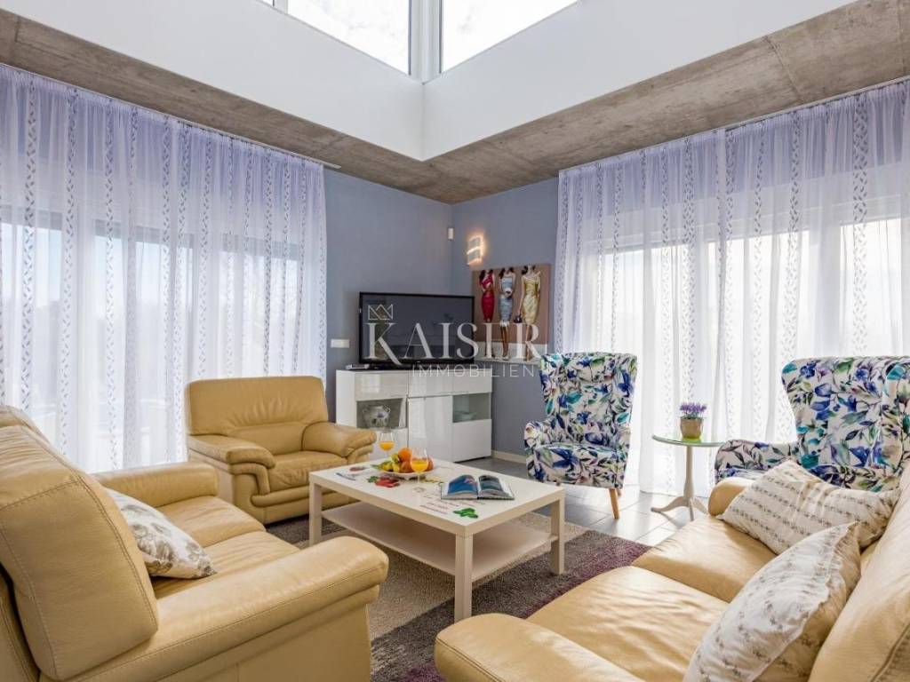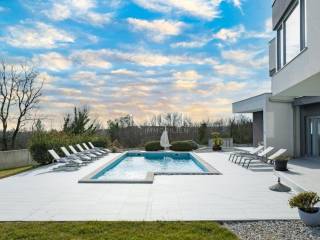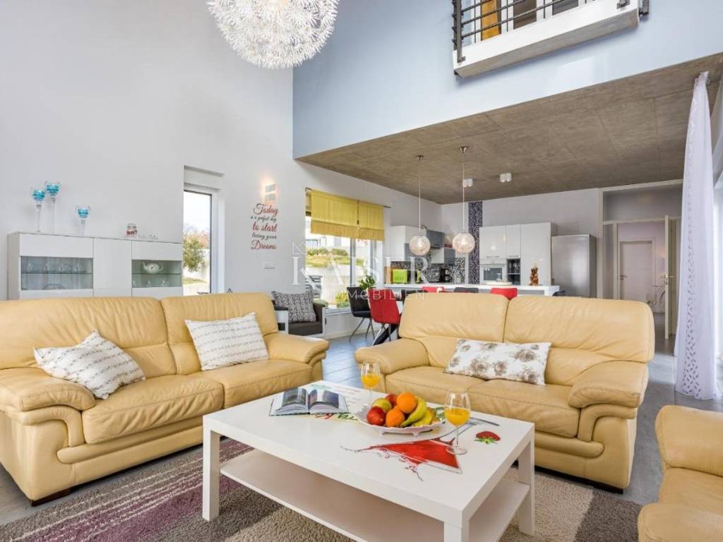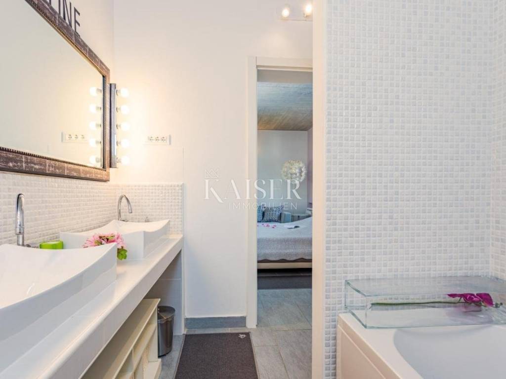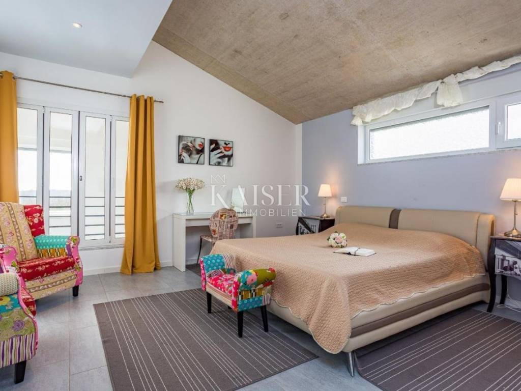 Kaiser Immobilien presents a unique opportunity located just two kilometers from the first beaches. Krnica is a small picturesque town on the eastern coast of Istria, known for its peace, untouched nature and authentic Mediterranean atmosphere. Surrounded by green hills and crystal clear sea, it offers beautiful landscapes perfect for walking, cycling and enjoying nature. It also has its own port (Krnički porat), where you can find fishing boats, quiet beaches and clear sea ideal for swimming and diving. It is a place with a rich tradition, where you can enjoy homemade food, olive oil, wine and fresh fish directly from local fishermen. Unlike large tourist centers, it offers a relaxed and slower way of life, perfect for those looking for an escape from the crowds and stress. Close to cultural and historical sites, it is located not far from historical cities such as Pula, Rovinj and Labin, where you can enjoy cultural events, museums and the rich history of Istria. Life in Krnica is the perfect combination of tradition, nature and a peaceful Mediterranean lifestyle. The villa is located on a spacious plot of 1,730 m2, offering 247 m2 of living space divided into two floors. The ground floor has an open space for socializing, offering a kitchen with a dining area and a living room with access to the pool sundeck. The spacious living room is equipped with modern amenities, including a fully equipped kitchen with all necessary appliances. The ground floor also offers a bedroom with its own dressing room and bathroom. Upstairs there are three bedrooms with dressing rooms and two bathrooms, providing access to the terrace. This property offers the perfect blend of luxury, comfort and modern architecture, located in a peaceful setting with beautiful views of the sea and the surrounding nature. The outdoor area includes a large 44 m2 swimming pool, surrounded by sun loungers and parasols, ideal for relaxing in the sun. There is also a covered terrace with a summer kitchen and barbecue, providing the perfect place for al fresco dining. For more information, contact the agent. Ana Beović ana@kaiser-immobilien.hr +385 91 618 3332