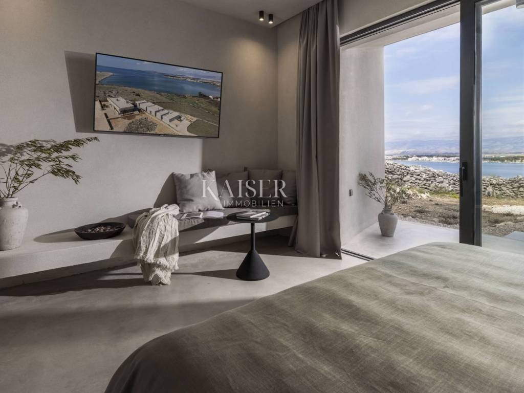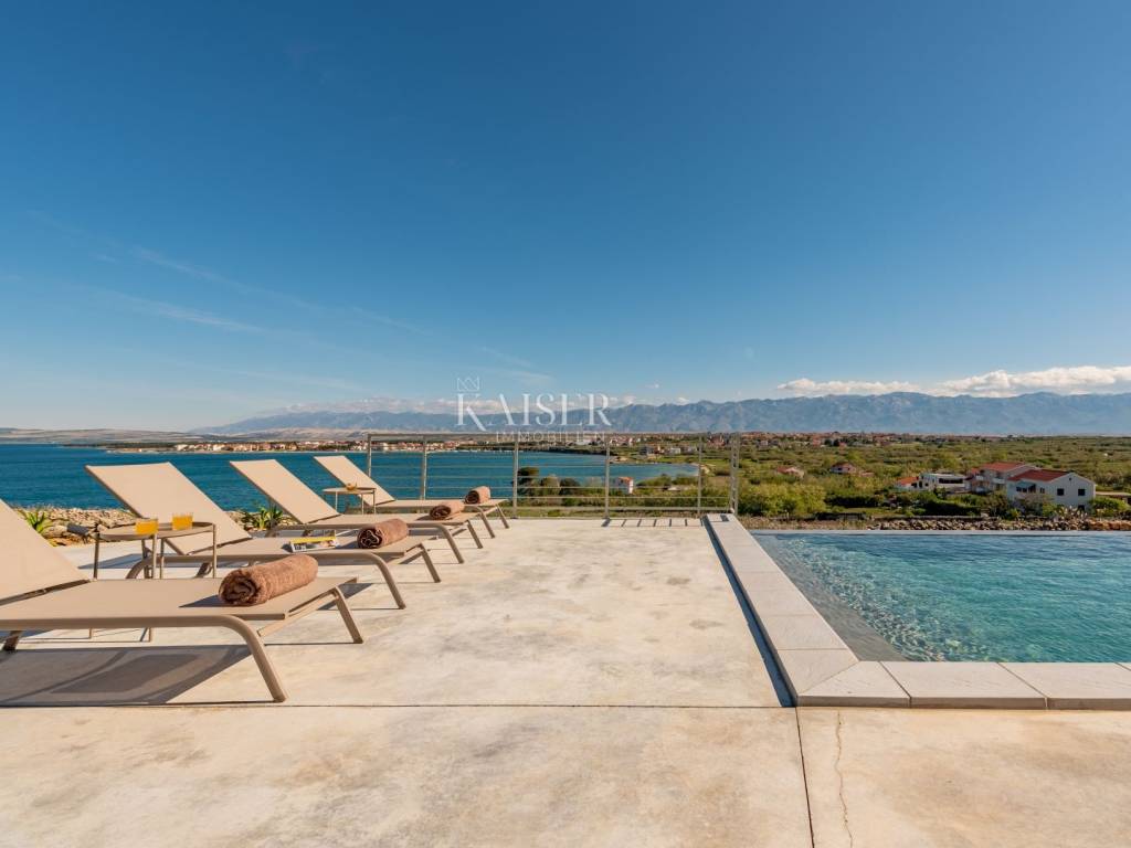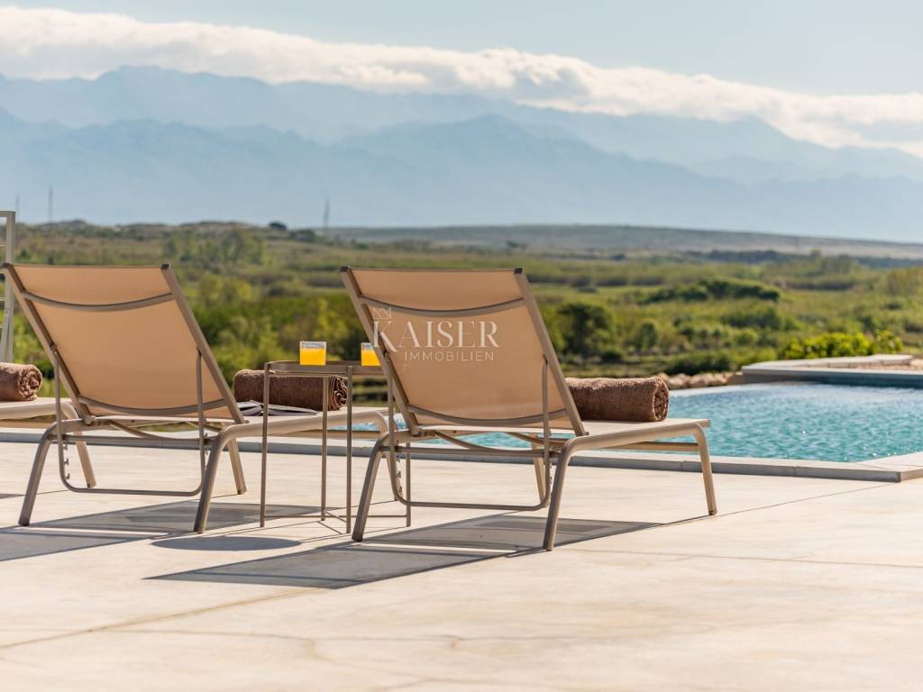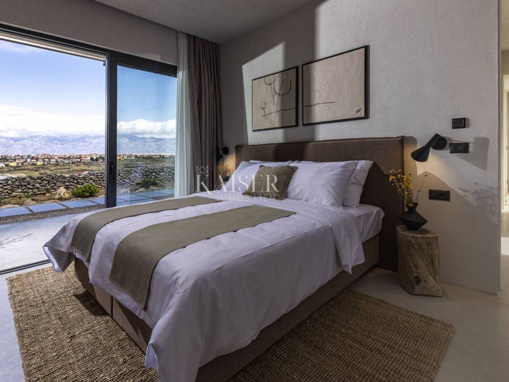 Kaiser Immobilien presents a beautiful ground floor villa with a spacious living room with fireplace, four 25 m2 bedrooms, a 40 m2 living/entertainment room and a large terrace with a 40 m2 heated infinity pool overlooking the bay and the mountains. The villa is being built on a plot of 1490 m2 with covered parking, a charger for an electric car and a garden planted with Mediterranean plants. The villa is equipped with a fully equipped kitchen, bathrooms with a walk-in shower and floor heating and air conditioning in all rooms. It has an outdoor lounge and a terrace with a barbecue. It also has a photovoltaic plant that provides additional energy for the property. The island of Pag is one of the sunniest islands in the Adriatic with over 2,500 hours of sunshine per year. Among more than a thousand Adriatic islands, Pag is completely different from the others; under the stone armor hides the wealth created over centuries by the hands of hardworking islanders who always had to work hard to create something. That is why it is worth visiting it, discovering its many different faces and enjoying them. For additional information, contact us with confidence on the phone number +385 91 523 1376, or on the email address: vanja@kaiser-immobilien.hr.