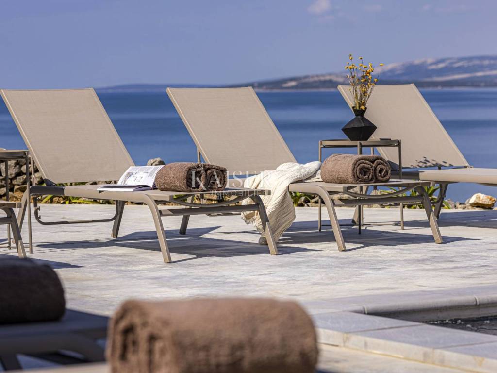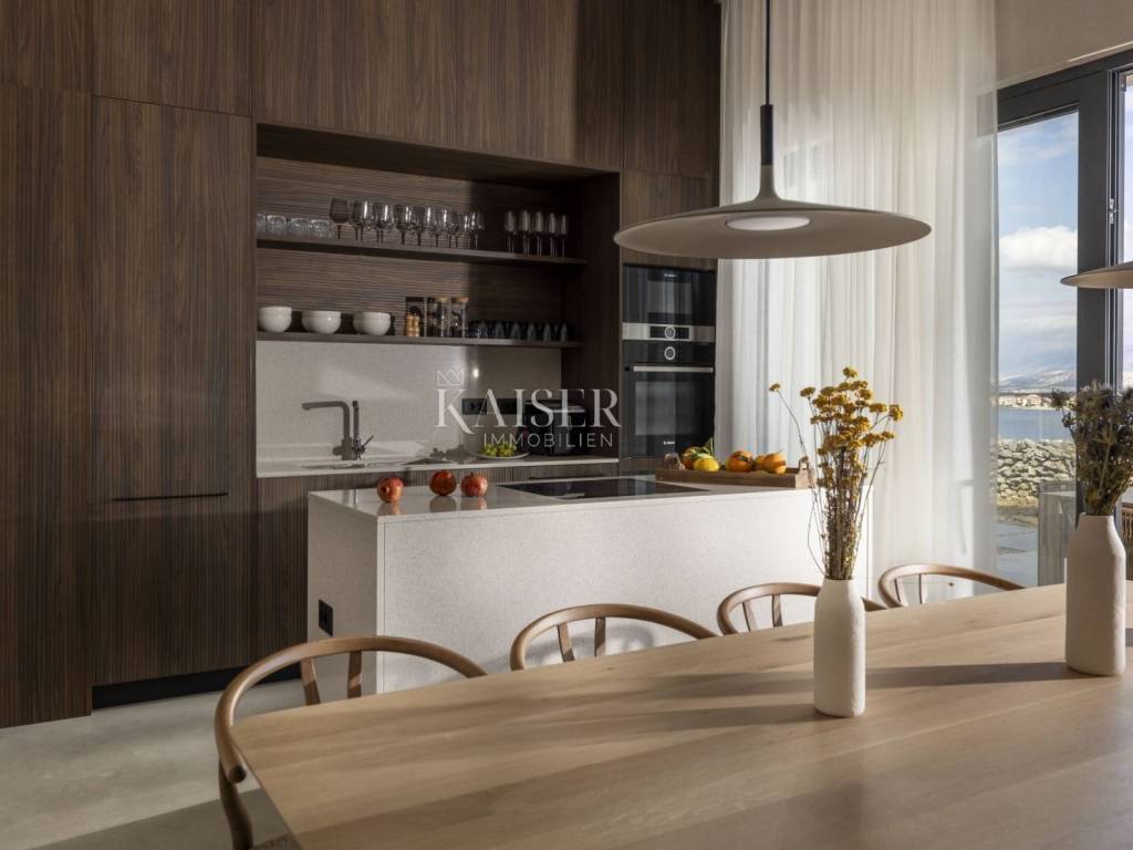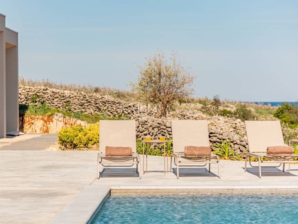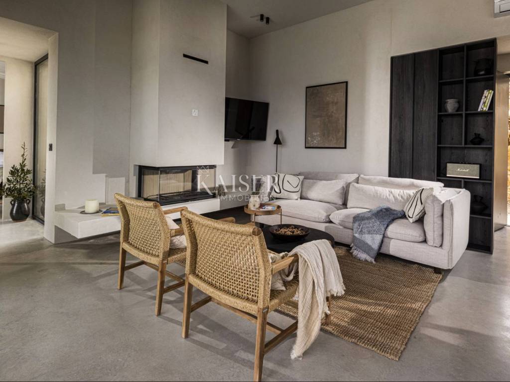 Kaiser Immobilien presents a beautiful ground floor villa with a spacious living room with fireplace, four 25 m2 bedrooms, a 40 m2 living/entertainment room and a large terrace with a 40 m2 heated infinity pool overlooking the bay and the mountains. The villa is being built on a plot of 1490 m2 with covered parking, a charger for an electric car and a garden planted with Mediterranean plants. The villa is equipped with a fully equipped kitchen, bathrooms with a walk-in shower and floor heating and air conditioning in all rooms. It has an outdoor lounge and a terrace with a barbecue. It also has a photovoltaic plant that provides additional energy for the property. The island of Pag is one of the sunniest islands in the Adriatic with over 2,500 hours of sunshine per year. Among more than a thousand Adriatic islands, Pag is completely different from the others; under the stone armor hides the wealth created over centuries by the hands of hardworking islanders who always had to work hard to create something. That is why it is worth visiting it, discovering its many different faces and enjoying them. For additional information, contact us with confidence on the phone number +385 91 523 1376, or on the email address: vanja@kaiser-immobilien.hr.