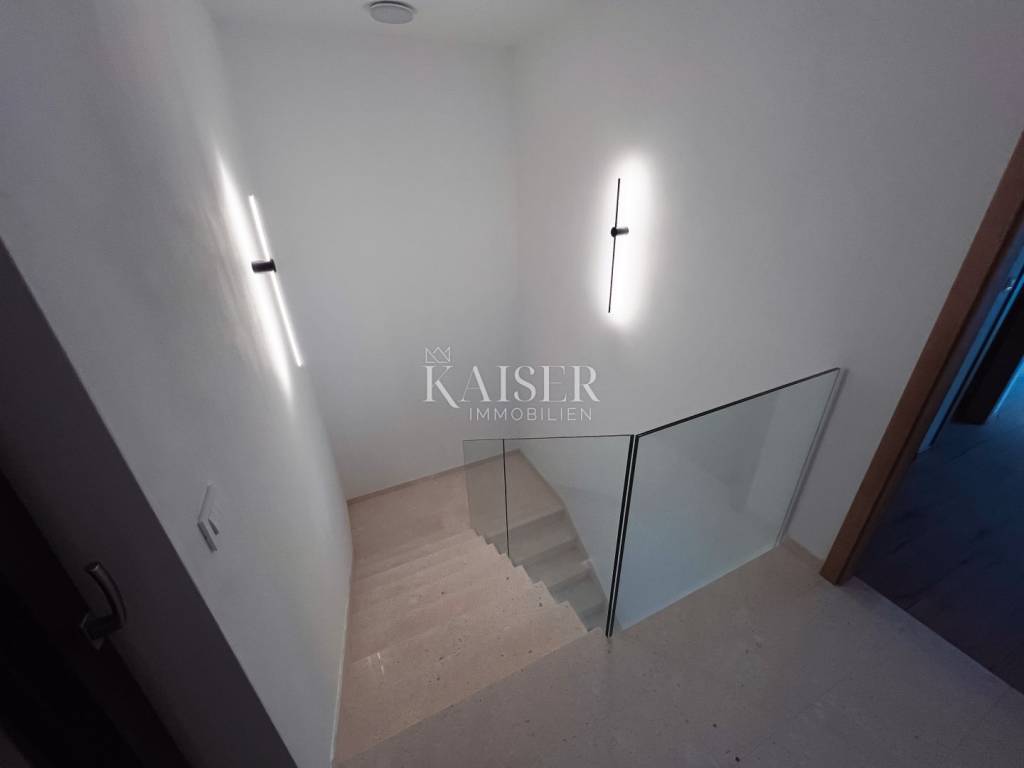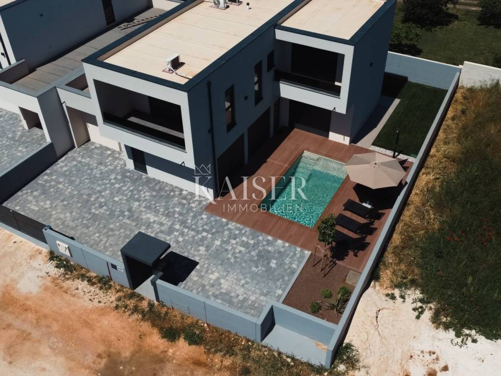 Pomer is a picturesque small village located in the southern part of Istria, just a few kilometers from Medulin and Pula. Known for its long fishing tradition and peaceful surroundings, Pomer offers an authentic Mediterranean experience away from the crowds. The town is located next to the protected Pomer Bay, ideal for boaters and water sports enthusiasts, and the modern marina makes it an attractive destination for sailors. Pomer boasts beautiful pebble and rocky beaches, crystal clear sea and numerous cycling and hiking trails that lead through untouched nature. Kaiser Immobilien presents you with a modern villa of 198.53 m², located in a prestigious location, just a three-minute walk from the clear sea, beach and marina. This elegant and functional property offers the perfect blend of luxury, comfort and contemporary design, providing an ideal space for relaxation and enjoyment of the Mediterranean lifestyle. The villa is spread over two floors, a ground floor of 116.67 m² and an upper floor of 81.86 m², and every detail has been designed with special care to ensure maximum functionality and comfort. A covered entrance of 5.73 m² leads to a spacious hallway of 8.20 m², which opens the way to an elegant living room, dining room and modern kitchen of 32.58 m² in total. Thanks to large glass walls, the space is flooded with natural light throughout the day, while the southeast orientation ensures sunlight from morning until almost evening. The kitchen is equipped with the latest Gorenje appliances, while the Hansa microwave oven fits perfectly into the sophisticated design of the space. The ground floor also houses the first bedroom of 19.05 m², which offers complete privacy thanks to its own bathroom of 6.08 m², equipped with high-quality Jika and Hansgrohe sanitary ware. The bedroom overlooks the pool and has direct access to the pool and garden. The hallway also leads to a separate toilet of 3.07 m², which houses a new Vivax washing machine and a water heater with a capacity of 80 liters. For added convenience, there is also a storage room under the stairs of 1.25 m² on the ground floor, providing additional storage space. A special advantage of this villa are two additional rooms of 20.77 m² and 17.59 m², which the new owner can arrange according to his own wishes, in agreement with the investor who will enable the realization of all ideas. These spacious units offer a wide range of possibilities - they can be used as a combination of a garage and a tavern, an additional room with a garage, a small apartment given the already installed kitchen connections, a play or recreation area. Each room has a separate entrance, while the larger room of 20.77 m² opens onto a covered loggia of 3.35 m², and the smaller room leads directly to the courtyard, which also has a covered part. An internal marble staircase of 10.62 m² leads to the upper floor, where there are two spacious and modernly decorated bedrooms. The second bedroom of 19.05 m² has an en-suite bathroom of 6.63 m² with a shower and toilet, and a special luxury is the exit to a private loggia of 4.62 m², from which there is a view of the sea and neighboring villas. Thanks to the large windows, you can even enjoy the sea view from your bed. The third bedroom of 19.46 m² also has an en-suite bathroom of 5.71 m² with a shower and toilet and an exit to a spacious loggia of 9.70 m². Each bathroom has natural lighting thanks to windows, while both rooms also have a dressing room of 5 m². An additional exclusive element of the villa is the roof terrace of almost 40 m², which is already equipped with electrical connections and infrastructure for installing a jacuzzi, providing the owners with the perfect corner for relaxation with a panoramic view of the surroundings. The villa is equipped with an advanced air conditioning system, with each room, including the 20.77 m² wine cellar, having a Maxon air conditioner, and for additional comfort, central underfloor heating is provided throughout the villa. High-quality PVC joinery with double-glazed glass ensures excellent thermal and sound insulation, while all necessary connections are available - high-speed internet, TV and sewage. Security is at the highest level thanks to modern video surveillance and a Hikvision alarm system, which includes a battery, enabling uninterrupted operation for 3-4 hours even in the event of a power outage. The villa also has an intercom and an electric entrance, and the entire 170 m² garden is fully fenced. The exterior of the villa further raises the level of luxury and comfort. In the courtyard there is a beautiful swimming pool measuring 3 mx 5.44 mx 1.50 m, equipped with an automatic salt water system that makes maintenance easy. There is an outdoor shower by the pool, and the garden is decorated with an automatic irrigation system, which keeps the garden fresh and green throughout the year. There is parking space in the yard for at least two to three cars. The location of this villa is extremely attractive, ideal for those who want to enjoy being close to the sea. The beach, marina, small market, cafes and bakery are only 200-250 meters away, or a three-minute walk, which provides the perfect combination of privacy and convenience. What makes this villa even more special is its four-star categorization, which represents an excellent investment opportunity, whether it is a luxurious family home or a property intended for tourist rental. If you are looking for an exclusive, modernly equipped villa with a swimming pool in the immediate vicinity of the sea, which provides superior comfort and security, this property represents an ideal opportunity. Proximity to amenities: Medulin, center - 5 km Restaurant - 700 m Sea/beach - 200 m Marina - 230 m Cafe - 200 m Bakery - 200 m Shop - 200 m Sports field - 650 m Bus station - 250 m Pula - 8 km Airport - 13 km Distance to larger cities: Pomer - Ljubljana: 200 km Pomer - Vienna: 580 km Pomer - B