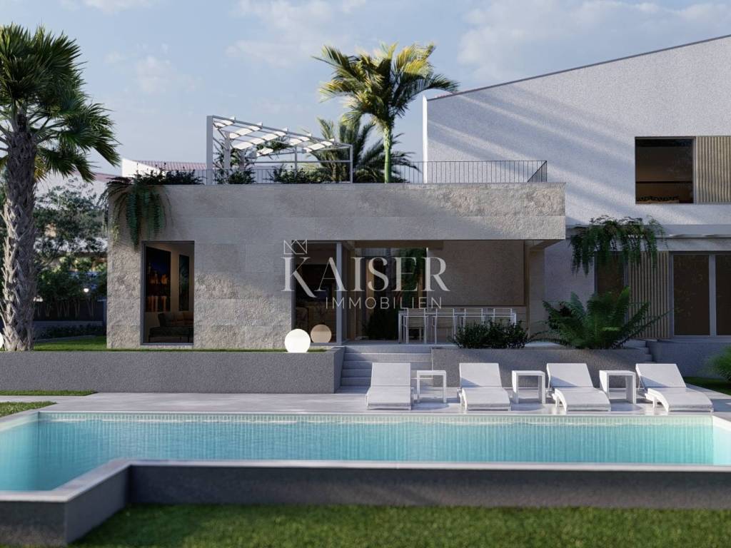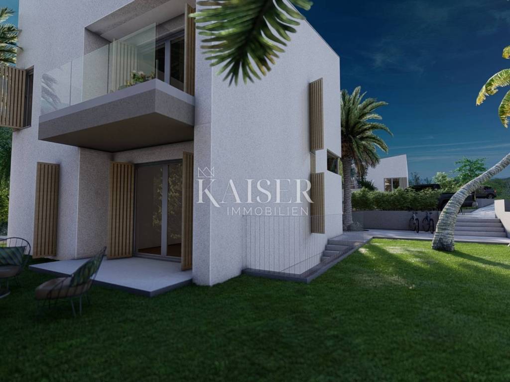 Kaiser immobilien is mediating the sale of a modern, newly built villa, located in an exclusive resort, near Malinska on the island of Krk. The gated resort is located in an exceptional location, and consists of 5 harmoniously arranged luxury villas, as well as additional shared facilities. There are tennis, basketball and mini golf courts, an outdoor gym, a children's park and a bowling alley. Villa "E" is located on a plot of 890m2, in a quiet environment, just 1000m from the sea. It is divided into three floors - basement, ground floor and first floor, and the total gross living area is 260m2. Modern architecture, exceptionally high-quality construction and furnishing, high-quality materials, an excellent location, all of which guarantee an exceptional finished product that will delight. On the ground floor, down the entrance hall, there is a spacious open-concept living area that includes a living room, kitchen and dining room. There are also two bedrooms and two bathrooms. On the first floor, which is reached by an internal staircase, there are two bedrooms with their own "en suite" bathrooms, and exits to a spacious 58m2 terrace with a sundeck and a hot tub. The terrace offers a beautiful view of the sea and the Kvarner Bay. One of the additional values of this property is the basement that includes a gym, bathroom, additional toilet and storage room. On the spectacularly landscaped garden decorated with carefully selected already formed Mediterranean trees and vegetation, there is a 32 m2 swimming pool, a sundeck, a terrace with an outdoor kitchen, and enough parking spaces for vehicles. The property is currently under construction, the expected completion date is by the end of 2025. The agency commission for the buyer is 3% + VAT and is paid in the case of purchasing the property, upon conclusion of the first legal act. ID CODE 105-296