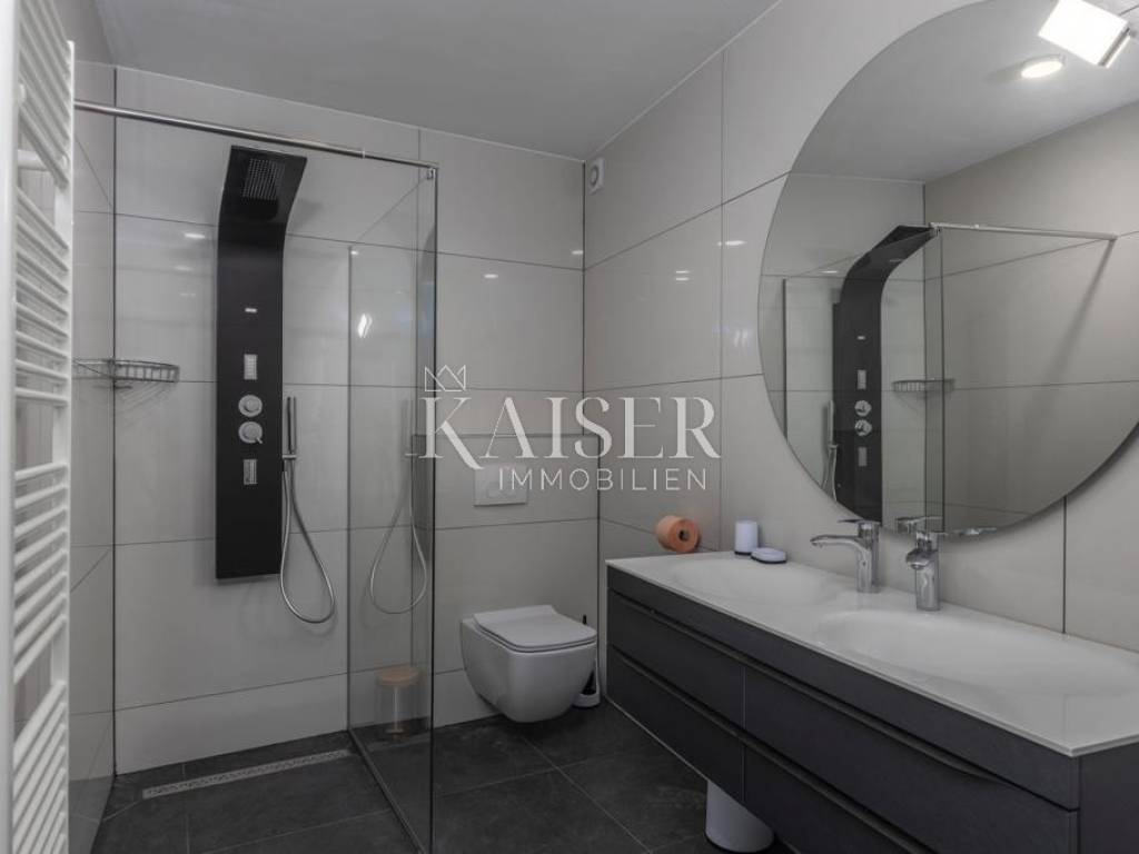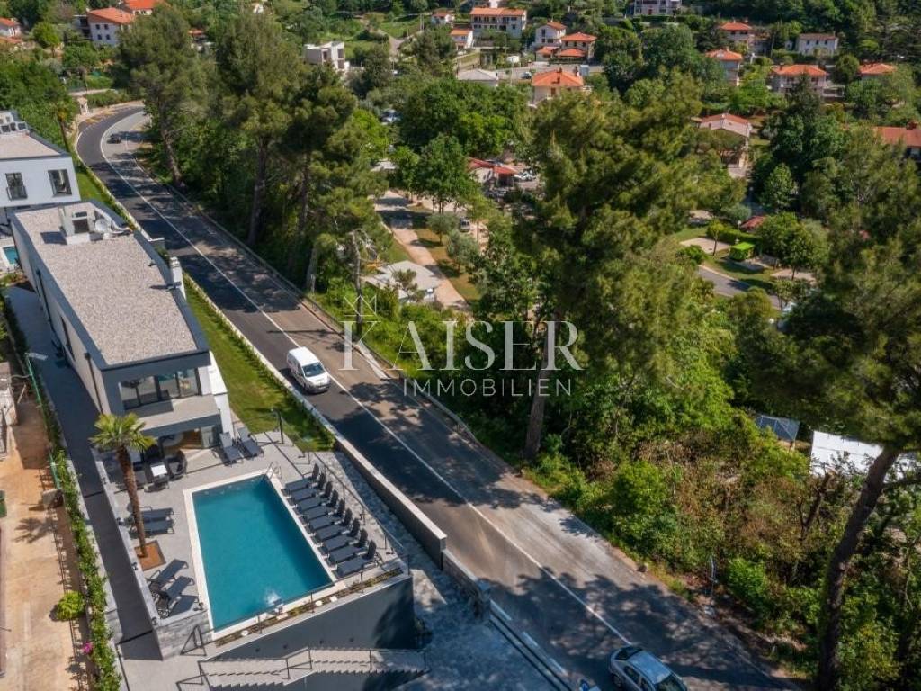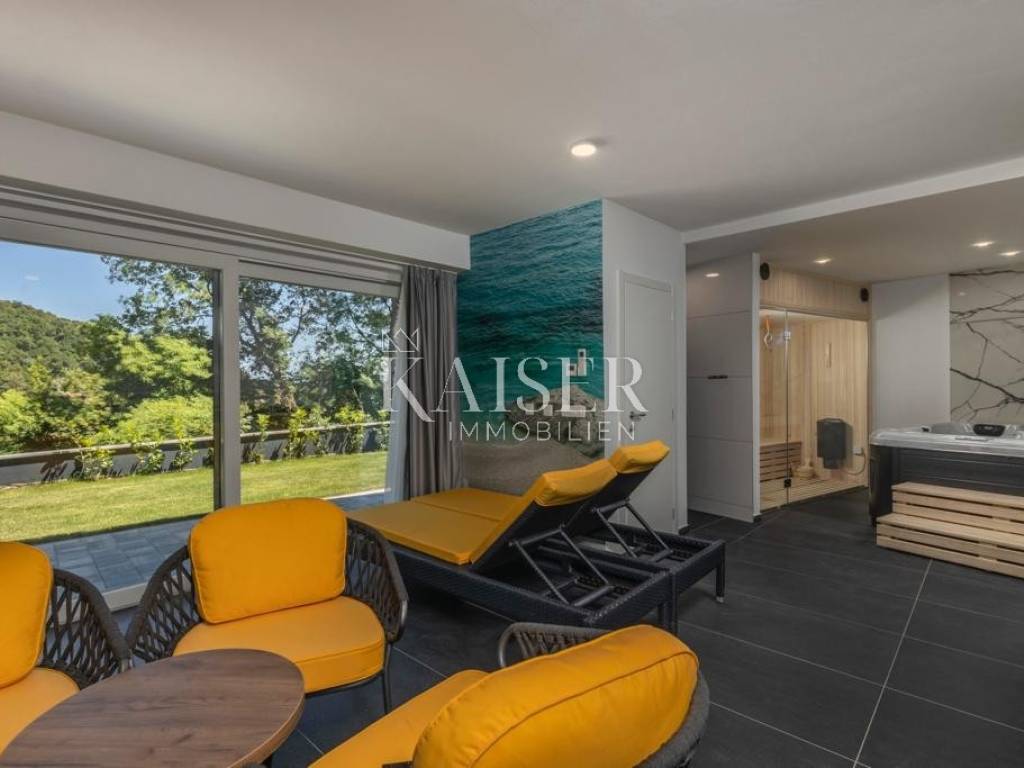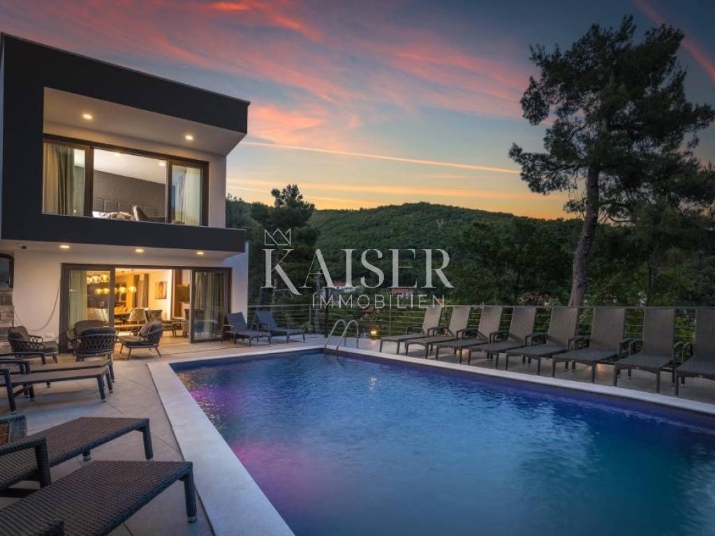 Kaiser Immobilien presents a new detached villa with a swimming pool, located in the immediate vicinity of the center of Mošćenička Draga and only 500 meters from the beach. The villa offers a total living area of 330 m2 on three floors. In the basement there is a wellness area with a sauna, a massage pool, a shower, a toilet and a corner for relaxation, a laundry room and two bedrooms, each with its own bathroom. Internal stairs lead to the ground floor, where there is a large living room, a dining area and an open kitchen, one bedroom with a bathroom and a guest toilet. The living room opens onto a large terrace with a 44 m2 swimming pool and sun deck. The main entrance to the villa is located on the ground floor level. Upstairs there are four bedrooms, each with its own bathroom and toilet, and a loggia of 9 m2. The villa is sold fully furnished and equipped. Heating and cooling is provided by a heat pump. Three parking spaces are also available. The seller of the villa is in the VAT system, and when purchasing, 25% VAT is charged on the published price. The total price of the villa with VAT is therefore €2,437,500.