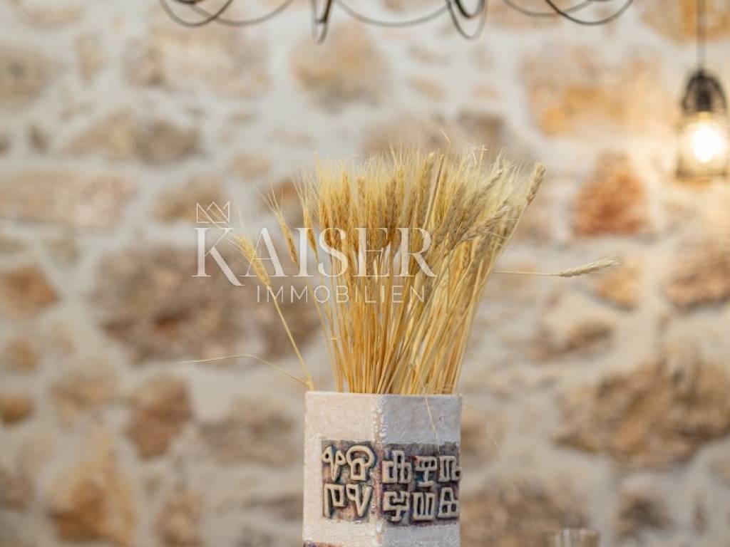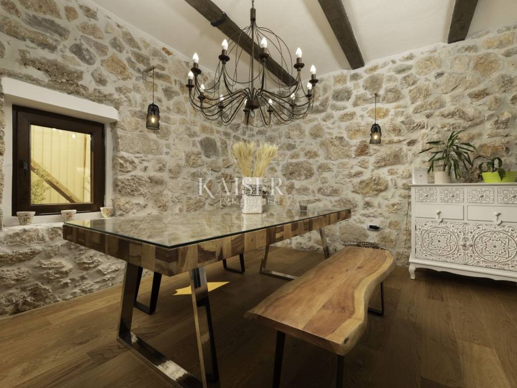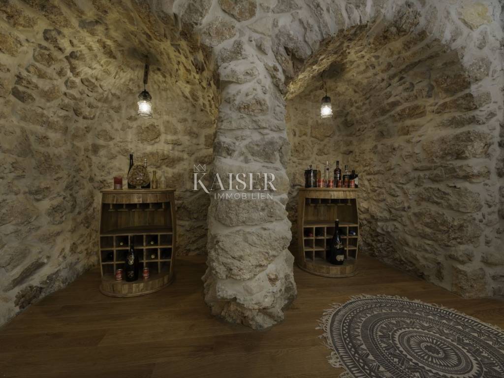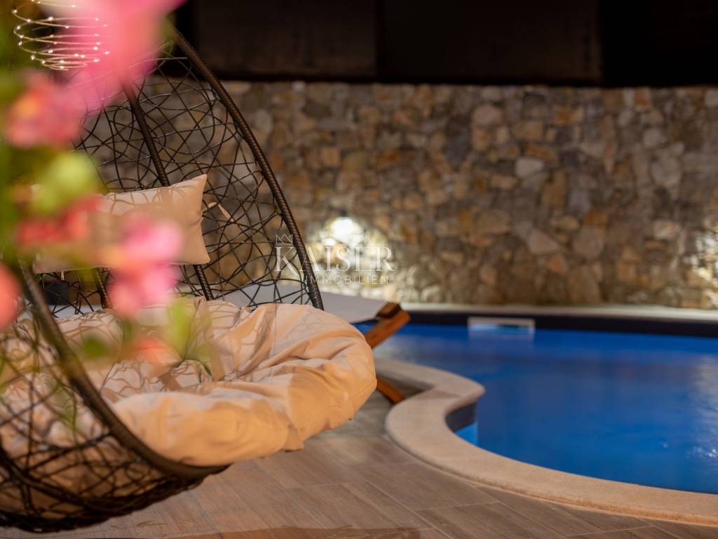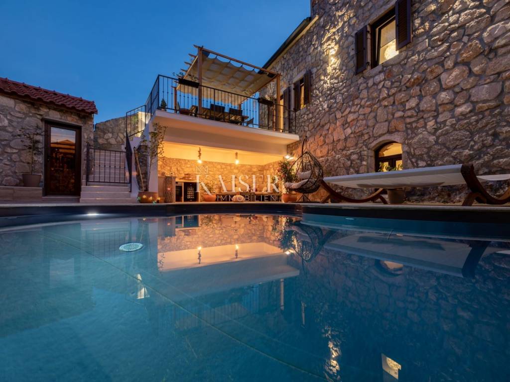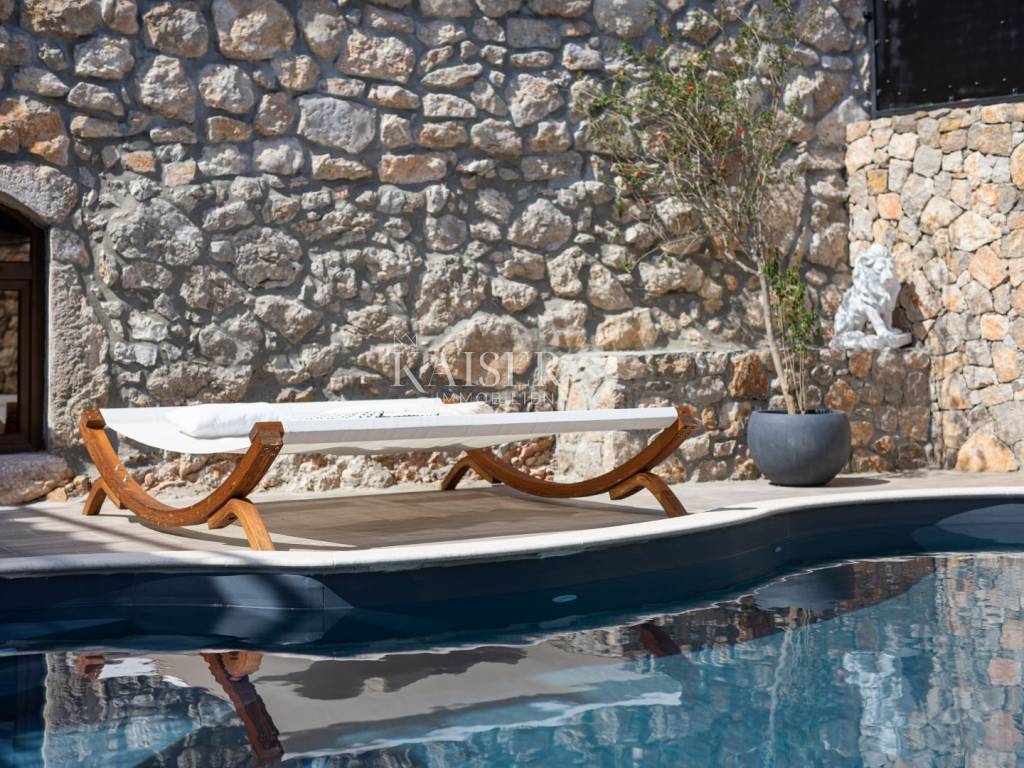 Kaiser Immobilien puts a luxury villa with a pool on the market. It consists of three floors. The first is an old stone tavern built in 1930, and the other two floors were upgraded in 2020. The tavern has been completely renovated and luxuriously decorated. It has a large room for gatherings with an indoor fireplace, and a wellness room with a sauna, gym and jacuzzi. On the first floor of the house there is a large terrace from which you enter the house, which consists of a living room, a kitchen with a dining room, a bathroom, a toilet and a bedroom. On the first floor there is a gallery, a living room, two bedrooms, a bathroom and a terrace. The whole house is luxuriously furnished. In the yard there is a 24 m2 swimming pool, outdoor shower, sun deck, grill, garden. The house also has four parking spaces. It is located in a quiet location, and it is 1500 m from the sea.