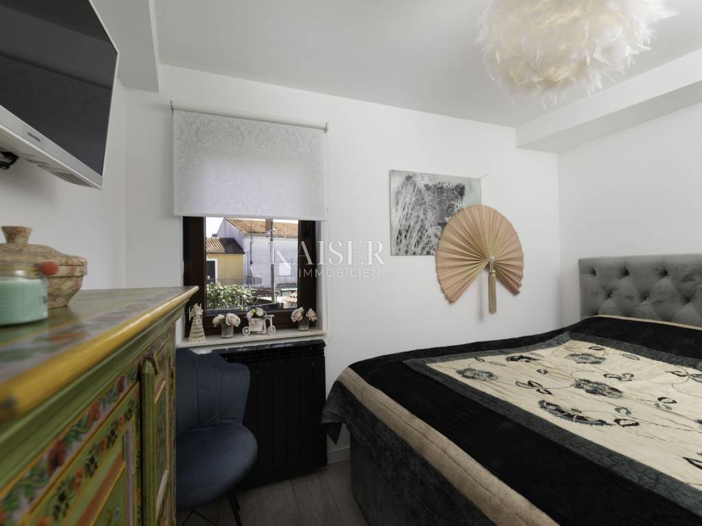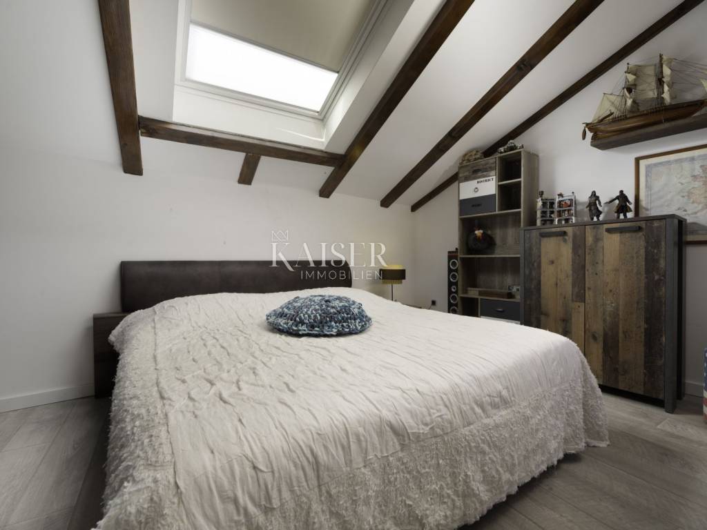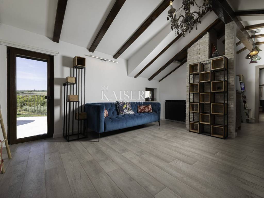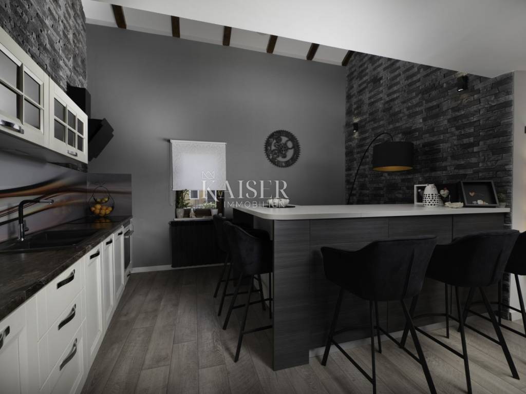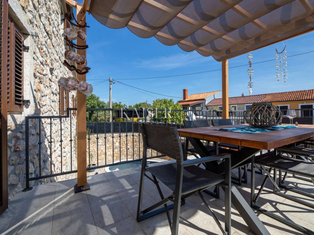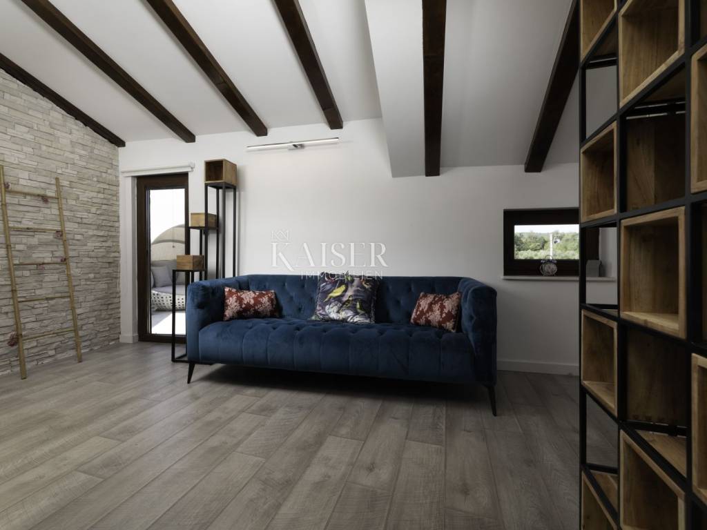 Kaiser Immobilien puts a luxury villa with a pool on the market. It consists of three floors. The first is an old stone tavern built in 1930, and the other two floors were upgraded in 2020. The tavern has been completely renovated and luxuriously decorated. It has a large room for gatherings with an indoor fireplace, and a wellness room with a sauna, gym and jacuzzi. On the first floor of the house there is a large terrace from which you enter the house, which consists of a living room, a kitchen with a dining room, a bathroom, a toilet and a bedroom. On the first floor there is a gallery, a living room, two bedrooms, a bathroom and a terrace. The whole house is luxuriously furnished. In the yard there is a 24 m2 swimming pool, outdoor shower, sun deck, grill, garden. The house also has four parking spaces. It is located in a quiet location, and it is 1500 m from the sea.