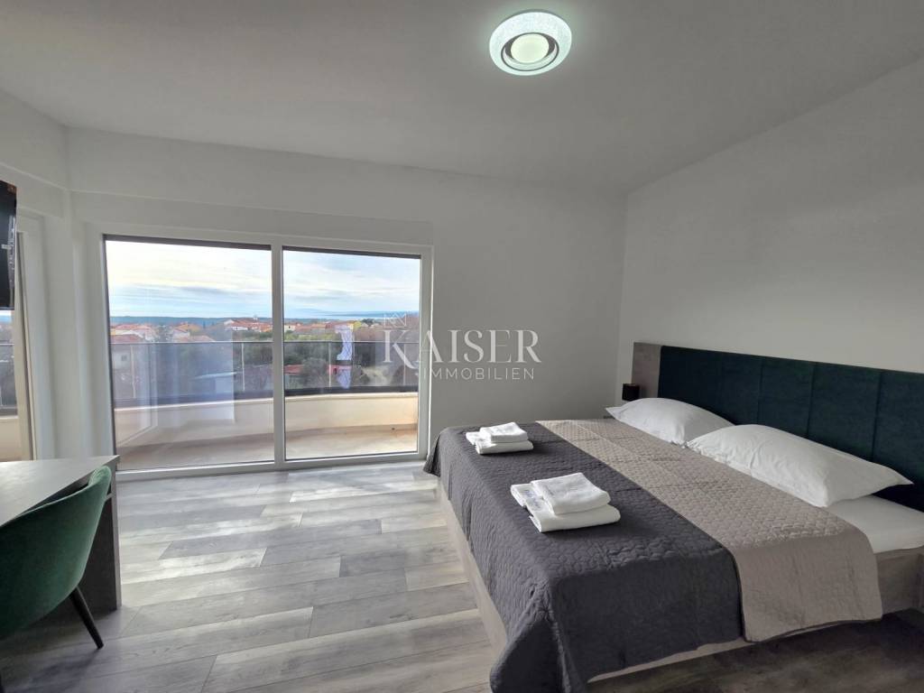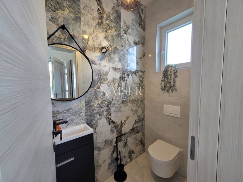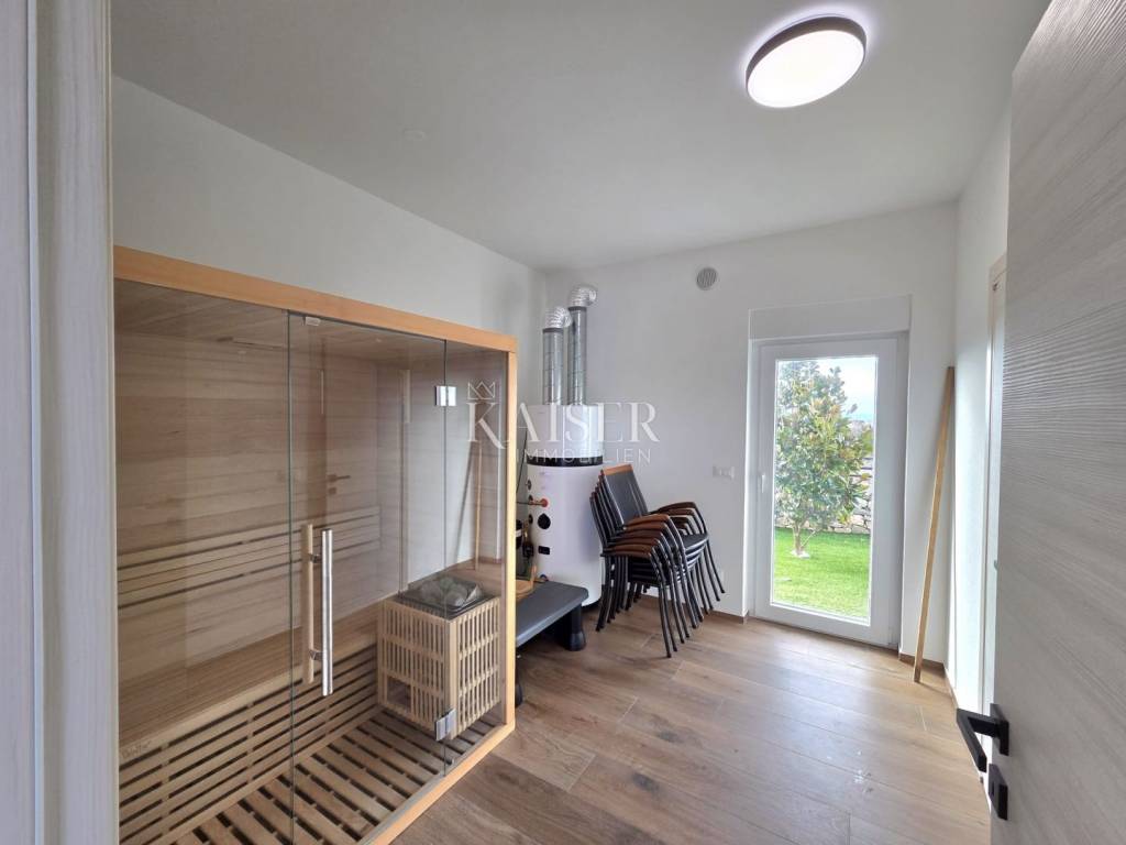 This detached villa with a southeast orientation and a total living area of 250m2 is spread over two floors. The ground floor has an open-concept living area with a kitchen, living room and dining room, a wellness room with a sauna and a bathroom, and a guest toilet. The wood-burning fireplace in the living room provides a cozy atmosphere in the winter months, and the exit to the spacious covered terrace allows you to expand the living space in the summer months. Internal stairs lead to the first floor where there are three bedrooms with bathrooms and a laundry room. All bedrooms have access to a glazed terrace with a panoramic view of the sea, Punat's cove and the islet of Košljun.