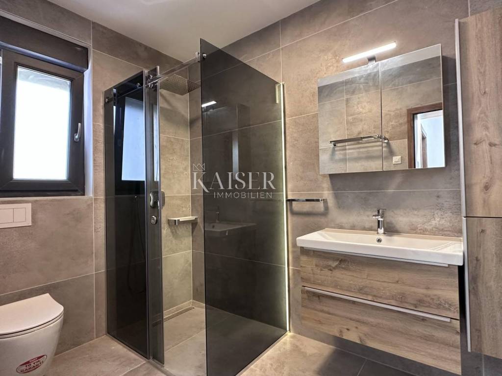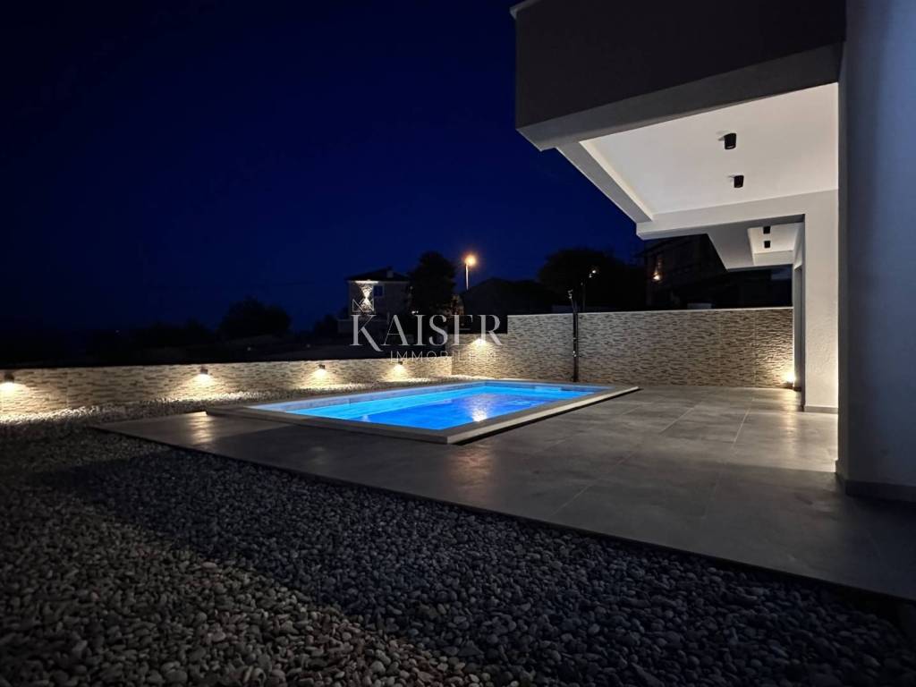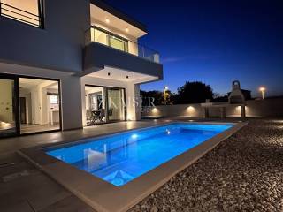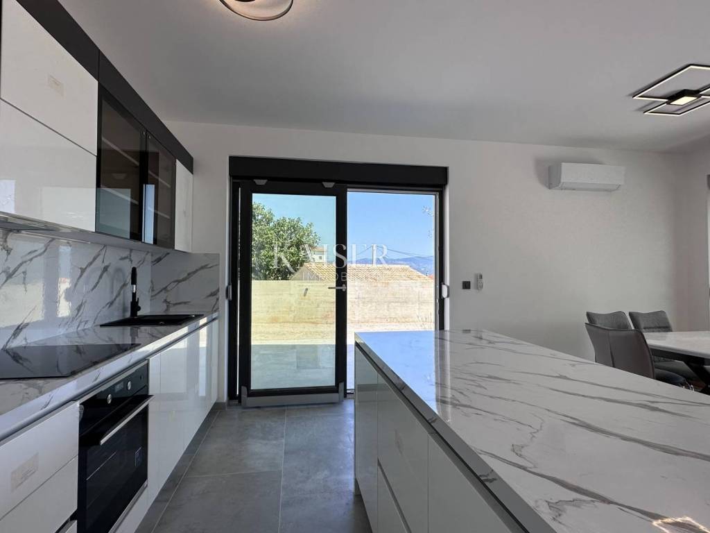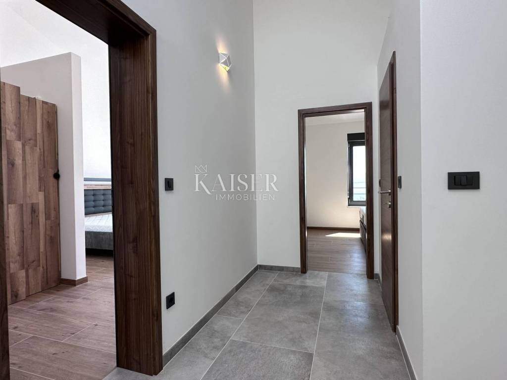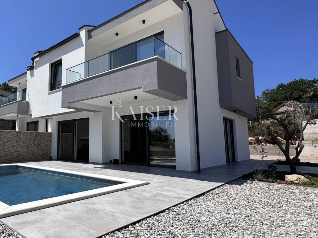 The real estate agency Kaiser Immobilien presents a luxurious semi-detached house in the vicinity of Vrbnik. The property consists of a ground floor and a first floor. On the ground floor there is a kitchen, which, together with the dining room and living room, represents a wonderful concept of open space with access to the terrace, which offers a spectacular view of the sea and the Northern Velebit, as well as the swimming pool located in front of the house. In addition to the mentioned rooms, there is also a toilet and a laundry room on the ground floor. On the first floor there are three bedrooms, two modern bathrooms, a wardrobe and a balcony with an unobstructed view of the beautiful landscape. Underfloor heating and air conditioners are installed in every room, which enables a pleasant stay throughout the year. In addition to the swimming pool, which adorns the garden, there is also a barbecue, and the garden itself is decorated in coastal style and is self-sustaining. It is dominated by beautiful plants such as olives, palms, rosemary, lavender and agave. The proximity to the sea is 1000 meters, which is a decent distance to enjoy the sea. There are also shops, public transport nearby and Vrbnik, as the nearest town, 5000 meters away, offers the opportunity to enjoy wonderful wines and restaurants.