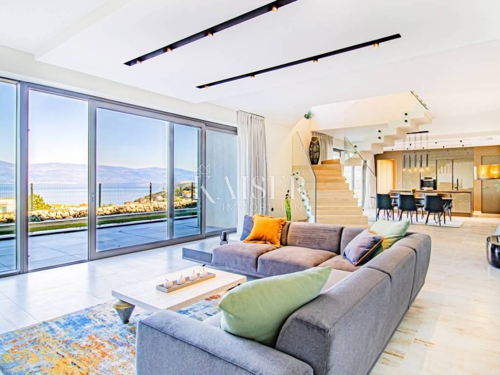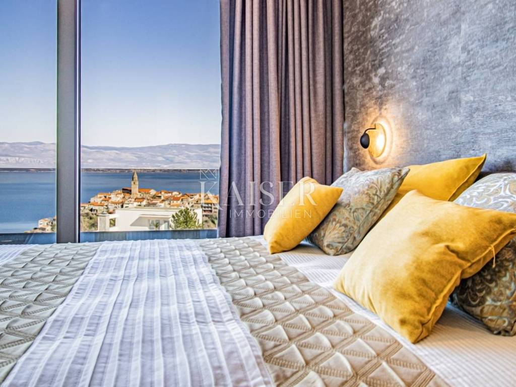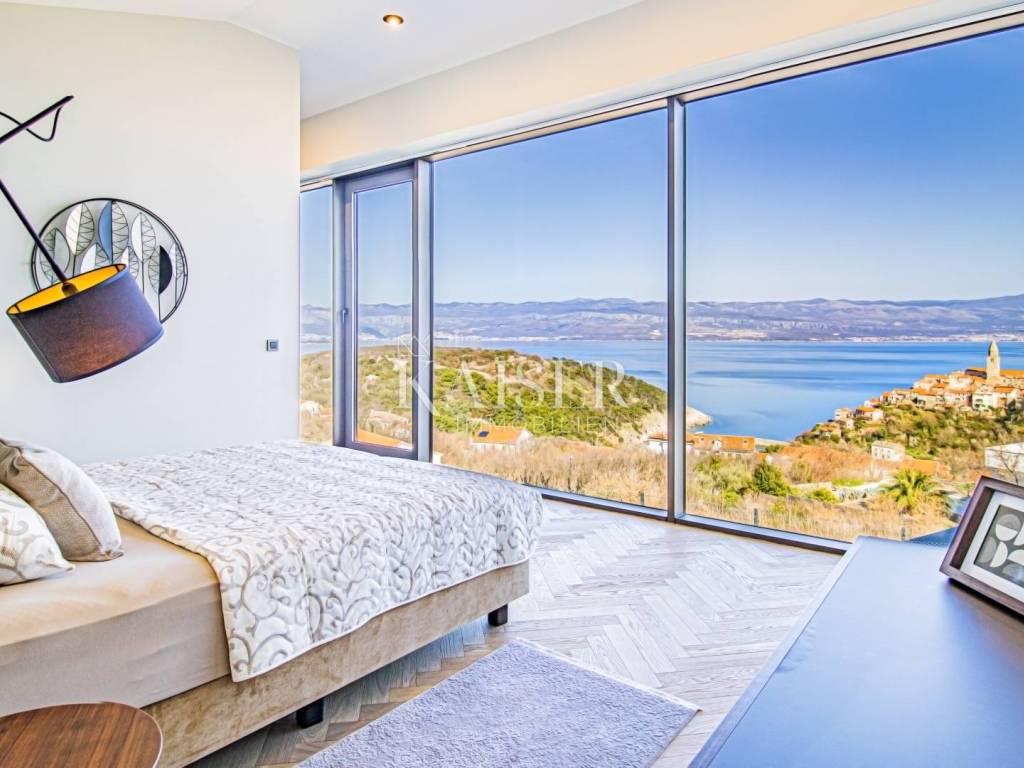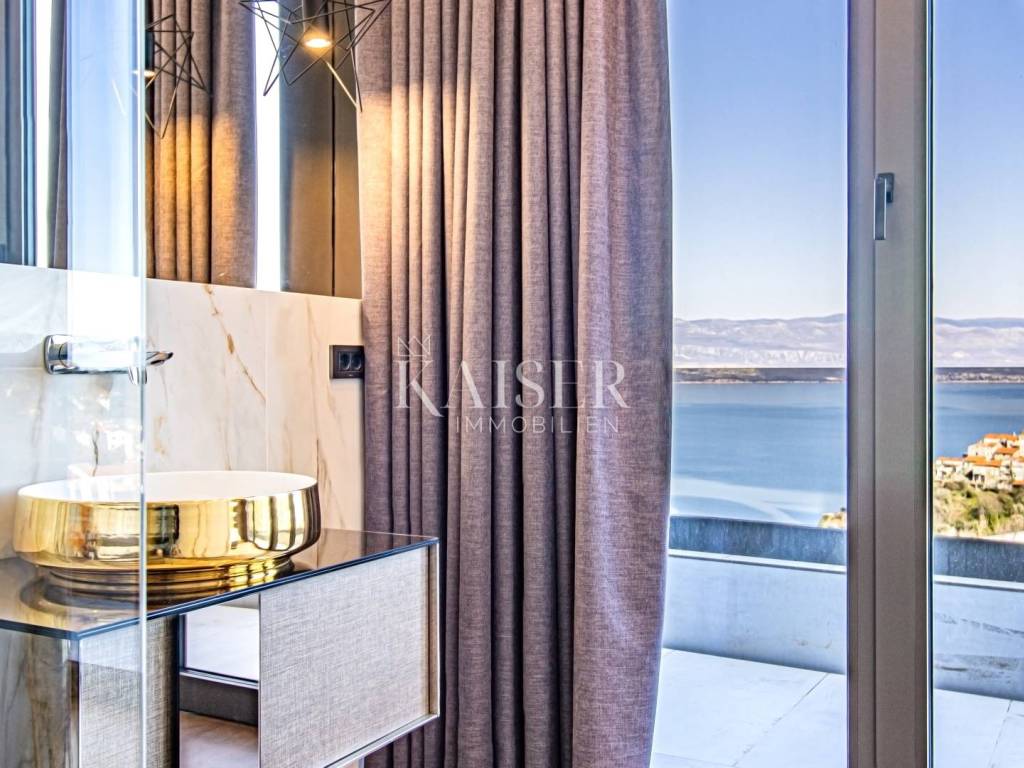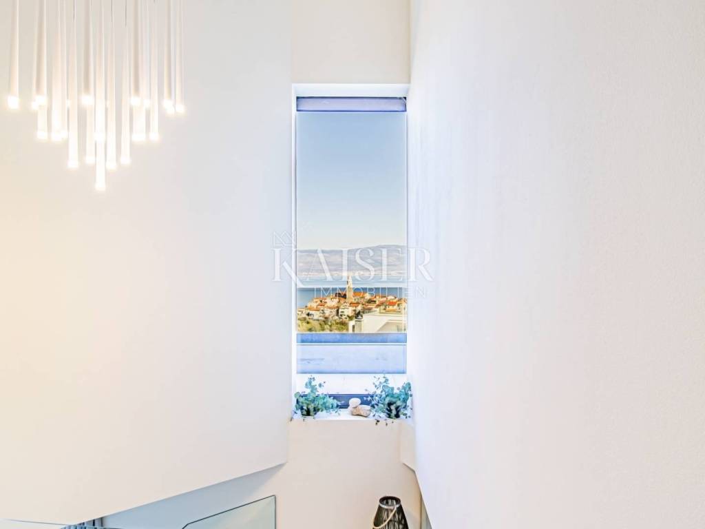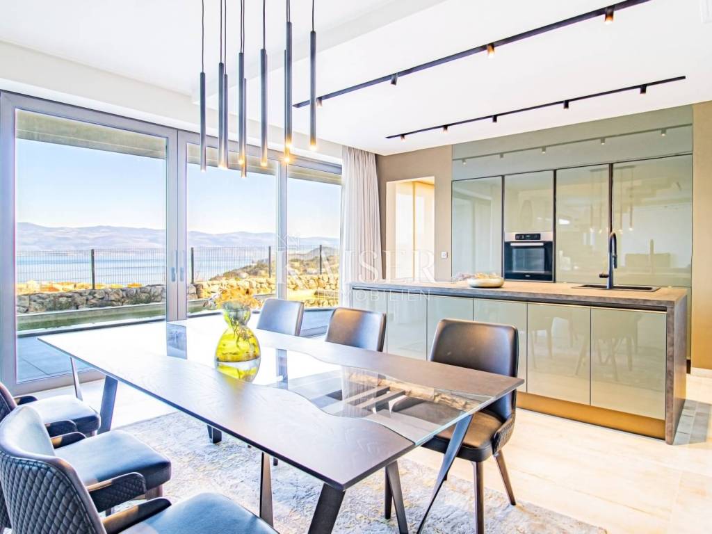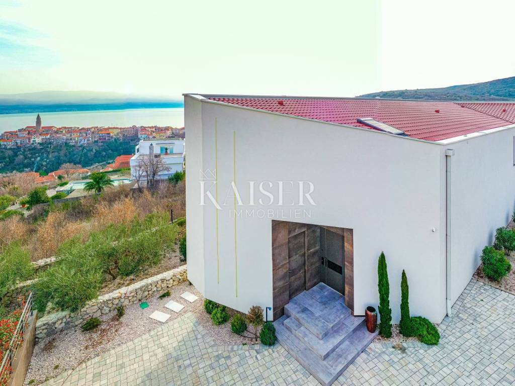 Immerse yourself in luxury and perfection of execution - Kaiser immobilien mediates in the sale of an exclusive villa in Vrbnik, the island of Krk. Vrbnik is undoubtedly one of the most famous Croatian towns, which, like other old castles on the island, is located high up, almost 50 meters high, and in a truly special place on a cliff that literally plunges into the sea. It was first mentioned in 1100. The inhabitants were mostly engaged in agriculture, less in shipping and fishing. Today, the most famous product of the Vrbnik field and Vrbnik in general is the golden yellow wine - Žlahtina; it has become famous in wider Croatia. According to the stories of older locals, before the wine gained fame, cereals were grown in the field to feed families that had more members than today. In such conditions, the vines were grown along the edges of the field because there was no market and the wine was produced only for their own needs. Vrbnik is still, mainly, a picnic spot, which is in some ways an advantage. With its rich history, Vrbnik is called the cradle of literacy among Croats and is certainly one of the oldest places on the island of Krk. Narrow streets prevail in Vrbnik, so it is not surprising that the narrowest street in the world is located right here. With its location and orientation, the villa seems to float above Vrbnik and its panoramic view of the sea and the picturesque thousand-year-old town is breathtaking. Located on a plot of 1,000m2, the total living area of 268m2 is spread over two floors. On the ground floor, next to the entrance area and hallway, there is an open-concept living area with a living room, kitchen and dining room. The living area is completely glazed with panoramic walls and top-quality aluminum joinery. On the ground floor there is also a separate wellness area with a sauna and "starry sky" ceiling lighting, as well as a guest toilet with a laundry room and storage room. The living area leads out onto a covered terrace next to which there is a heated 43m2 swimming pool with a shower and a sunbathing area. Upstairs there are three bedrooms with their own "en suite" bathrooms, all of which have access to a covered terrace with a glass fence. The entire building offers a panoramic view of the sea and the thousand-year-old town located on a cliff above the sea. This indescribable and almost endless view of the sea and Vrbnik, and the abundant presence of sunlight in the building, are greatly contributed to by the panoramic glass walls installed along the entire building, in the full height of the rooms. The covers of lifestyle magazines are guaranteed. Top-quality materials and equipment were used in the furnishing and construction. The building is built with Porotherm blocks, the STO facade system with 10cm of insulation was used. The flat roof has 20cm of thermal insulation, a TPO membrane in combination with the FIRESTONE system protects against moisture, and the roof windows are VELUX. Top-quality Italian ceramics from the manufacturer FLAVIKER, massive aluminum joinery from the manufacturer HEROAL in combination with LAMISTAL glass, and an entrance door with a triple lock and fingerprint unlocking from the manufacturer INOTHERM. VIESMANN heating, air conditioning and ventilation system. There is also a summer kitchen in the garden, and there is enough space in the driveway to park several vehicles. ID CODE 105-212 The agency commission for the buyer is 3% + VAT and is paid in the case of purchasing a property, upon conclusion of the first legal act.