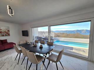 The semi-detached house is southwest-oriented, with a living area of 157m2 spread over two floors. On the ground floor, next to the entrance hall and the staircase leading to the first floor, there is a spacious open-concept living area, with access to a terrace covered with a pergola. The living area consists of a living room, kitchen and dining room. The functional layout of the rooms on the ground floor also includes two bedrooms, a bathroom, a toilet and a laundry room. On the first floor there are three bedrooms with their own "en suite" bathrooms. One of the special features of this property is the master bedroom, which, glazed with panoramic walls, seems to blend in with the environment, and with access to a spacious loggia with a panoramic view of the sea and islands, further enriches the living space.