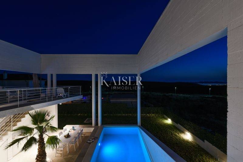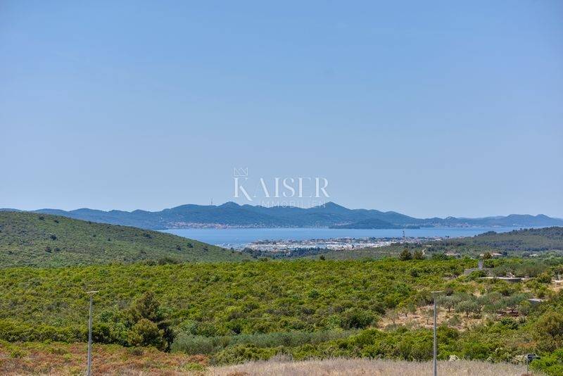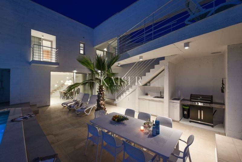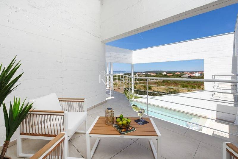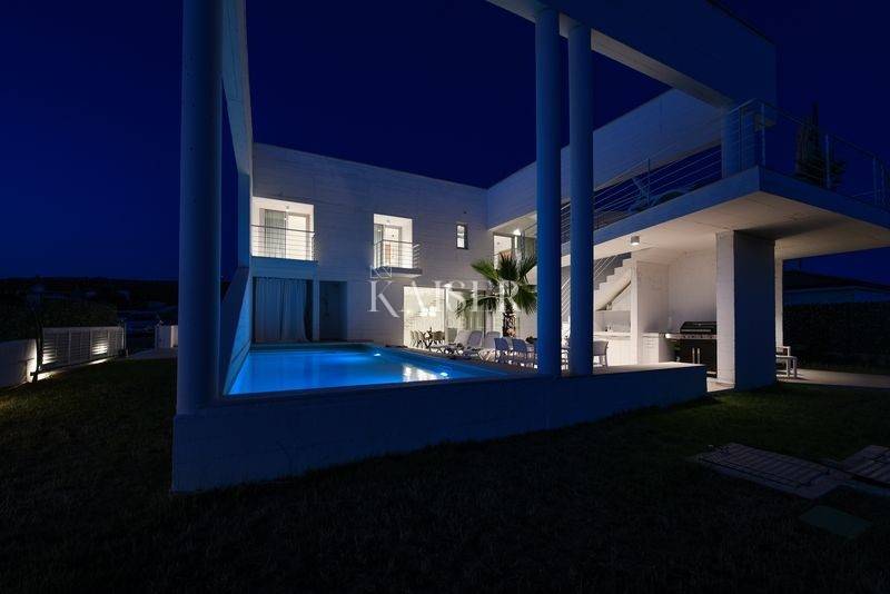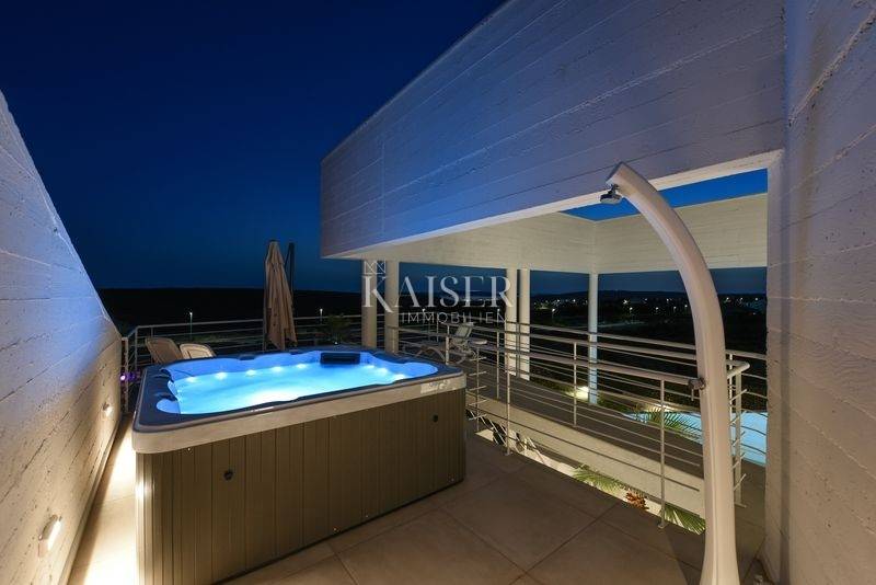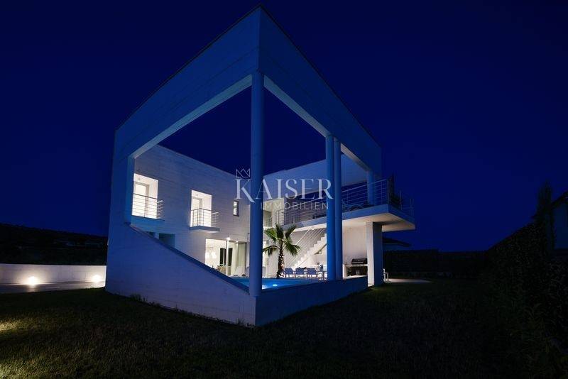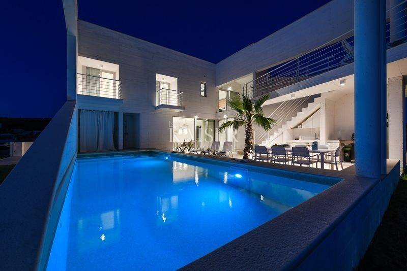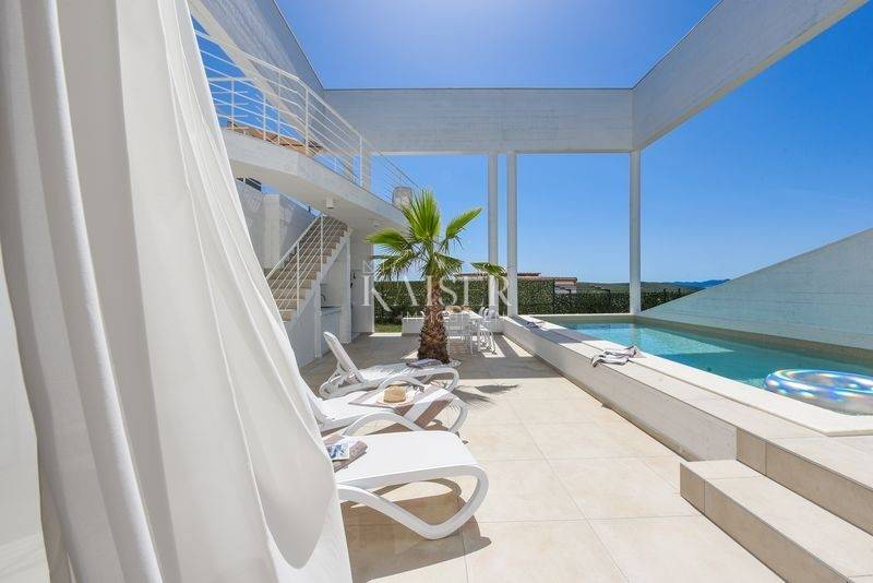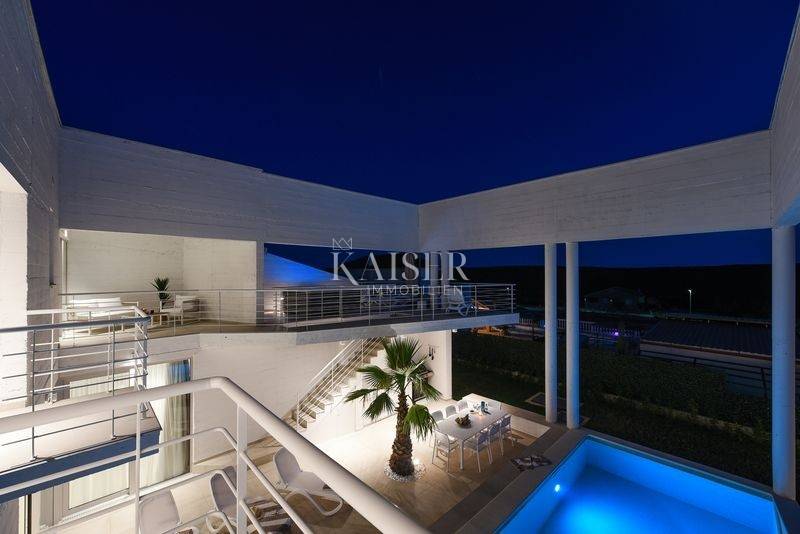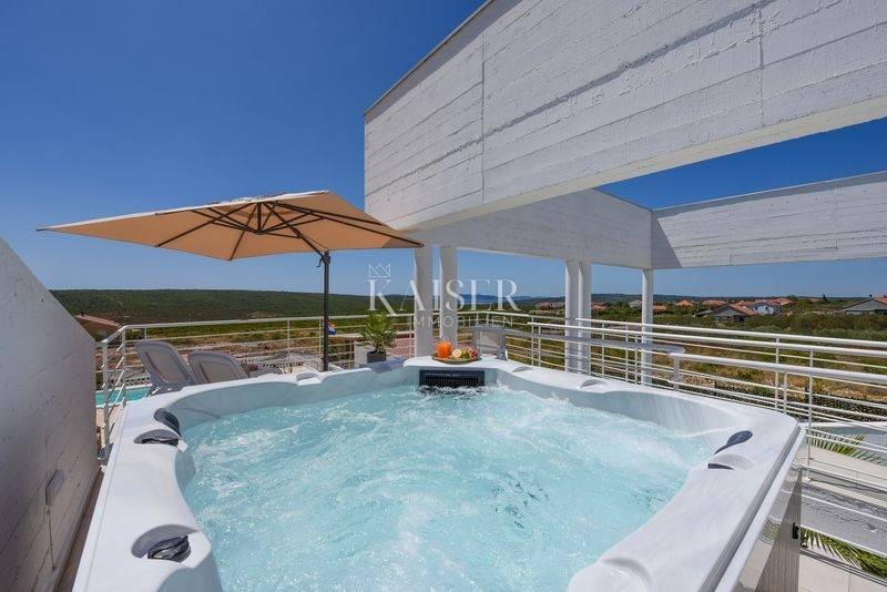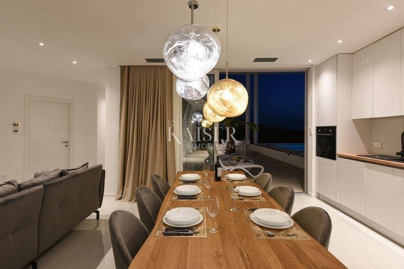 An architectural gem in the hinterland of Sukošan with a sea view Kaiser Immobilien proudly presents this luxurious white villa located in the quiet hinterland of Sukošan, in the Debeljak settlement. This contemporary villa is ideally positioned for lovers of nautical activities and life near the sea, given the immediate distance of Marina Dalmacija approx. 6 km, Kornati and Zadar, and yet far enough away from the hustle and bustle of the tourist crowd, providing complete peace and privacy. The villa is based on a pure volume of white, with an emphasis on functionality and visual clarity. The enclosing walls create an introverted courtyard space that becomes part of the house, allowing the interpenetration of indoor and outdoor space, which is key for outdoor living in the Dalmatian climate. In this white volume, the horizon of the house extends from the ground floor to the floor above the pool to sunbathe and warm it. On the floor above the pool there is a jacuzzi and terraces that are reminiscent of being on the deck of a ship, providing a panoramic view of the sea from the north side. The space is designed to allow for outdoor living throughout most of the year, while the archaic spatial plan is satisfied with the archetypal volume of a house with a sloping roof. With one detail (horizontal traces of wooden battens in white plaster), she underlined the idea of volume and structural elements, making it clearer to the eye. In the process of building with reinforced concrete, the villa showed spatial values, so the task of different methods of facade treatment was, of course, in the function of the visual. Life can be very beautiful, and the architecture of this villa anticipated this, creating a pleasant space on 500 m2 of garden and 220 m2 of living space, today a place of comfort, pure hedonism, the habitat of a modern nomad. The white villa consists of a ground floor and an upper floor. On the ground floor of this modern villa is a bright and functional kitchen in white, equipped with the latest appliances and an elegant work surface. The kitchen is connected to the spacious dining room and living room, creating an open space that allows for unhindered interaction and a pleasant stay. This space is ideal for family gatherings and entertaining friends. A hallway leads from the living room that connects the rest of the ground floor. Here is the bedroom with its own bathroom, providing privacy and comfort. The bedroom is bathed in sunlight with large glass walls that provide access to the terrace and direct access to the southern part of the yard, ideal for enjoying the outdoors. The ground floor also features a spacious storage room that offers additional storage space, and a guest toilet for added comfort and convenience. From the open-concept living area, through glass walls, you can exit to a spacious terrace that extends along the edge of the pool. This space serves as an extension of the interior, allowing a smooth transition between indoor and outdoor life. During warm days, the terrace becomes an ideal place to relax and enjoy the sun. The pool is a full-fledged design element that boldly penetrates the volume of the house, communicating with all the open and closed spaces of the ground floor. This approach allows for the integration of indoor and outdoor space, creating a harmonious whole. An elegant glass staircase that combines functionality and aesthetics leads you to the upper floor of the villa. At the top of the staircase is a photosensitive glass wall that allows light to penetrate from the south, further illuminating the floor. This wall, although transparent, provides intimacy because it is invisible from the outside, while from the inside it allows a view to the outside. This design element not only contributes to the energy efficiency of the house, but also creates a sense of connection with the environment, despite the preserved privacy. A hallway connects three luxurious bedrooms. Each room has its own bathroom, and glass walls provide access to private terraces overlooking the pool and the environment. This design allows for a fluid connection between the interior and the exterior, creating a sense of airiness and openness. Via the upper sundeck and jacuzzi and shower area, an open staircase leads down to the lower terrace. The villa is equipped with an advanced air conditioning and ventilation system, ensuring optimal comfort throughout the year. All interiors are connected by a ventilation system that allows for even air distribution, thus achieving a fresh and pleasant ambiance in all rooms. For air conditioning, the villa is equipped with five indoor Mitsubishi Electric air conditioners, connected to two outdoor units. This system allows for efficient cooling and heating of all rooms, adapting to the different temperature needs of each space. This integrated air conditioning and ventilation system allows the villa to maintain optimal living conditions, providing comfort and an energy-efficient solution for all users. The villa is equipped with an underfloor heating system that allows for even heating of the rooms, living room and bedrooms. On the roof of the villa there are two solar collectors that allow for efficient heating of domestic hot water throughout the year. These collectors use solar energy to heat the water, thus reducing the need for conventional energy sources and contributing to the sustainability of the house. This architectural gem in the hinterland of Sukošan with a view of the sea and the island of Ugljan is perfect for those who value peace and privacy, and want to stay in close proximity to the picturesque coastline. The villa is located in the middle of untouched nature, field paths and an area ideal for walks or cycling, great for hiking and mini-adventures, running and cycling. The villa is sold fully furnished. Significant distances: Kornati 10–15 km as the crow flies, depending on the access point on land (most often D Marina Su