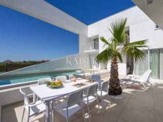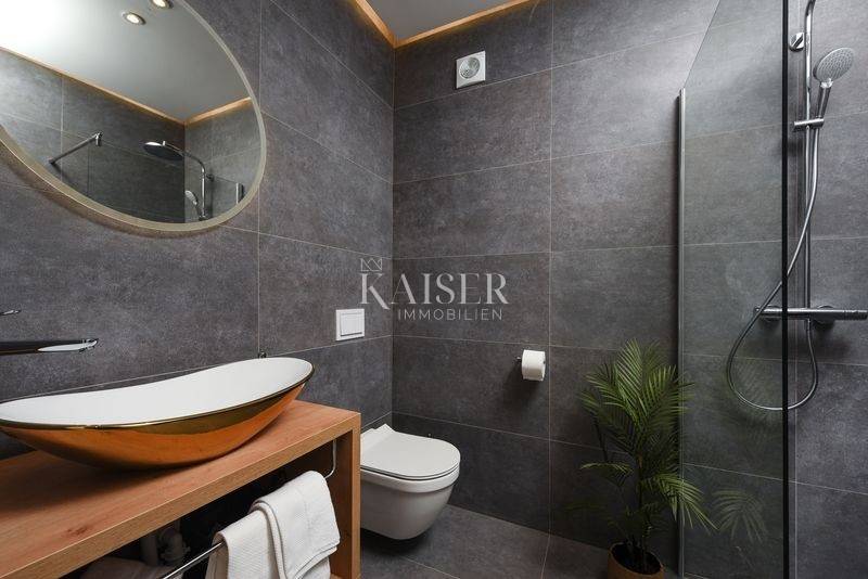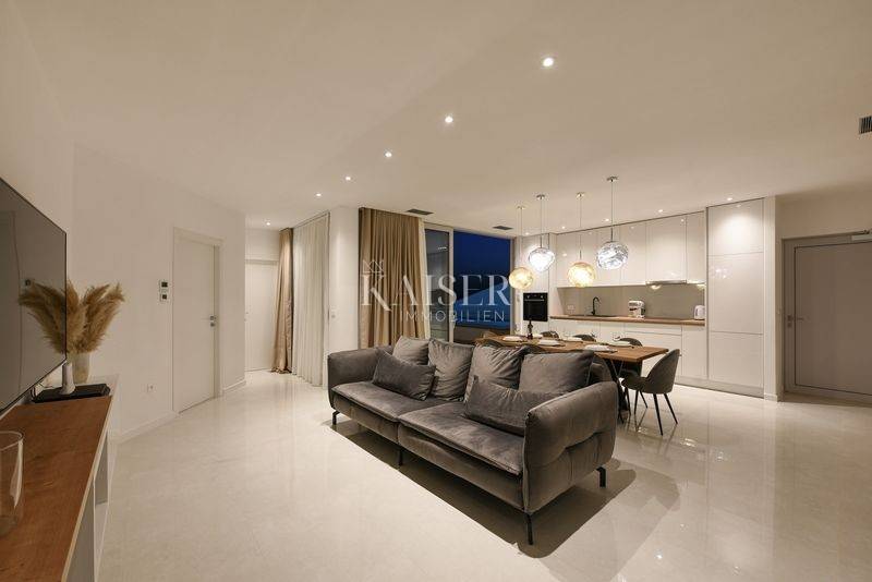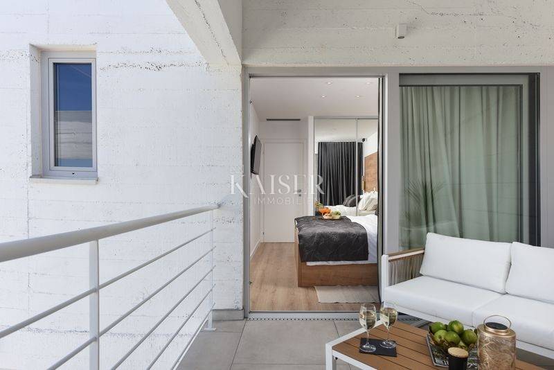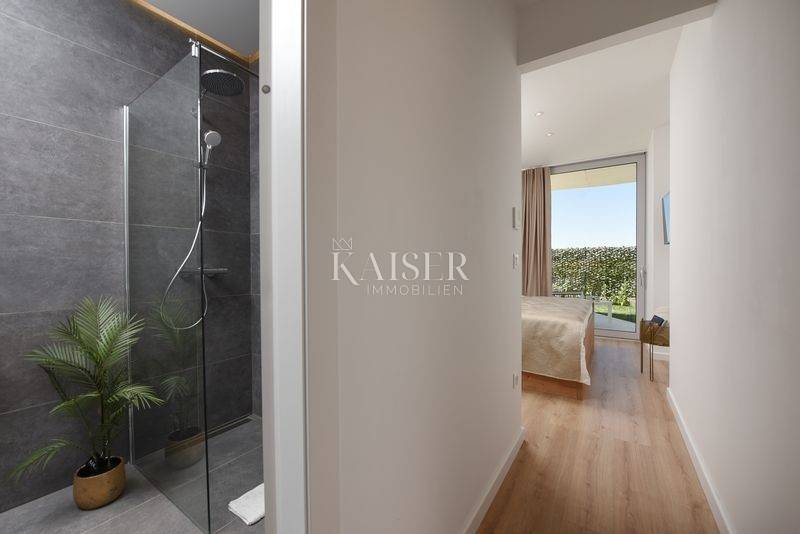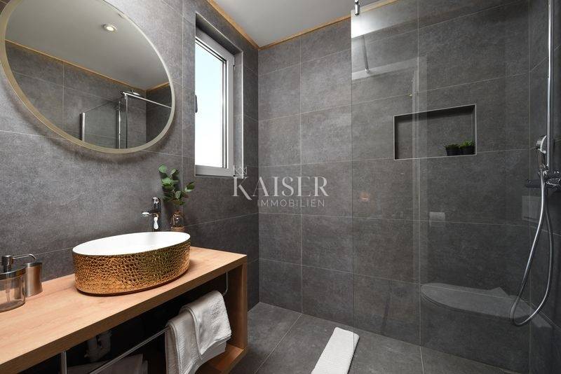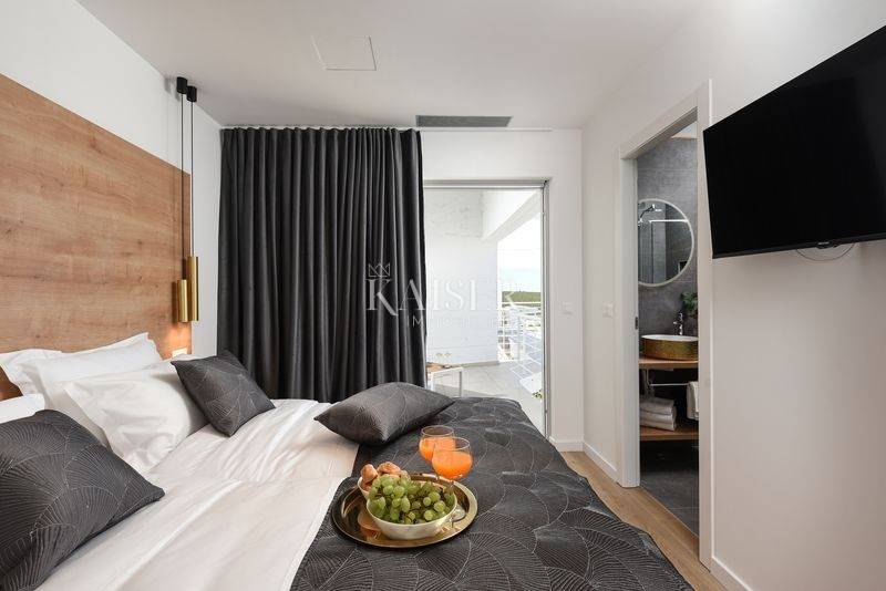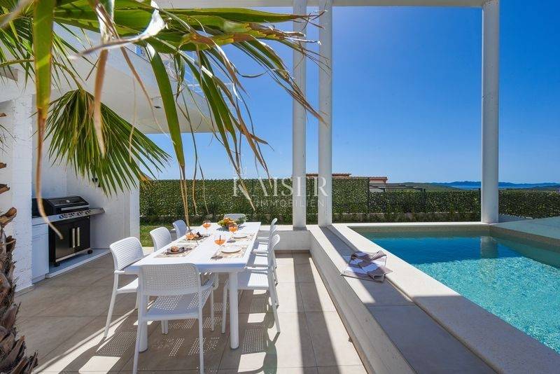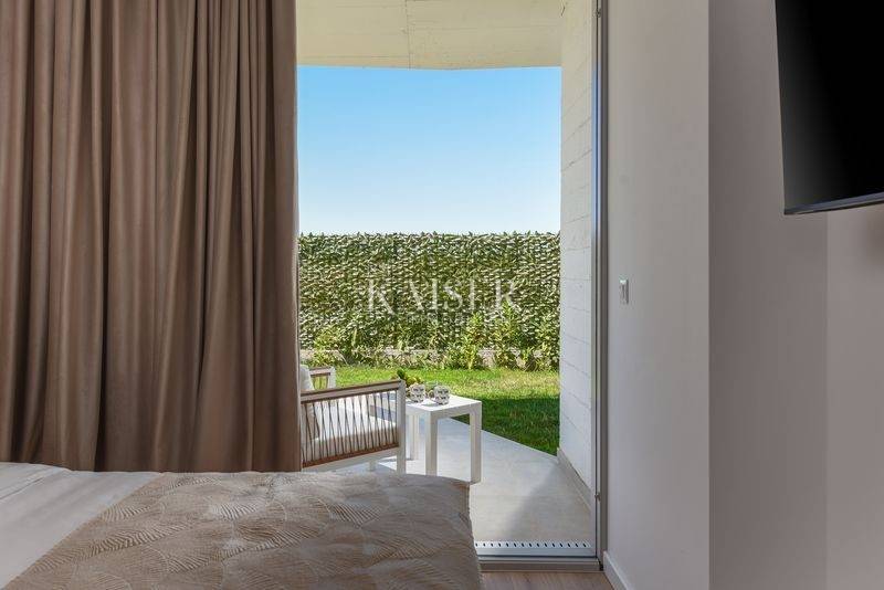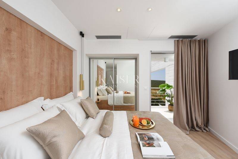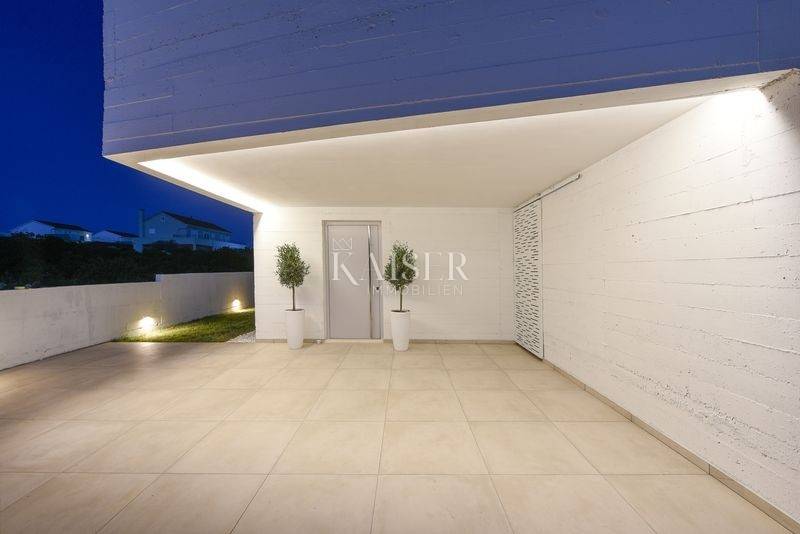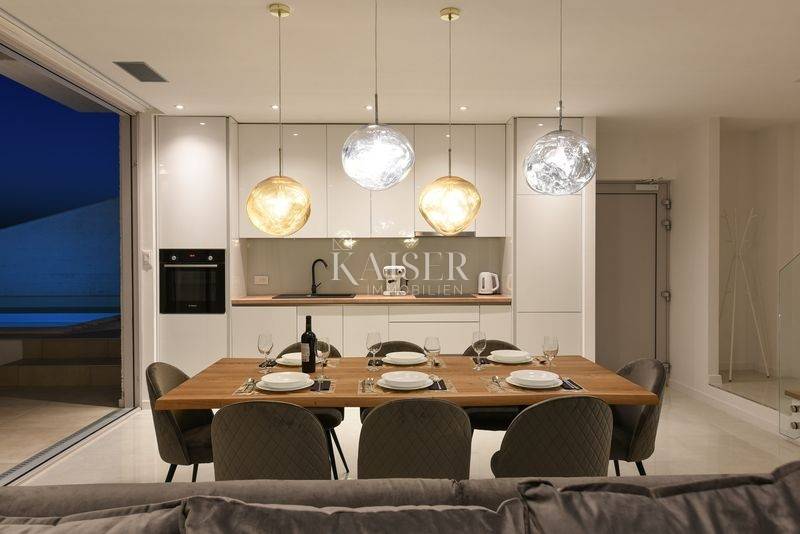 An architectural gem in the hinterland of Sukošan with a sea view Kaiser Immobilien proudly presents this luxurious white villa located in the quiet hinterland of Sukošan, in the Debeljak settlement. This contemporary villa is ideally positioned for lovers of nautical activities and life near the sea, given the immediate distance of Marina Dalmacija approx. 6 km, Kornati and Zadar, and yet far enough away from the hustle and bustle of the tourist crowd, providing complete peace and privacy. The villa is based on a pure volume of white, with an emphasis on functionality and visual clarity. The enclosing walls create an introverted courtyard space that becomes part of the house, allowing the interpenetration of indoor and outdoor space, which is key for outdoor living in the Dalmatian climate. In this white volume, the horizon of the house extends from the ground floor to the floor above the pool to sunbathe and warm it. On the floor above the pool there is a jacuzzi and terraces that are reminiscent of being on the deck of a ship, providing a panoramic view of the sea from the north side. The space is designed to allow for outdoor living throughout most of the year, while the archaic spatial plan is satisfied with the archetypal volume of a house with a sloping roof. With one detail (horizontal traces of wooden battens in white plaster), she underlined the idea of volume and structural elements, making it clearer to the eye. In the process of building with reinforced concrete, the villa showed spatial values, so the task of different methods of facade treatment was, of course, in the function of the visual. Life can be very beautiful, and the architecture of this villa anticipated this, creating a pleasant space on 500 m2 of garden and 220 m2 of living space, today a place of comfort, pure hedonism, the habitat of a modern nomad. The white villa consists of a ground floor and an upper floor. On the ground floor of this modern villa is a bright and functional kitchen in white, equipped with the latest appliances and an elegant work surface. The kitchen is connected to the spacious dining room and living room, creating an open space that allows for unhindered interaction and a pleasant stay. This space is ideal for family gatherings and entertaining friends. A hallway leads from the living room that connects the rest of the ground floor. Here is the bedroom with its own bathroom, providing privacy and comfort. The bedroom is bathed in sunlight with large glass walls that provide access to the terrace and direct access to the southern part of the yard, ideal for enjoying the outdoors. The ground floor also features a spacious storage room that offers additional storage space, and a guest toilet for added comfort and convenience. From the open-concept living area, through glass walls, you can exit to a spacious terrace that extends along the edge of the pool. This space serves as an extension of the interior, allowing a smooth transition between indoor and outdoor life. During warm days, the terrace becomes an ideal place to relax and enjoy the sun. The pool is a full-fledged design element that boldly penetrates the volume of the house, communicating with all the open and closed spaces of the ground floor. This approach allows for the integration of indoor and outdoor space, creating a harmonious whole. An elegant glass staircase that combines functionality and aesthetics leads you to the upper floor of the villa. At the top of the staircase is a photosensitive glass wall that allows light to penetrate from the south, further illuminating the floor. This wall, although transparent, provides intimacy because it is invisible from the outside, while from the inside it allows a view to the outside. This design element not only contributes to the energy efficiency of the house, but also creates a sense of connection with the environment, despite the preserved privacy. A hallway connects three luxurious bedrooms. Each room has its own bathroom, and glass walls provide access to private terraces overlooking the pool and the environment. This design allows for a fluid connection between the interior and the exterior, creating a sense of airiness and openness. Via the upper sundeck and jacuzzi and shower area, an open staircase leads down to the lower terrace. The villa is equipped with an advanced air conditioning and ventilation system, ensuring optimal comfort throughout the year. All interiors are connected by a ventilation system that allows for even air distribution, thus achieving a fresh and pleasant ambiance in all rooms. For air conditioning, the villa is equipped with five indoor Mitsubishi Electric air conditioners, connected to two outdoor units. This system allows for efficient cooling and heating of all rooms, adapting to the different temperature needs of each space. This integrated air conditioning and ventilation system allows the villa to maintain optimal living conditions, providing comfort and an energy-efficient solution for all users. The villa is equipped with an underfloor heating system that allows for even heating of the rooms, living room and bedrooms. On the roof of the villa there are two solar collectors that allow for efficient heating of domestic hot water throughout the year. These collectors use solar energy to heat the water, thus reducing the need for conventional energy sources and contributing to the sustainability of the house. This architectural gem in the hinterland of Sukošan with a view of the sea and the island of Ugljan is perfect for those who value peace and privacy, and want to stay in close proximity to the picturesque coastline. The villa is located in the middle of untouched nature, field paths and an area ideal for walks or cycling, great for hiking and mini-adventures, running and cycling. The villa is sold fully furnished. Significant distances: Kornati 10–15 km as the crow flies, depending on the access point on land (most often D Marina Su