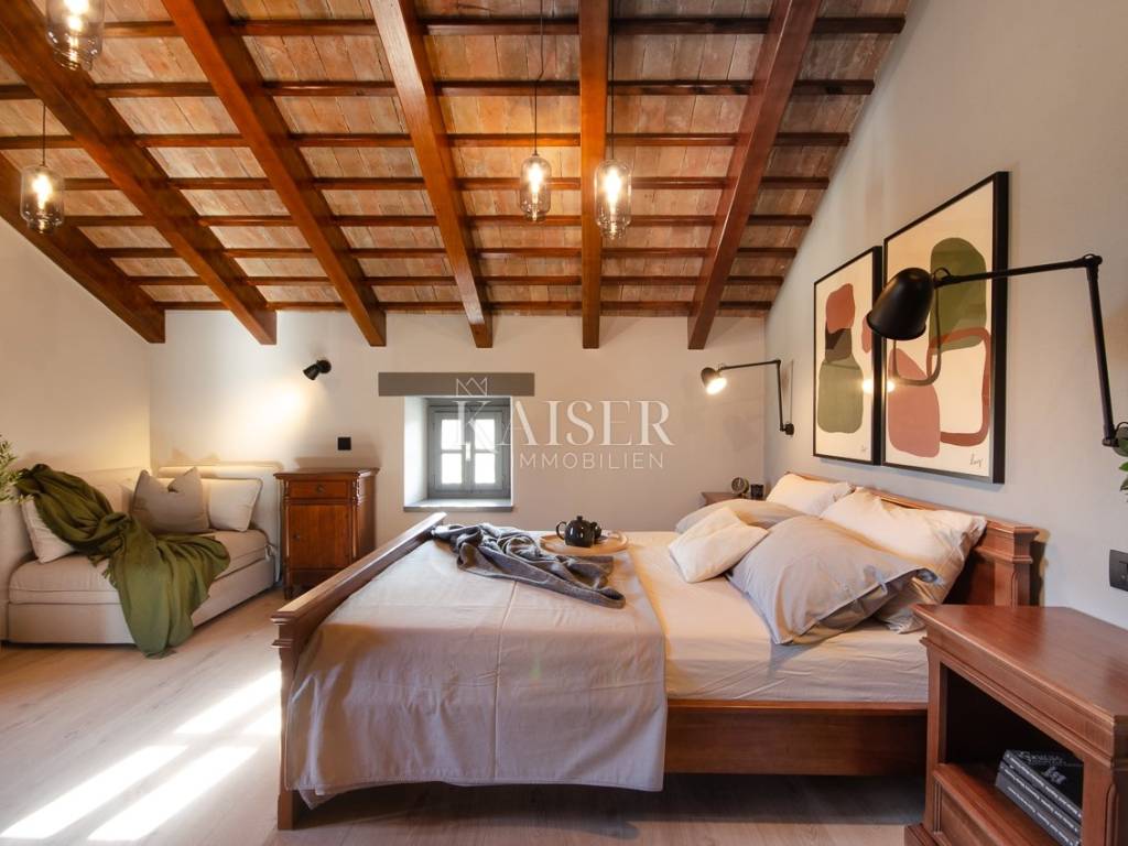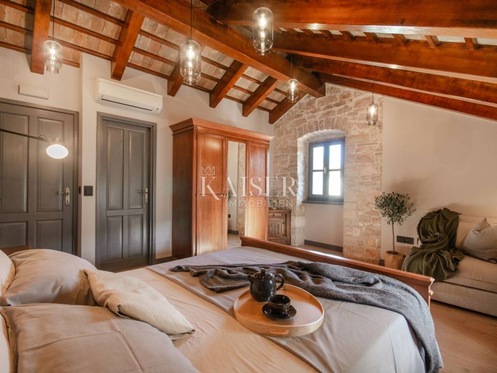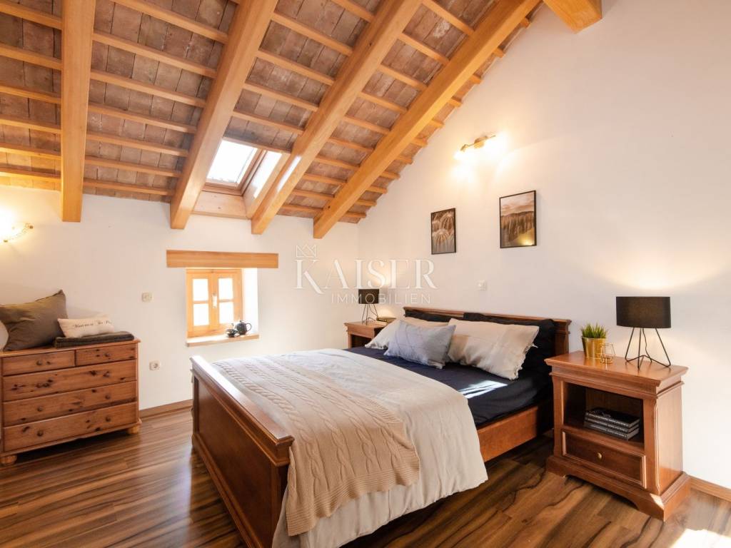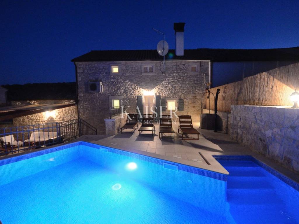 Rovinj, the pearl of Istria, is one of the most charming coastal towns on the Adriatic. Picturesque stone streets, the recognizable bell tower of the Church of St. Euphemia and the picturesque coast create a unique Mediterranean atmosphere. This historic town offers a rich cultural heritage, top-notch gastronomic experiences and crystal clear sea, making it a perfect destination for vacation and life. Kaiser Immobilien presents you with a charming, fully renovated stone house of 170 m², located in a very quiet location near Rovinj, surrounded by nature and a pleasant neighborhood. This elegant Istrian house, a combination of traditional charm and modern comfort, is ideal for a quiet family life or as an investment for tourist rental. The house is spread over three floors - ground floor and two upper floors. The entrance leads via a large covered terrace into a cozy living room of about 25 m², equipped with a TV and a large stone fireplace that gives the space a special atmosphere of warmth and authenticity. From the living room, a staircase leads to the upper floors, while to the right is a spacious kitchen with a dining area of approximately 25 m². The kitchen is fully equipped with all the necessary appliances – a Candy oven, a four-burner gas stove, a dishwasher, a hood and a refrigerator, and everything is decorated in a rustic style, in keeping with the character of the entire house. On the first floor there are two bedrooms, each with its own bathroom – one with a shower, the other with a bathtub. The rooms are approximately 15 m² in size, and the hallway leads to the back terrace overlooking the courtyard. On the same level there is a 24 m² swimming pool with a sunbathing area and an additional lower-level terrace with access to the road. On the second floor there are two more stylishly decorated bedrooms, also each with its own bathroom equipped with a shower and toilet. The house also has a storage room of 20 m², very practical for storing things. The complete renovation was carried out in 2013, during which a new roof with a structure was installed, reinforced concrete interfloor slabs were installed, new electricity, water and central heating installations were installed, new air conditioning, floor and wall coverings, joinery and furniture. The swimming pool uses a salt electrolysis system and has the possibility of heating. Hot water is provided by solar collectors and a 300-liter boiler with the possibility of additional heating by electricity. Heating and cooling are solved using a Daikin inverter multi-split system with five indoor and two outdoor units, and there is also preparation for central radiator heating. The living room is additionally decorated with a brick fireplace. The house is equipped with optical internet and an alarm system, and it also has a garden of 120 m², arranged as a children's playground, with direct access from outside the yard. This property represents an excellent investment because it is successfully rented out or the perfect home for those looking for peace, comfort and an authentic Istrian ambience, in the immediate vicinity of Rovinj and Rovinjsko Selo, with restaurants, cafes, shops and beautiful surrounding nature. What's nearby: Restaurant: 2.8 km Beach: 9 km Shop: 2.6 km Cafe: 2.6 km Pharmacy: 2.6 km Lim Canal - 3 km Dvigrad Castle: 6 km St. Euphemia: 8 km Rovinj Aquarium: 10 km Matošević Winery (cafe & winery): 7 km Morosini-Grimani Castle: 12 km Punta Corrente Park: 12 km Dušan Džamonja Sculpture Park: 17 km Train - Kanfanar: 7 km Rovinjsko Selo: 2 km Rovinj: 8 km Pula Airport: 34 km Distance from major cities: Rovinj- Ljubljana: 186 km Rovinj- Vienna: 567 km Rovinj- Budapest: 591 km Rovinj- Prague: 838 km Rovinj- Munich: 587 km Rovinj- Zagreb: 250 km The agency commission for the buyer is 3% + VAT and is paid in the case of purchasing a property, upon conclusion of the first legal act. Interested buyers can view the property only after signing a real estate brokerage contract. ID-CODE: 127-181 If you would like to visit the property in person, please contact: Jennifer Hofmann E-mail: jennifer@kaiser-immobilien.hr Tel: +385-91-515-0887
