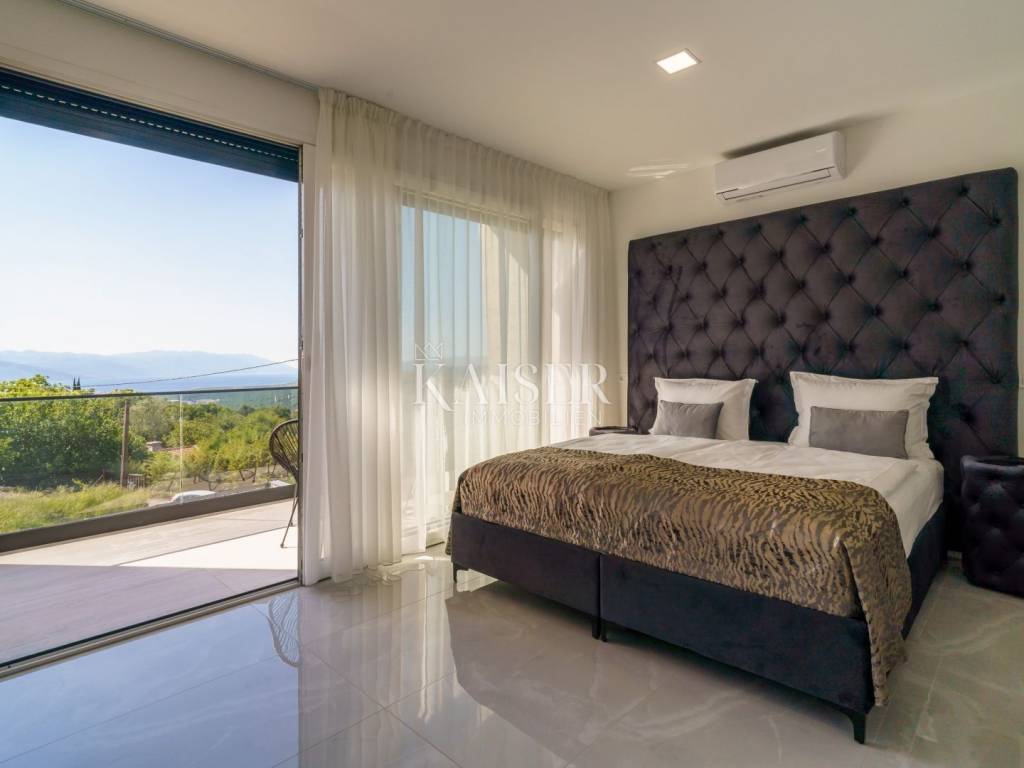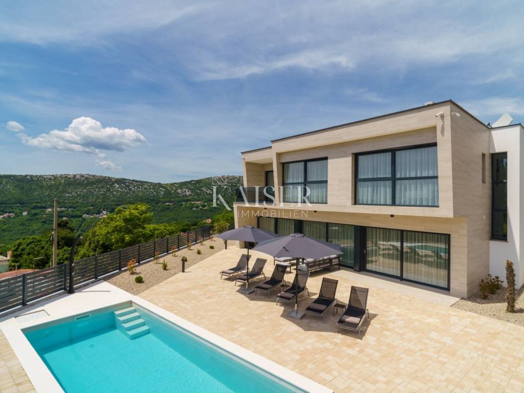 Kaiser Immobilien presents a beautiful villa in the hinterland of Novi Vinodolski and Crikvenica, in the town of Bribir. This villa is only 5 kilometers from the sea, and offers a beautiful view of the Vinodol valley and the sea. The total living area is 169.50m2, and it is sold fully furnished. It is a new building with carefully designed details, and consists of a ground floor and first floor connected by internal stairs. On the ground floor there is a spacious living room, kitchen with dining room and bathroom, while on the first floor there are three elegantly decorated bedrooms, each with its own bathroom and air conditioning, while one has access to a balcony with a sea view. The facade of the villa is a combination of ceramics and facade, while 10th insulation was used. The entire villa has electric underfloor heating (Vaillant), and is equipped with cameras and an alarm. The joinery is PVC with electric lifts and mosquito nets. There is ceiling air conditioning on the ground floor, while on the first floor there are Gree air conditioning. The bathroom is equipped with Geberit and Grohe bathroom equipment, while the kitchen is equipped with AEG equipment and appliances. The garden area is 660m2, and consists of a garden with a swimming pool whose area is 20m2. The pool has its own engine room. There are several parking spaces in the garden. This villa is a perfect opportunity for those looking for a luxurious home in a quiet environment with a beautiful sea view. Right next to this villa, another one of the same project, with the same equipment, size and price was built. The property is currently used for tourism. The documentation is in order and a loan purchase is possible. Location: Sea - 5000m Center - 500m For all questions, please contact the agent: Davor Piškulić davor@kaiser-immobilien.hr +00 385 95 583 8240 WhatsApp, Viber