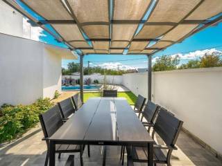 In a quiet location near the town of Krk, a detached modern house with a total area of approximately 170 m² is for sale, located on a plot of 521 m². The house consists of a ground floor and an upper floor. The ground floor has an open space that includes a living room, kitchen and dining room, then a storage room and a guest toilet. Upstairs there are four bedrooms, each with its own bathroom and access to a terrace. The property is being sold fully furnished and equipped. The garden is beautifully landscaped and includes a swimming pool, a sunbathing area and 3 secured parking spaces. The location offers peace and privacy, while at the same time providing quick connections to larger places on the island, which can be reached in approximately ten minutes by car.