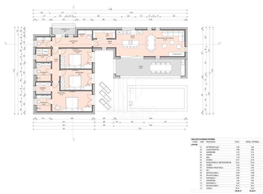 Prizemnica se sastoji od natkrivenog ulaza, hodnika koji spaja sve prostorije, tri spavaće sobe od kojih master spavaća soba ima svoju kupaonicu i walk in ormar, a ostale sobe dijele vanjsku kupaonicu, gostinjski wc, spremište i open space kuhinja povezana s blagovaonom i dnevnim boravkom.