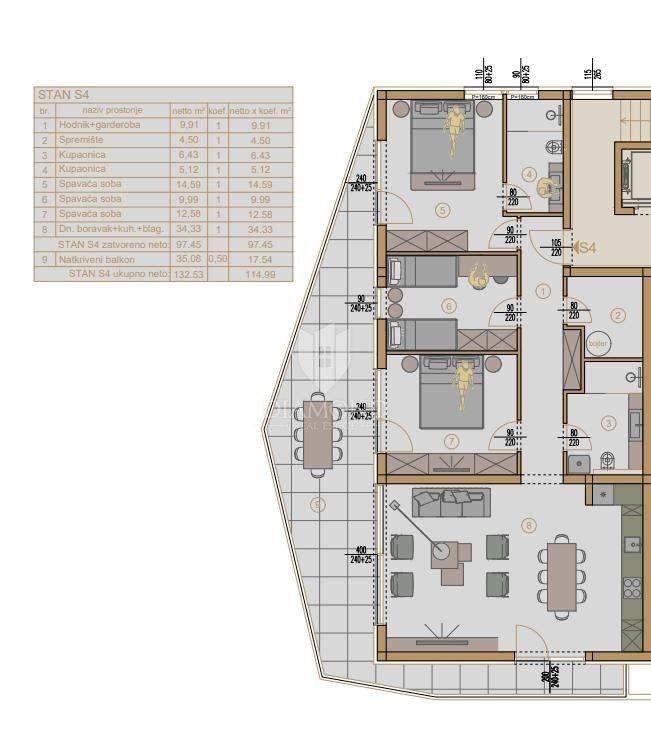 This beautiful apartment will consist of a hallway with a wardrobe, three bedrooms, two of which have access to a spacious terrace, two bathrooms, a pantry, a living room connected to the kitchen and a dining room that also have access to the terrace, which makes the total square footage of the apartment from 115 m2. The apartment also comes with two parking spaces, which can be chosen between garage or outdoor and are additionally charged.