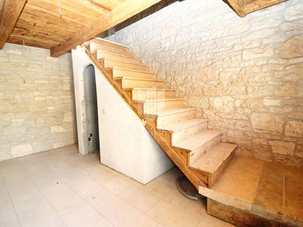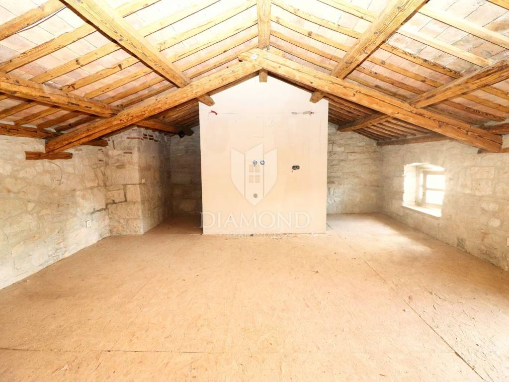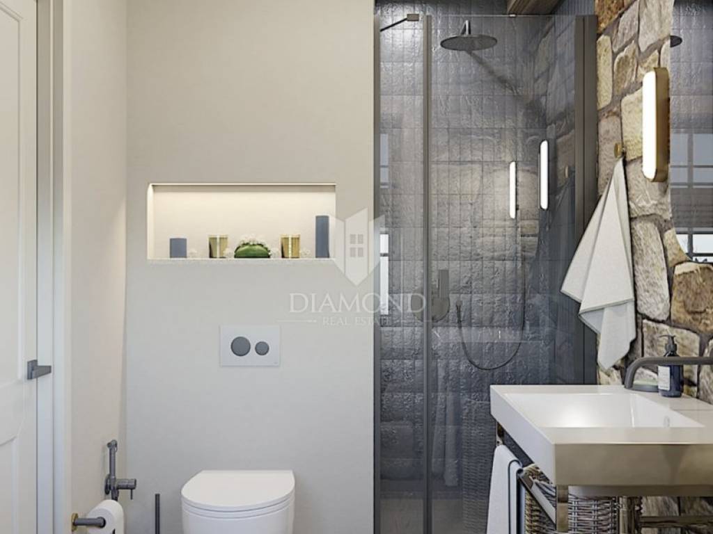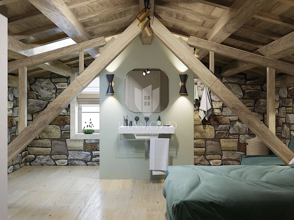 Just 9 km from Poreč and the most beautiful beaches, an authentic Istrian stone house is for sale, currently being converted into a villa with a pool. The villa spans multiple levels. The basement is designed as a wine room, which the future owner can arrange according to their wishes. The ground floor consists of a living room, kitchen with dining area, and guest toilet. An internal staircase leads to the first floor with two bedrooms, each with its own bathroom, one of which has access to a covered terrace. In the high attic, there are two more bedrooms, each with its own bathroom. An electric fireplace in the living room provides ambiance, and the entire ground floor has underfloor heating powered by a heat pump, with air conditioning for heating and cooling installed in every room. The entire interior is rustically decorated, maintaining a touch of the past. During renovation, attention was paid to every detail, preserving the original stone parts. The garden features a pool and a sauna. The villa is sold partially furnished, with an equipped kitchen, equipped bathrooms, and a guest toilet.