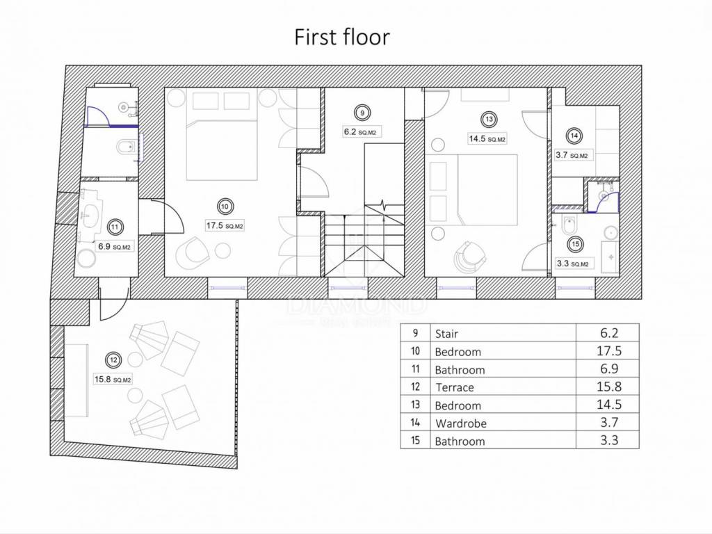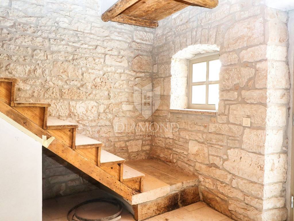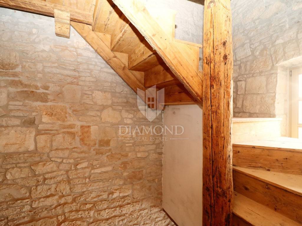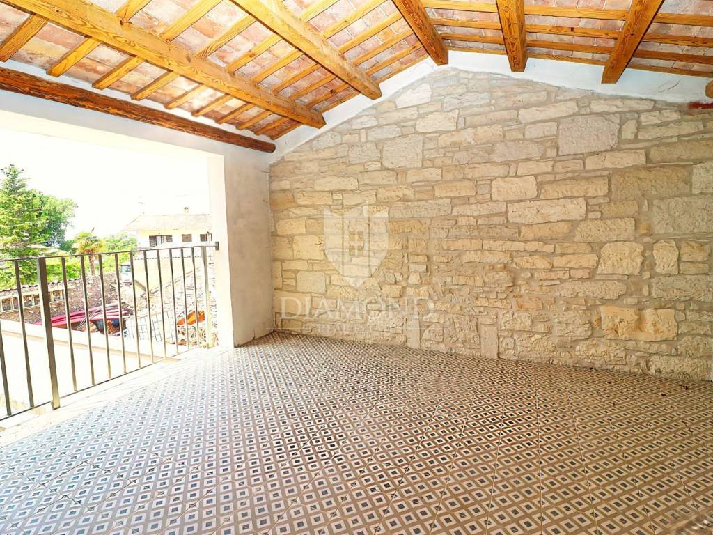 Just 9 km from Poreč and the most beautiful beaches, an authentic Istrian stone house is for sale, currently being converted into a villa with a pool. The villa spans multiple levels. The basement is designed as a wine room, which the future owner can arrange according to their wishes. The ground floor consists of a living room, kitchen with dining area, and guest toilet. An internal staircase leads to the first floor with two bedrooms, each with its own bathroom, one of which has access to a covered terrace. In the high attic, there are two more bedrooms, each with its own bathroom. An electric fireplace in the living room provides ambiance, and the entire ground floor has underfloor heating powered by a heat pump, with air conditioning for heating and cooling installed in every room. The entire interior is rustically decorated, maintaining a touch of the past. During renovation, attention was paid to every detail, preserving the original stone parts. The garden features a pool and a sauna. The villa is sold partially furnished, with an equipped kitchen, equipped bathrooms, and a guest toilet.