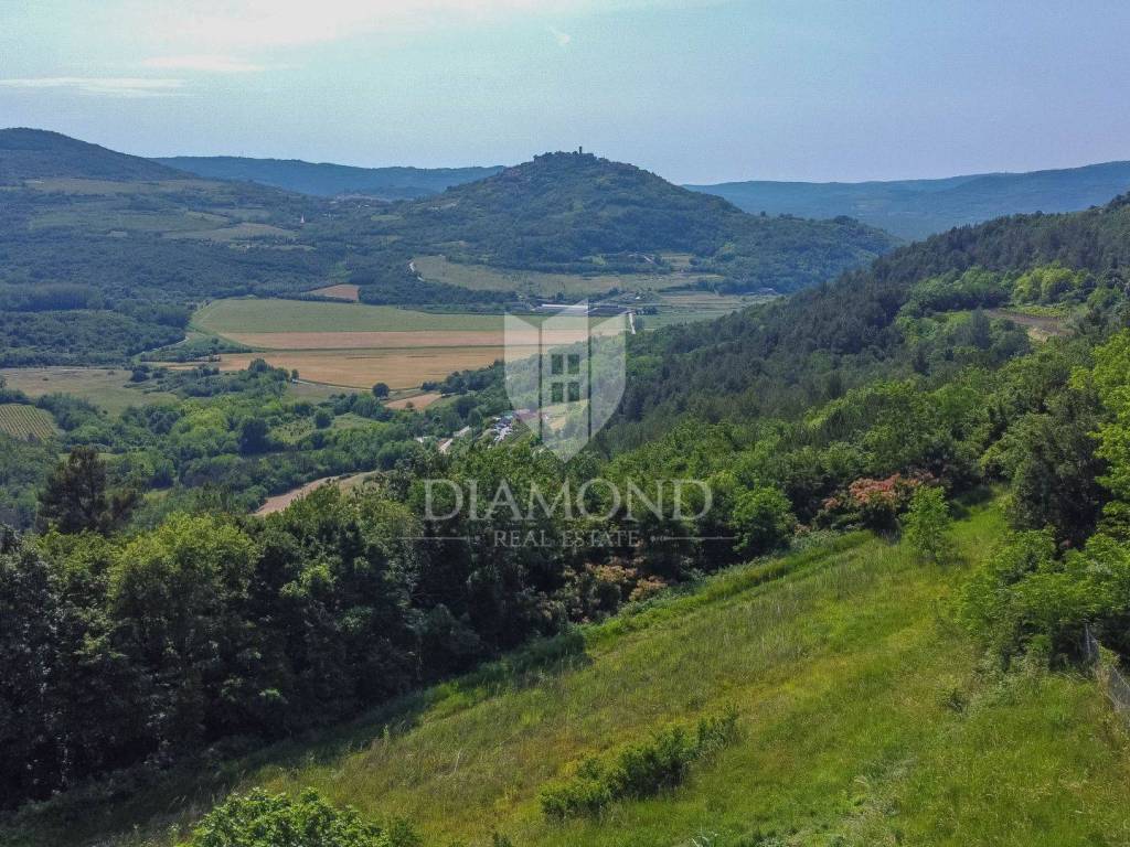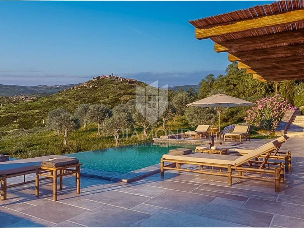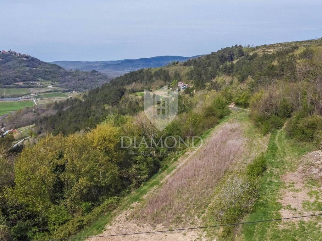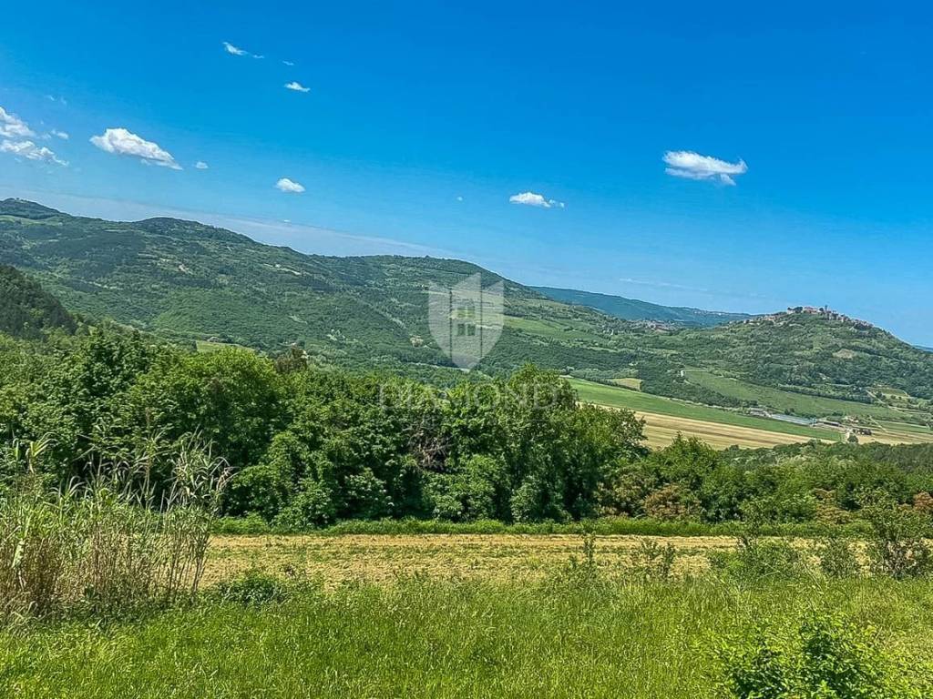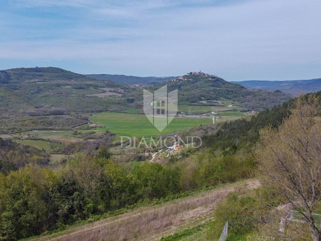 Zemljište se nalazi na rubu građevinske zone i prostire se preko 1800m2. Na zemljištu je predviđena gradnja impozantne kamene vile s bazenom od 250m2 s očaravajućim pogledom na Motovun i okolicu. Vila će se prostirati na zemljištu od preko 700m2 te će se sastoji od 1 spavaće sobe sa vlastitom kupaonicom u prizemlju, prostranog dnevnog boravka, kuhinje i blagovaonice s izlazom na natkrivenu terasu. Unutarnjim stepenište se dolazi na kat gdje će biti smještene 3 konforne spavaće sobe svaka sa svojom kupaonom. Iz dvije spavaće sobe se izazi na terasu s koje se pruža spektakularan pogled na okoliš, Motovun i vlastiti bazen.